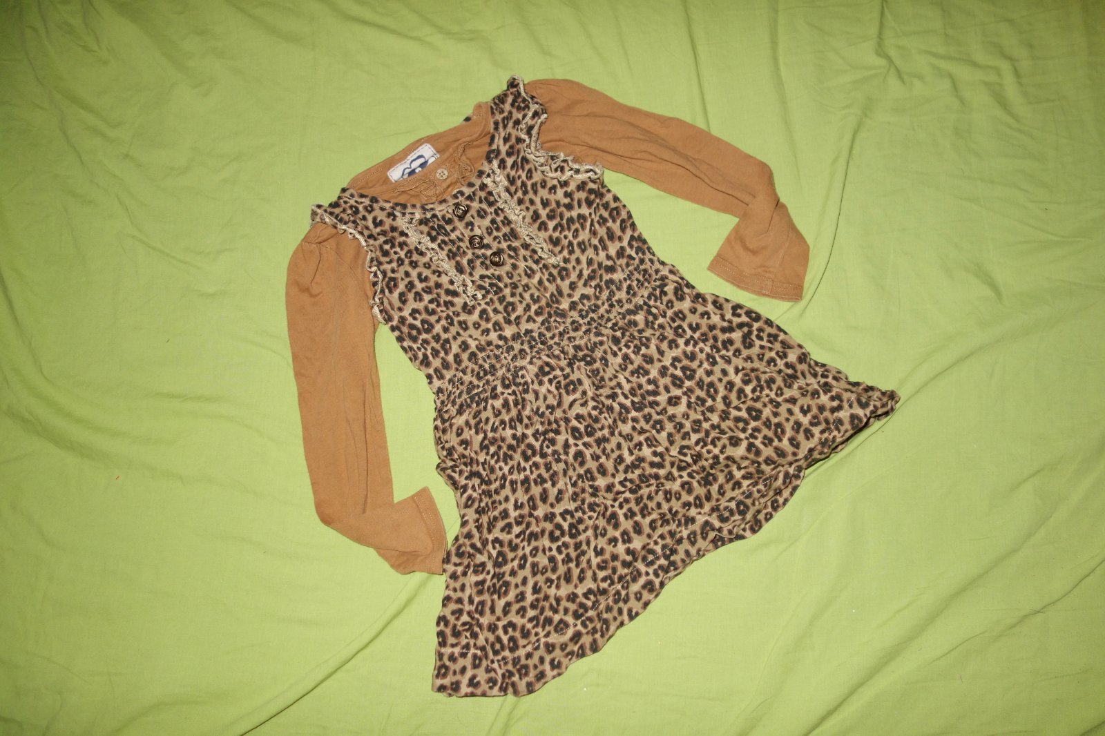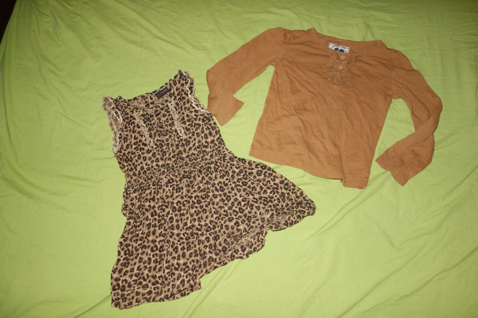 Pekny kompletik tricka a satociek v dobrom nosenom stave (satocky maju malinko vypranu farbu a na pliecku som nasla take zoslabenie- skoro az dierku- vid foto- v skutocnosti to ale uplne zanika vdaka vzoru). Satocky su cislo 92 a tricko 98, ale nosili sme spolu.