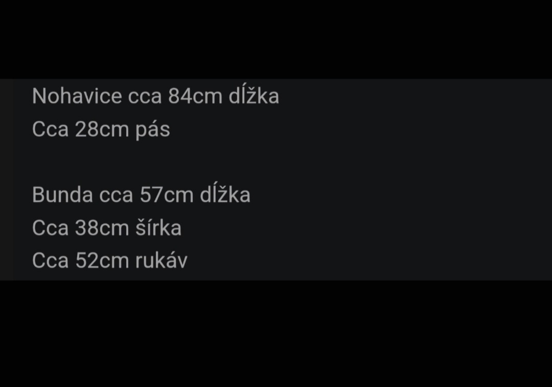 Predam supravu v dobrom stave.Vel.pisana S.Nohavice dlzka 94cm,pas 2x35cm je v pase guma.Mikina dlzka 60cm sirka 2x43cm rukav od plecnice 63cm.Material 100%polyester.
