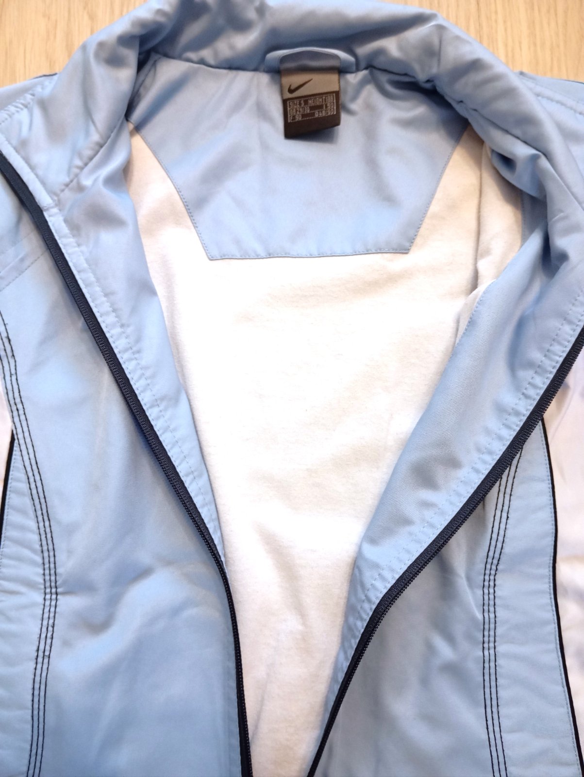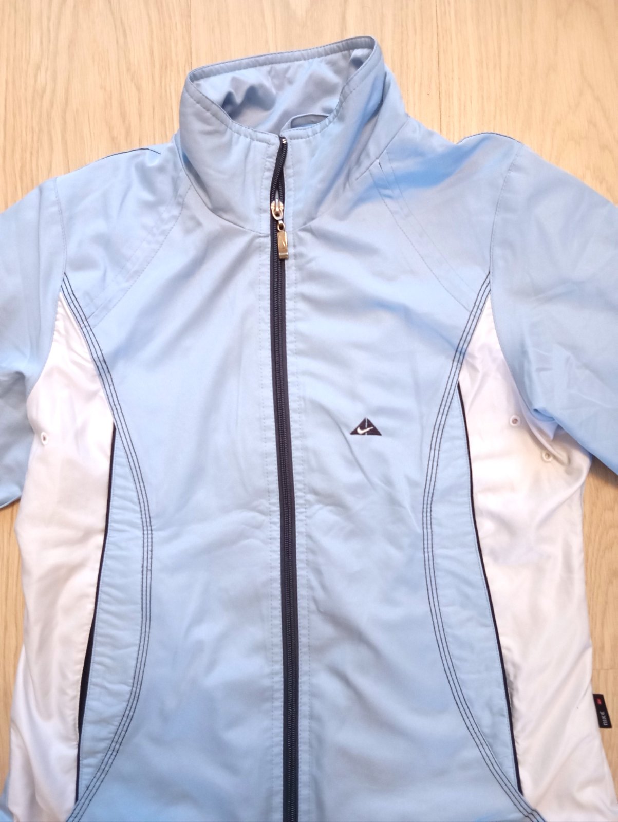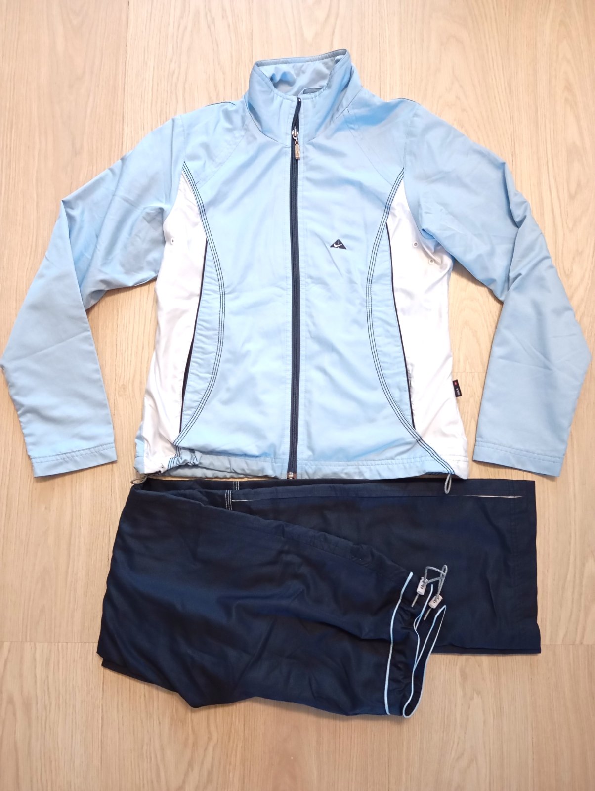 Pekná dámska športová súprava veľkosť S. Vrchný diel je s vačkami bez kapucne, spodný diel rovného strihu, v páse sa dá regulovať. Vnútro je podšité.