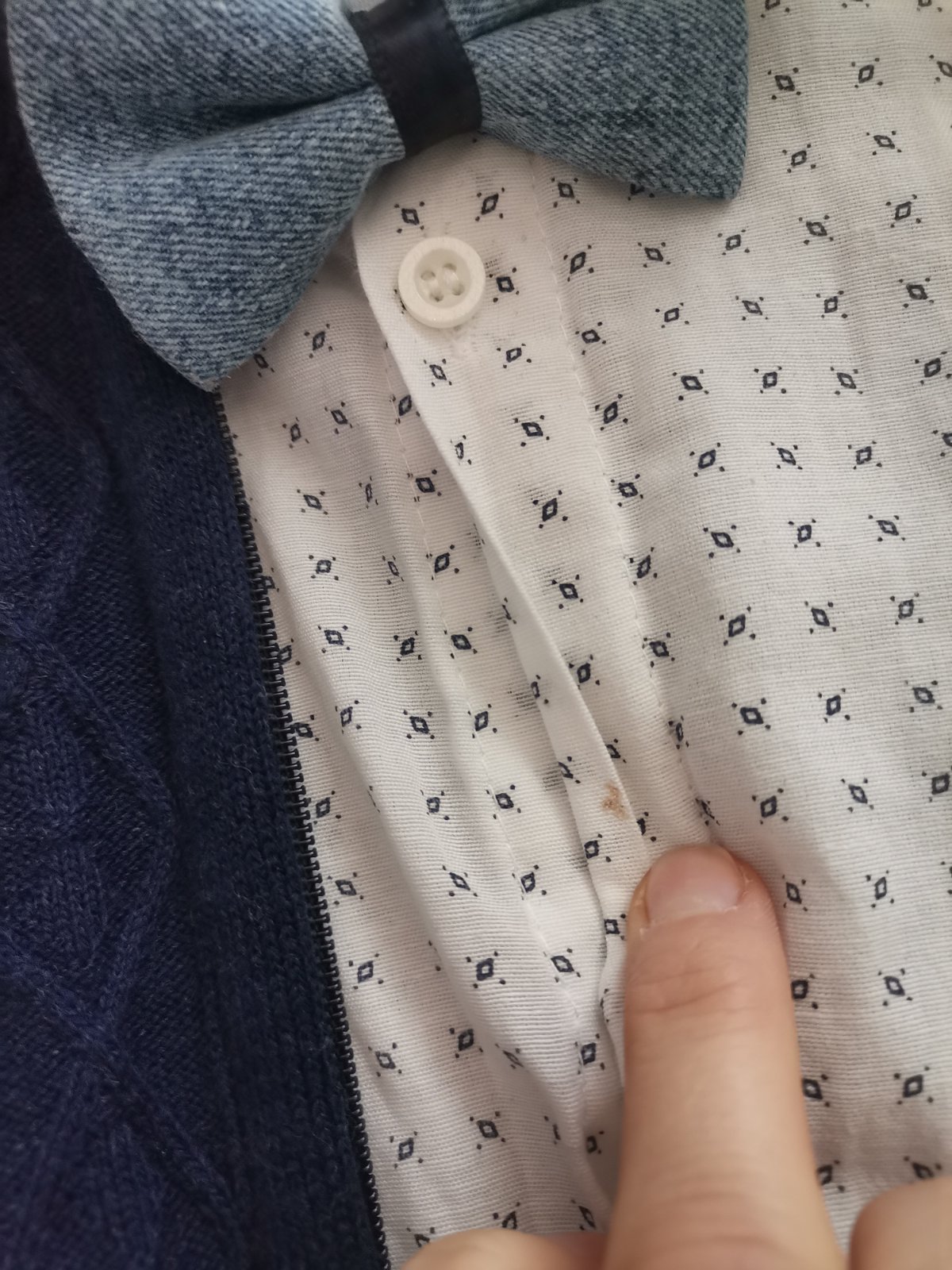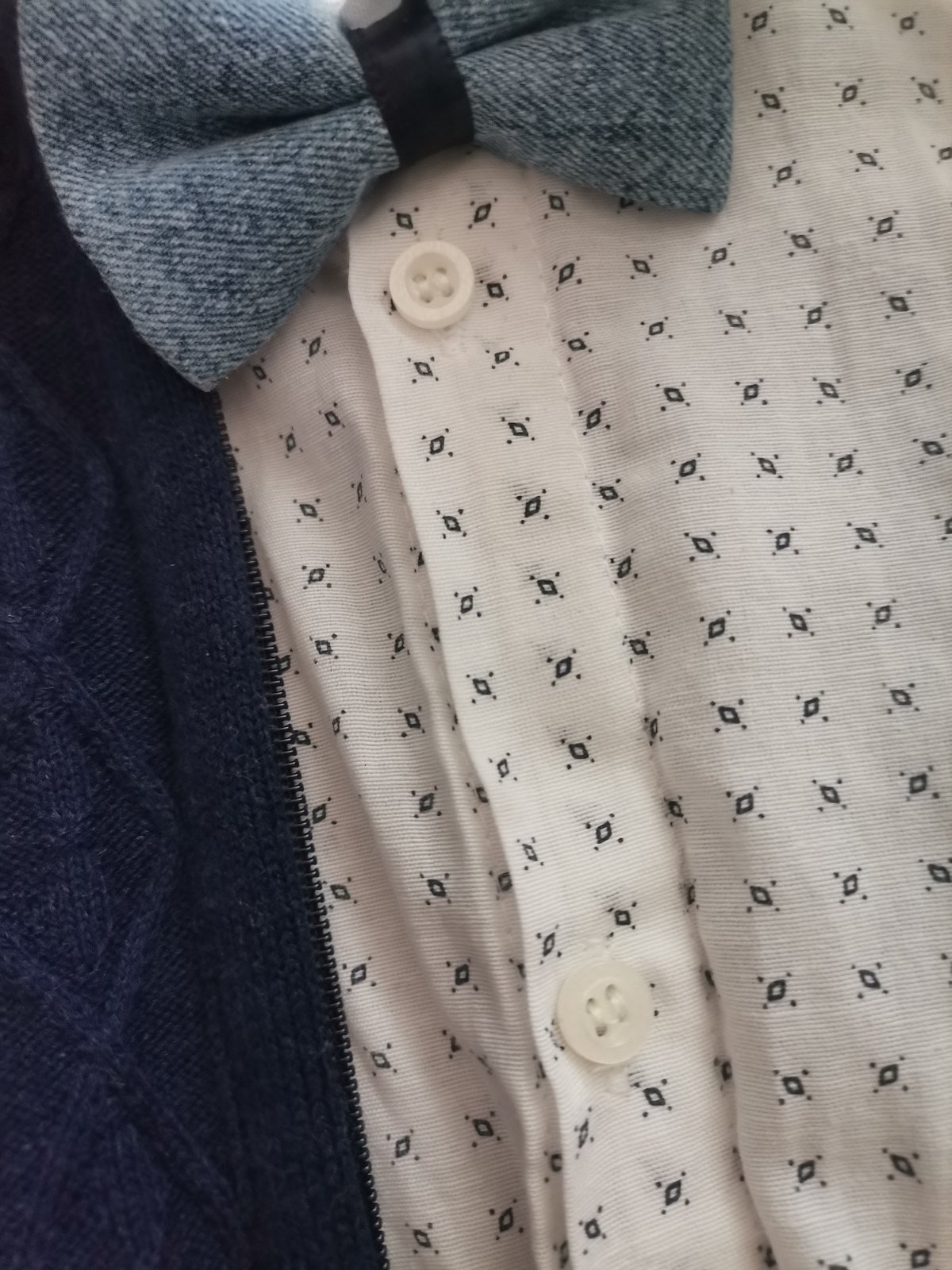 Rifle, košieľka, motýlik, svetrík.