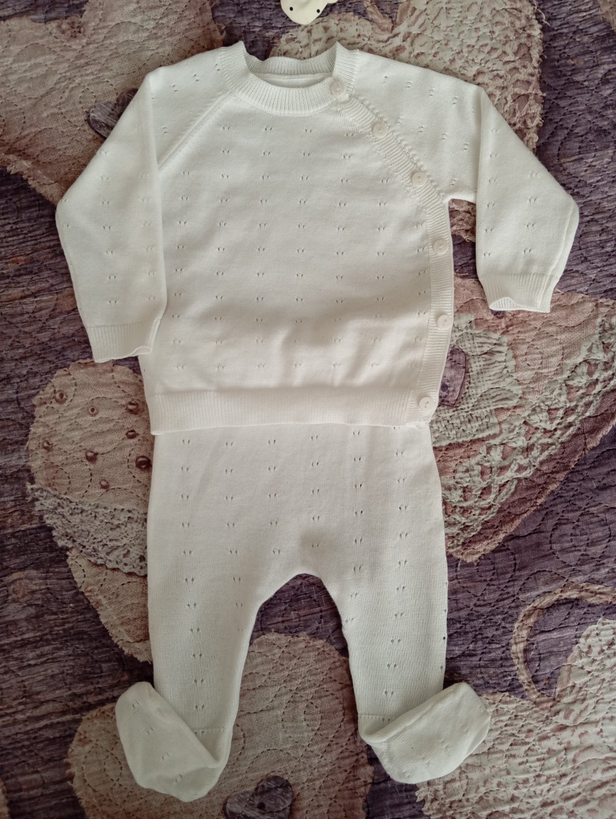 Krásny bavlnený set, jemne vzorovany. Raz oblečený na krst. Výborný materiál, jemný na dotyk. Veľkosť 3-6 m. Naša má 5,5 kg a mala pod kompletnom ešte body a pančušky a sedelo to perfektne.