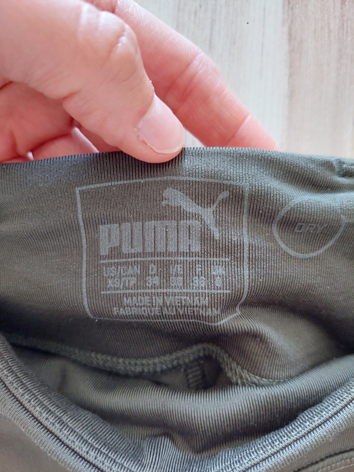Predám olivové/khaki/tmavozelené legíny značky Puma. Veľkosť XS. Nosené. Znak puma je trochu vyblednutý (viď foto). Plus ako súpravu croptop, ten ale nie je značky Puma. Croptop je obojstranný, dá sa nosiť aj ako čierny. Veľkosť XS/S.