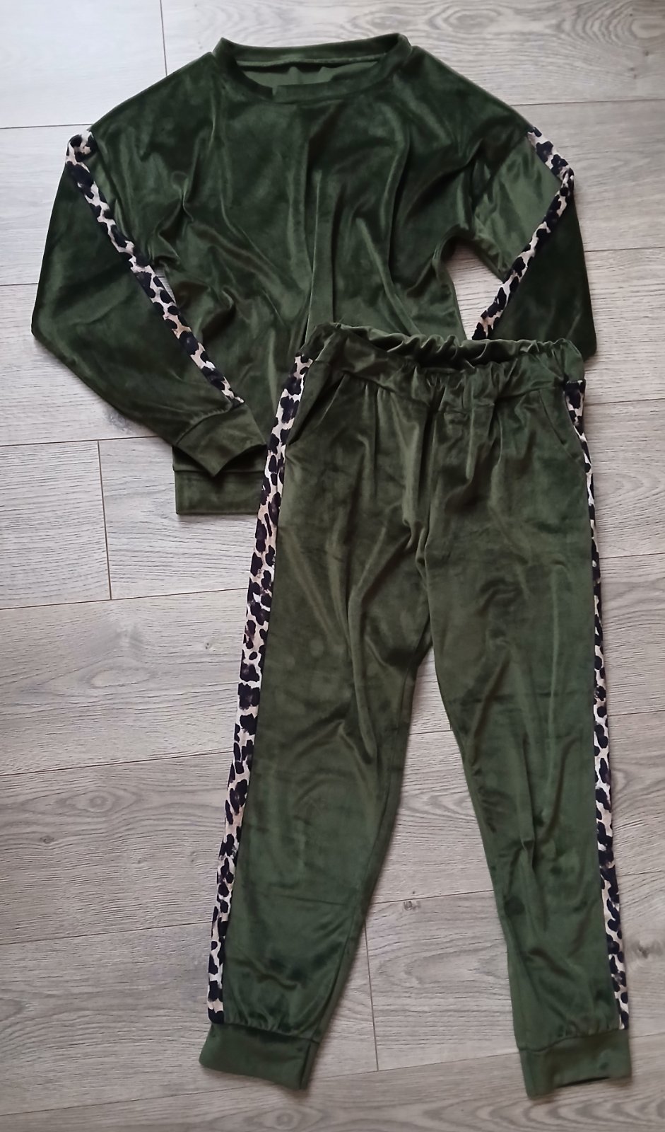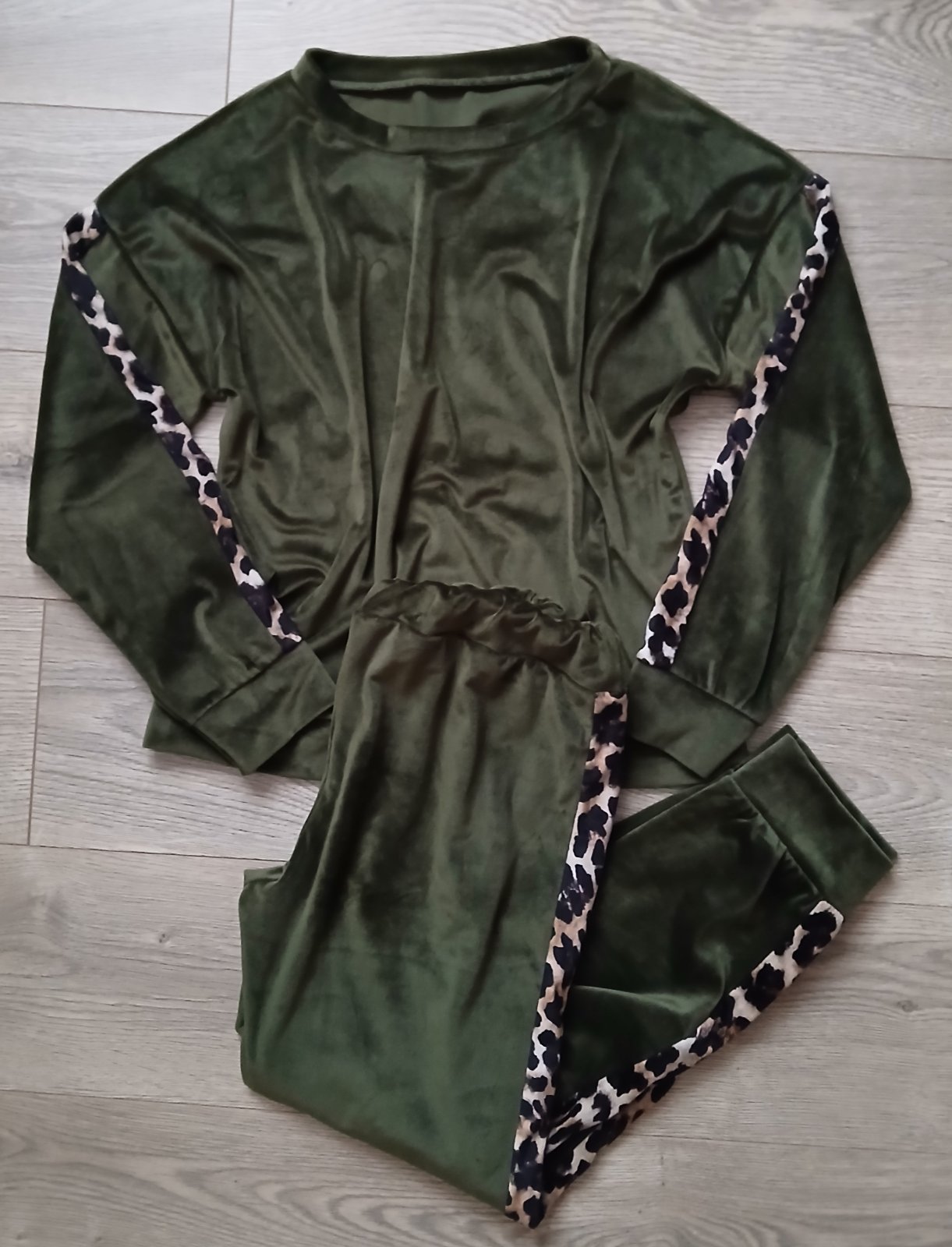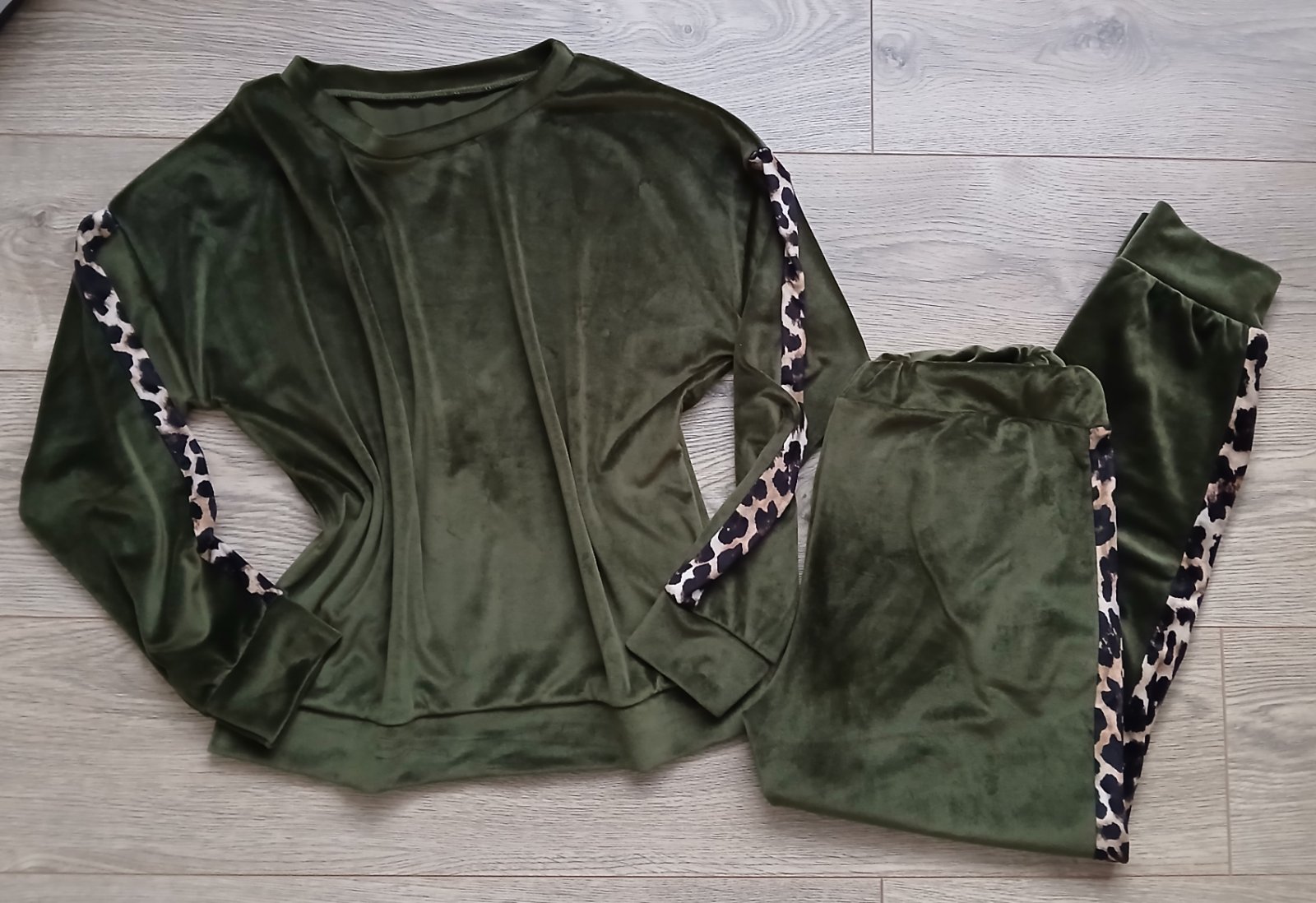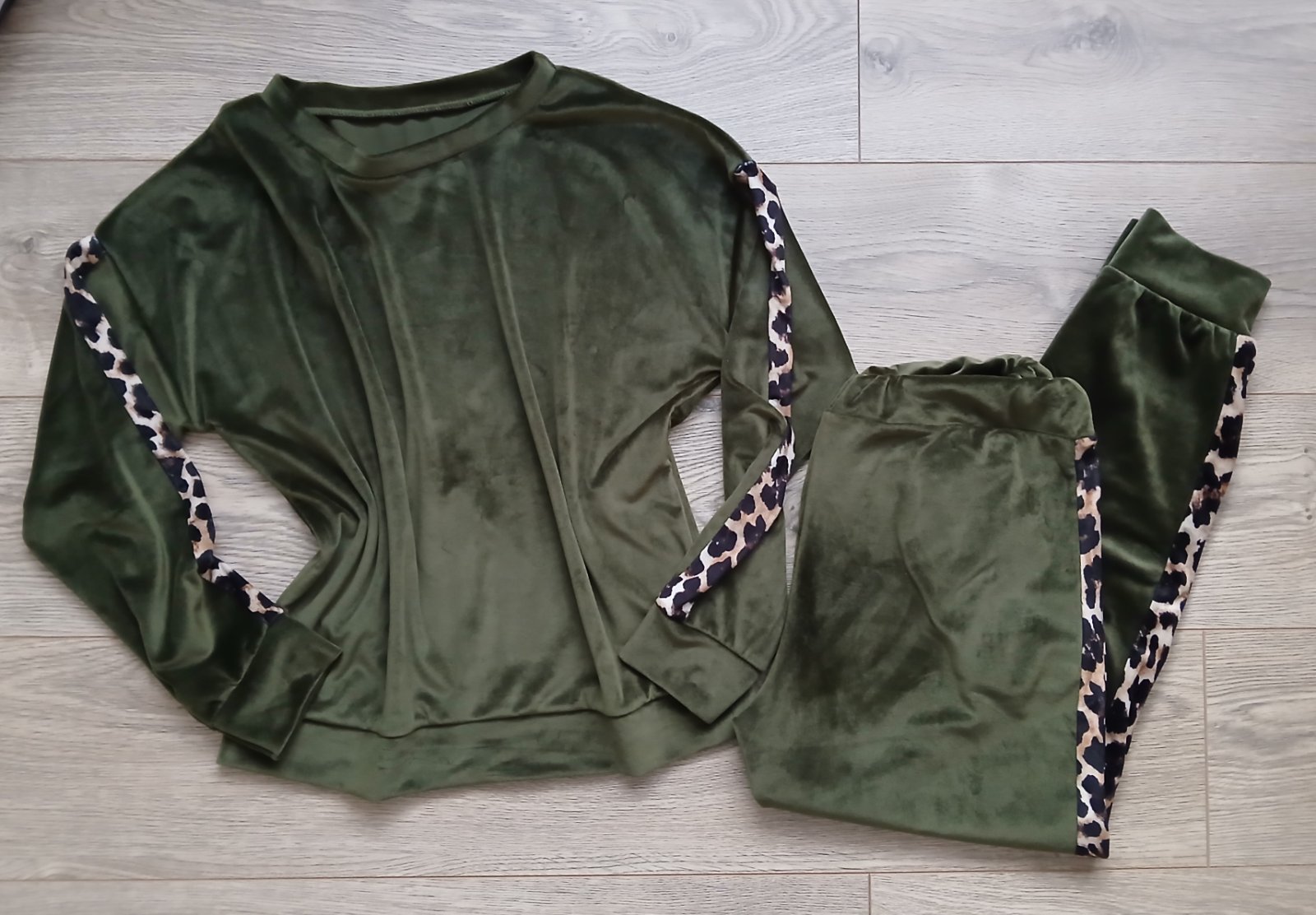 Dámska khaki zamatová súprava s leopardím vzorom na manžetách, bokoch nohavíc a na kapucni. Vrchná časť zdobená leopardím vzorom a nápisom Paris s kamienkami. Elastická. Nohavice pás na gumu. Paten...