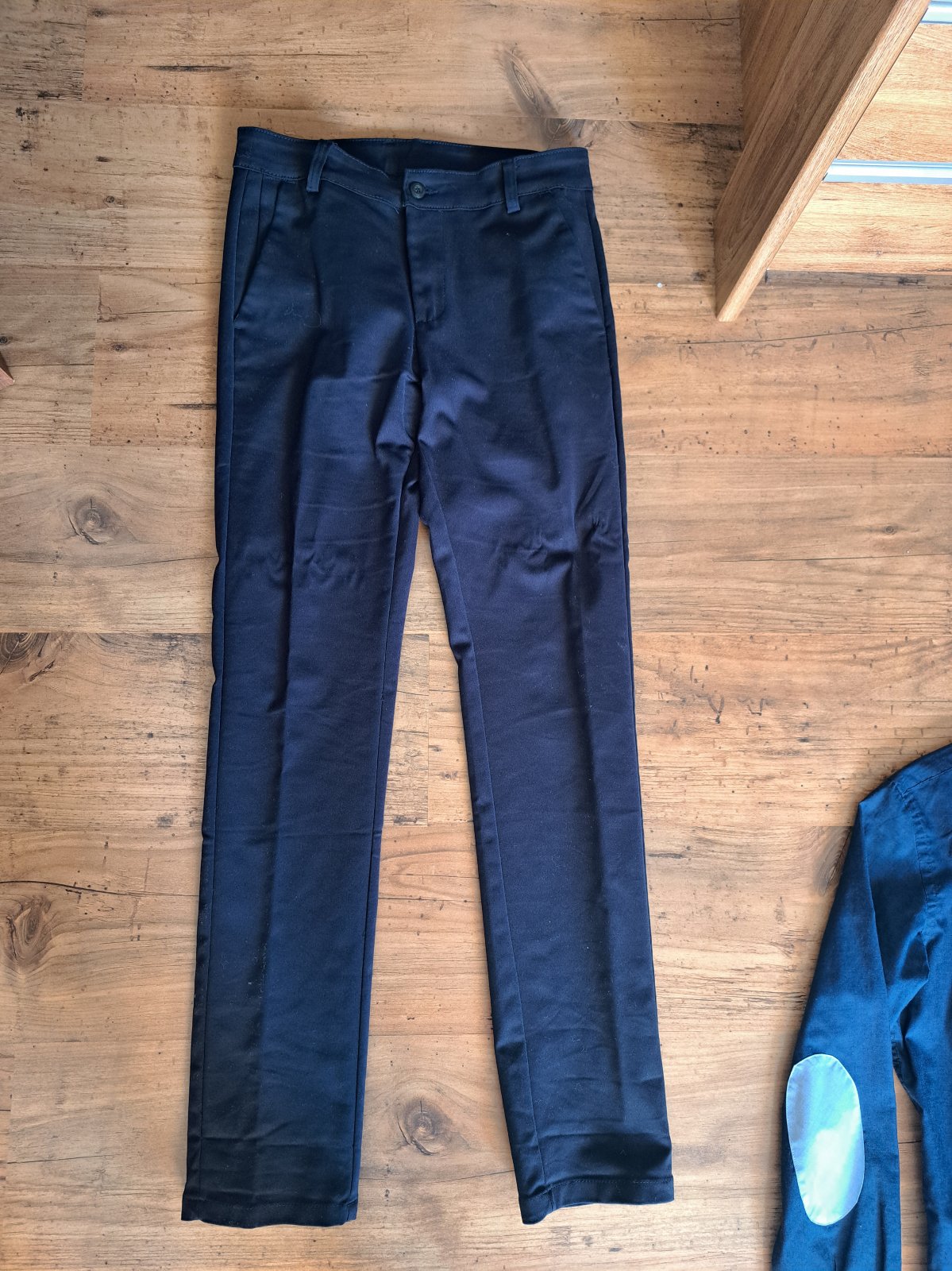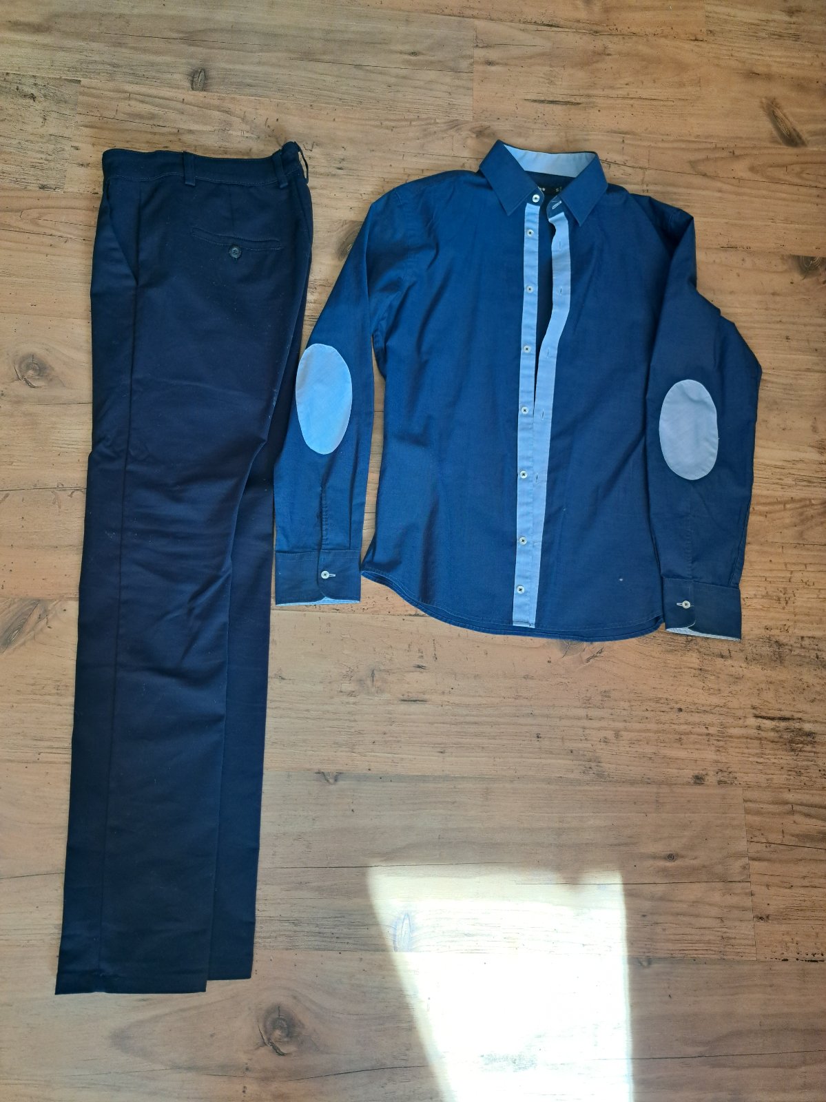 Predam tmavomodre spoločenske nohavice -rozmery pas 38 cmx2,dlžka 104 cm,košela dlzka 64 cm,pod pazuchami širka 45 cmx2,rukav od pleca 62 cm..super stav