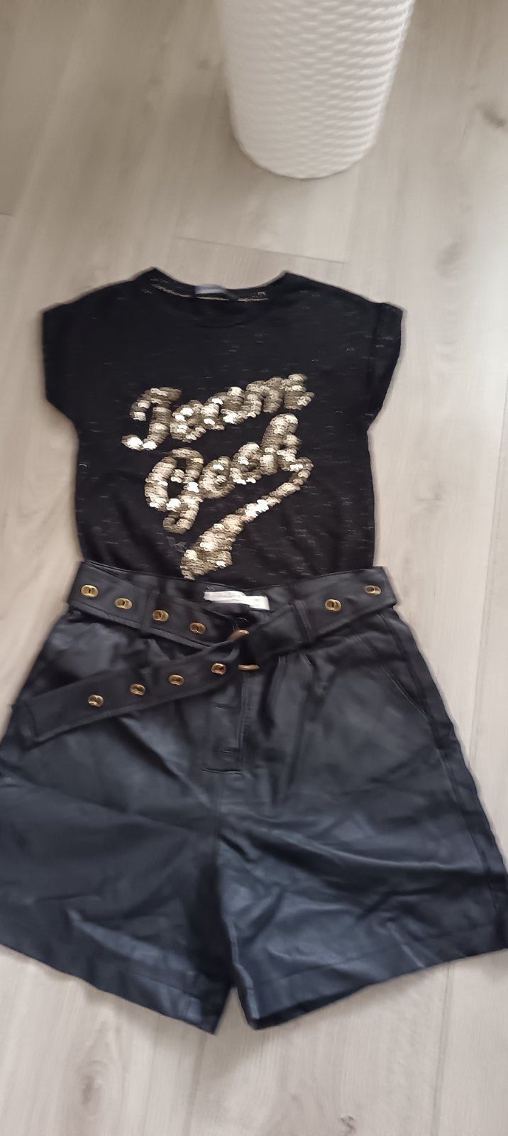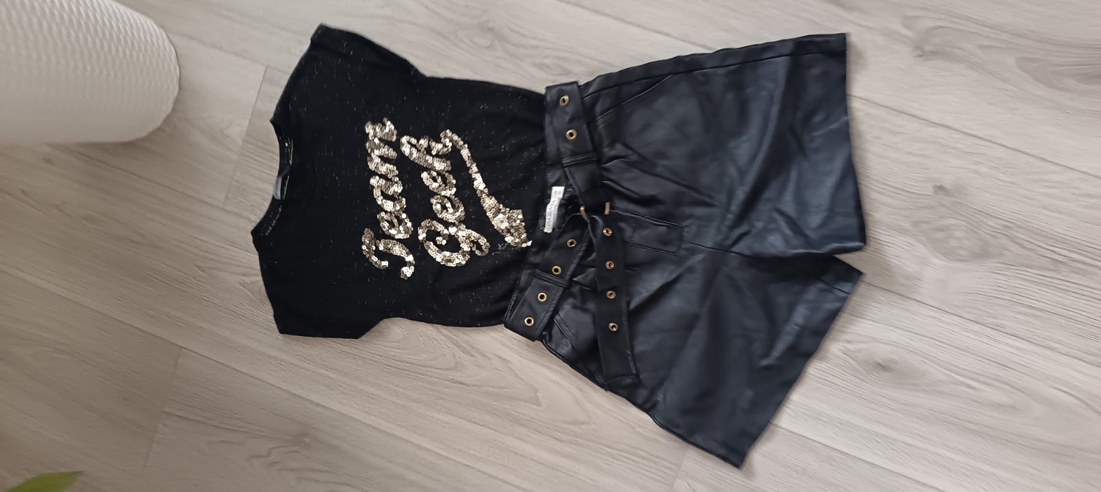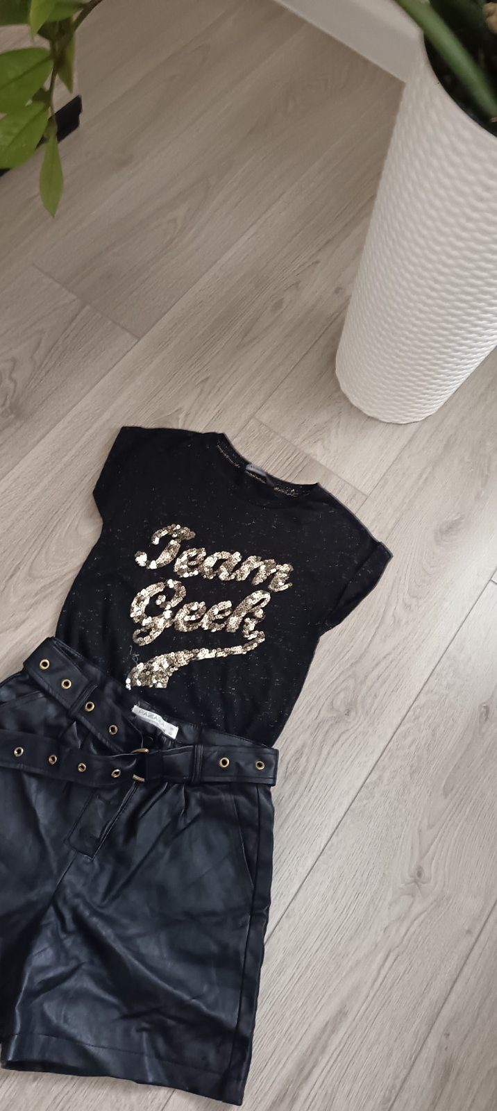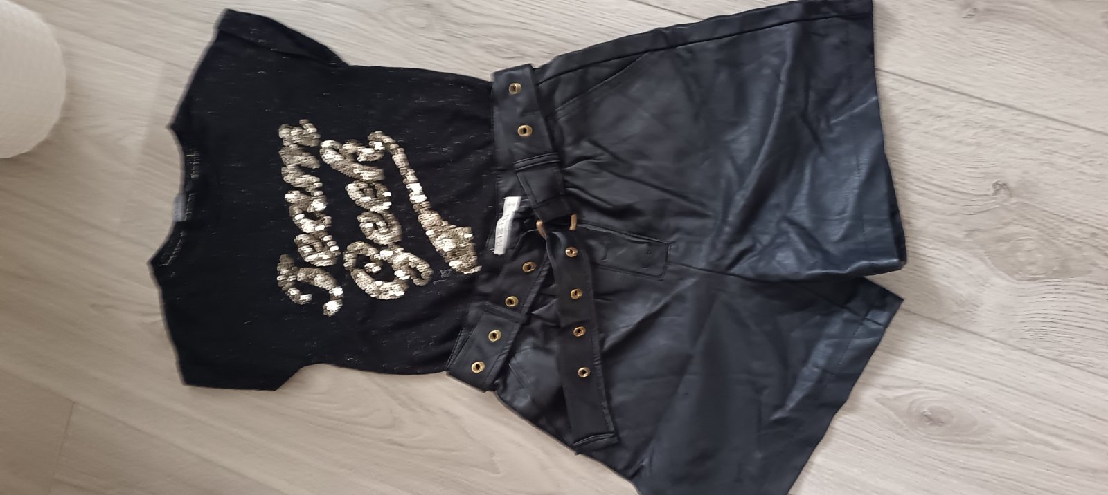 Predám krásny kompletík: tričko s flitrami + koženkové kraťasy ✨