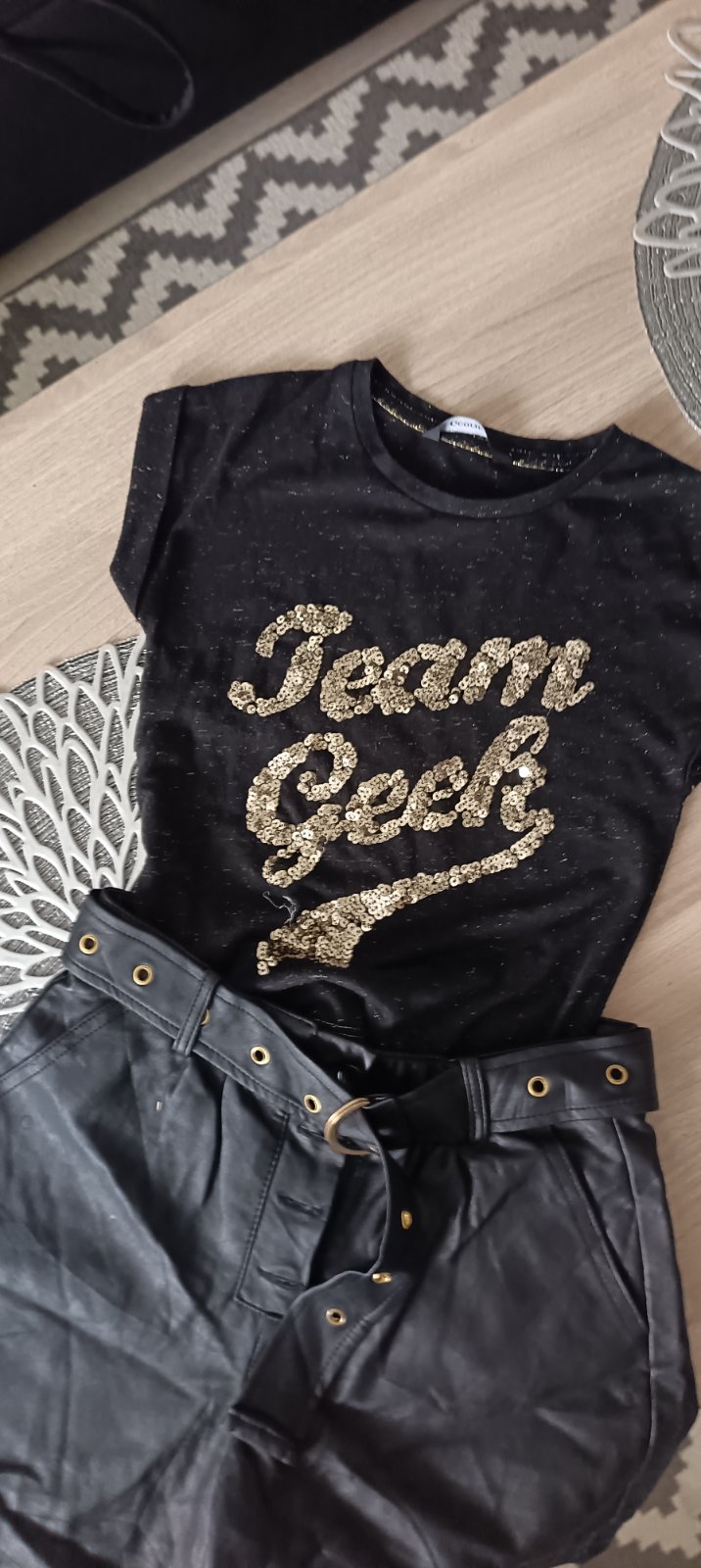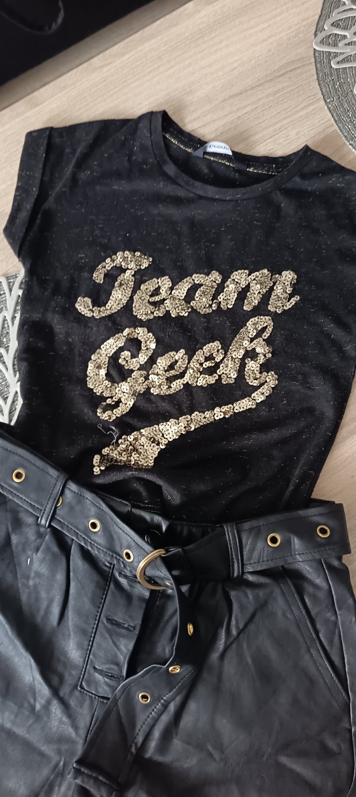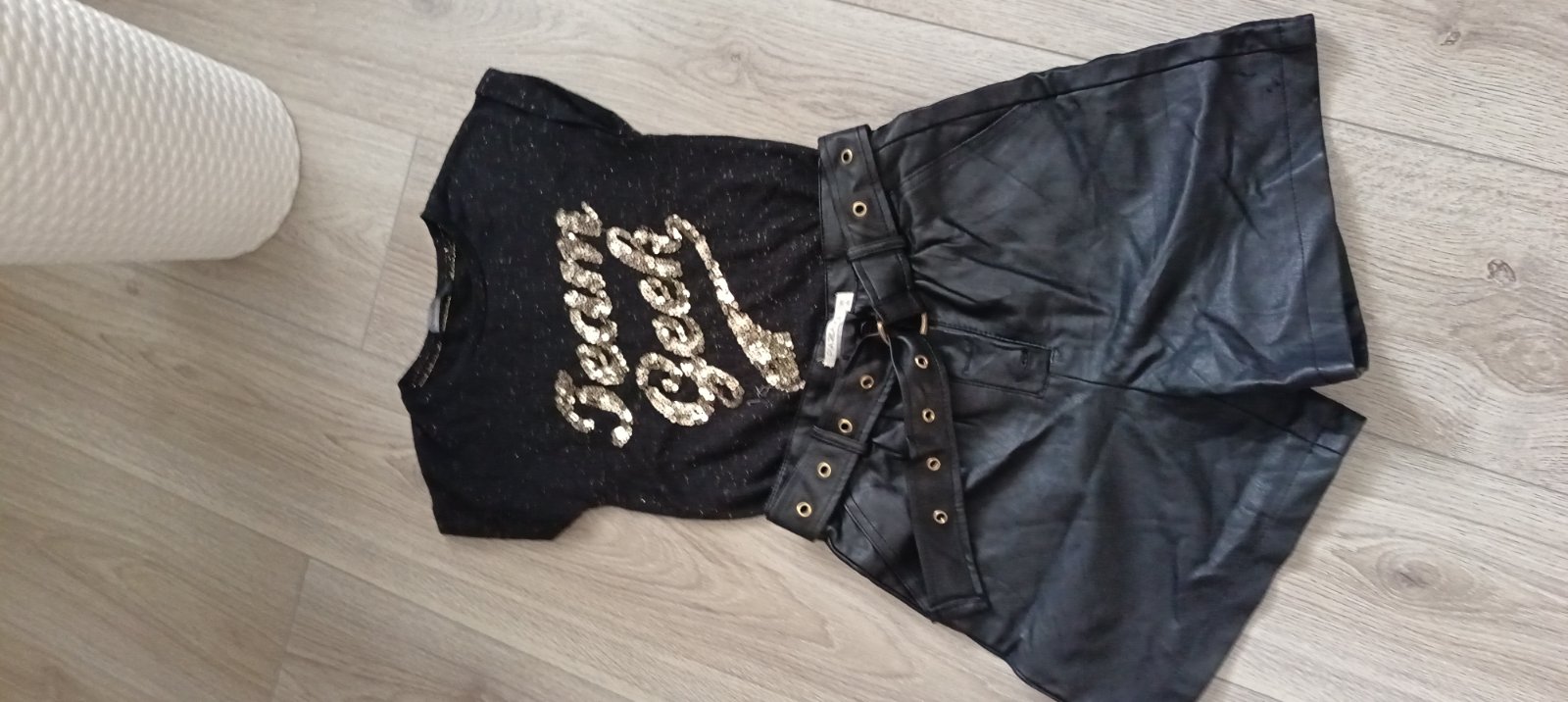 Predám krásny kompletík: tričko s flitrami + koženkové kraťasy ✨