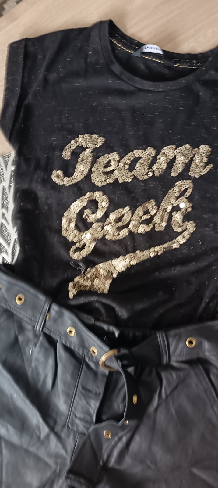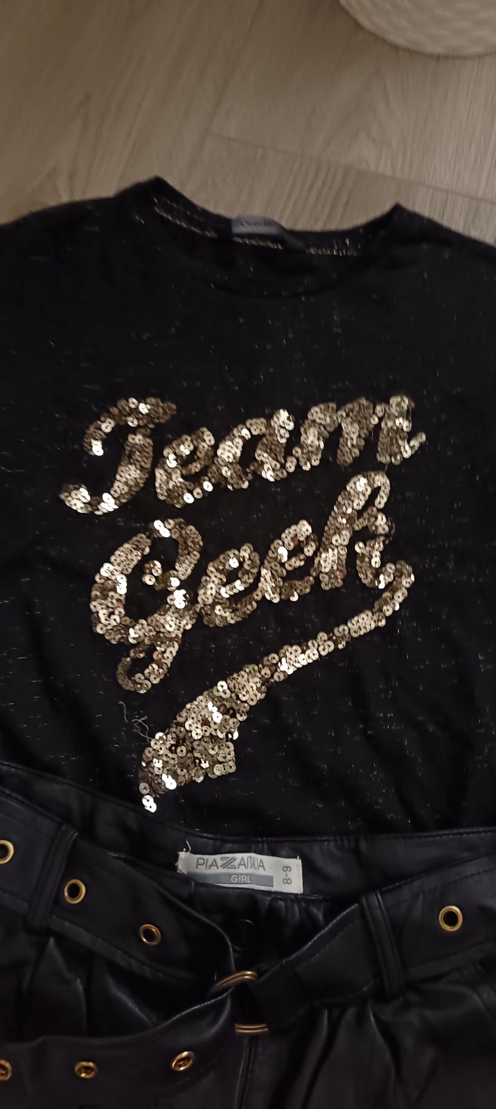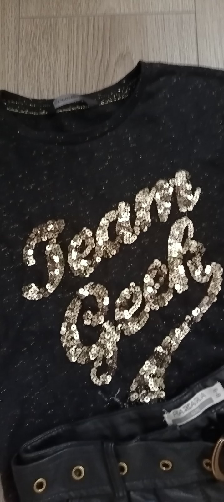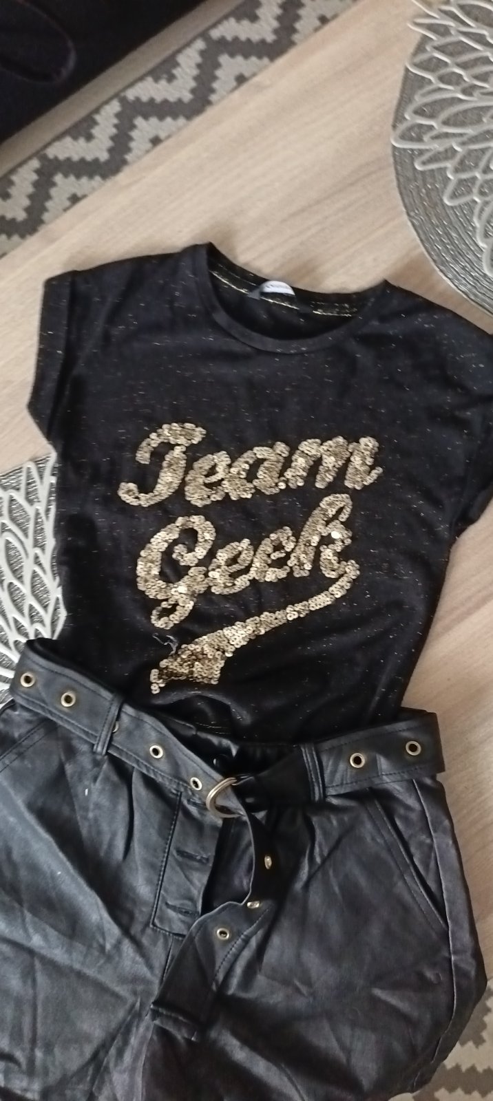 Predám krásny kompletík: tričko s flitrami + koženkové kraťasy ✨