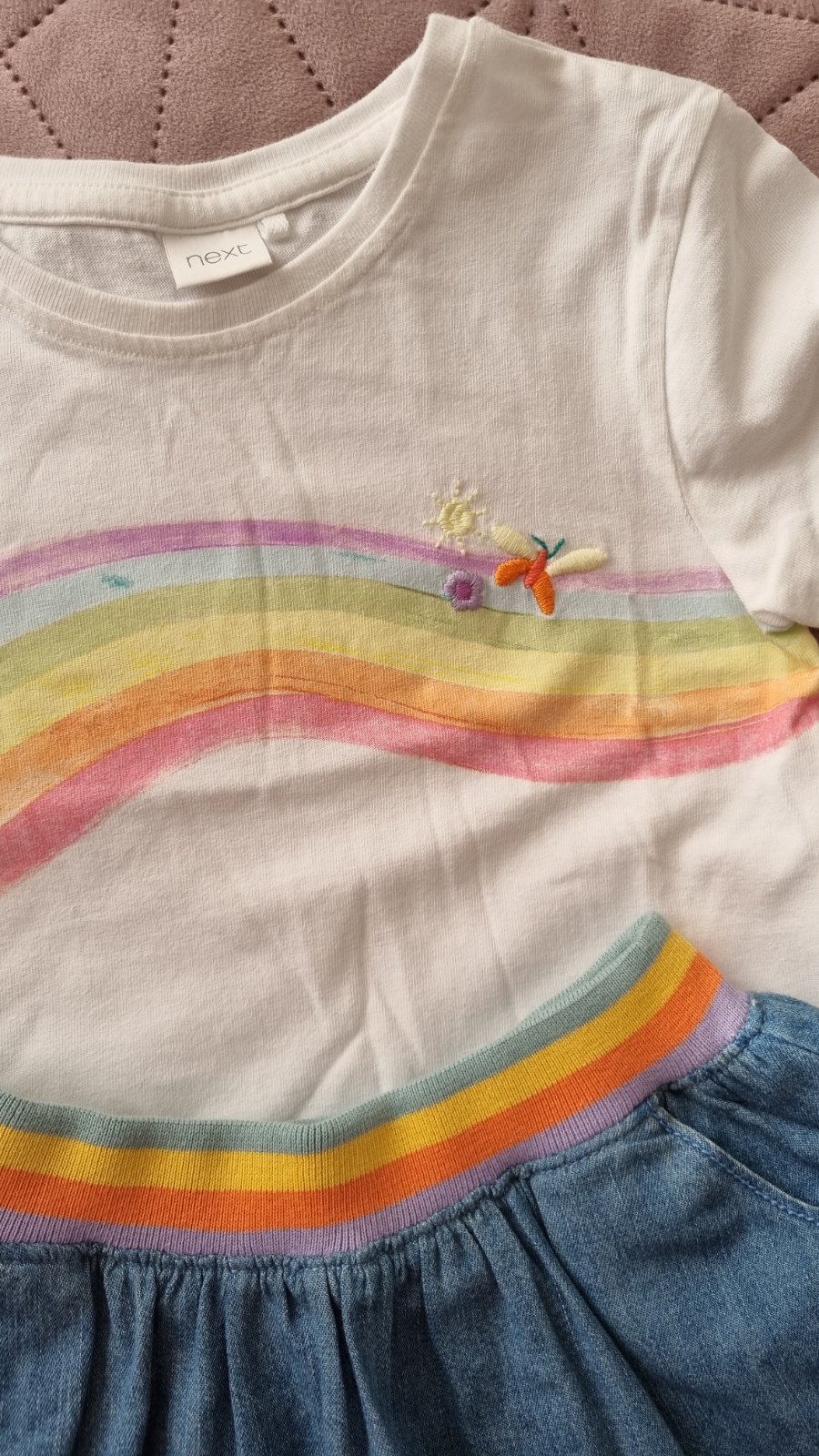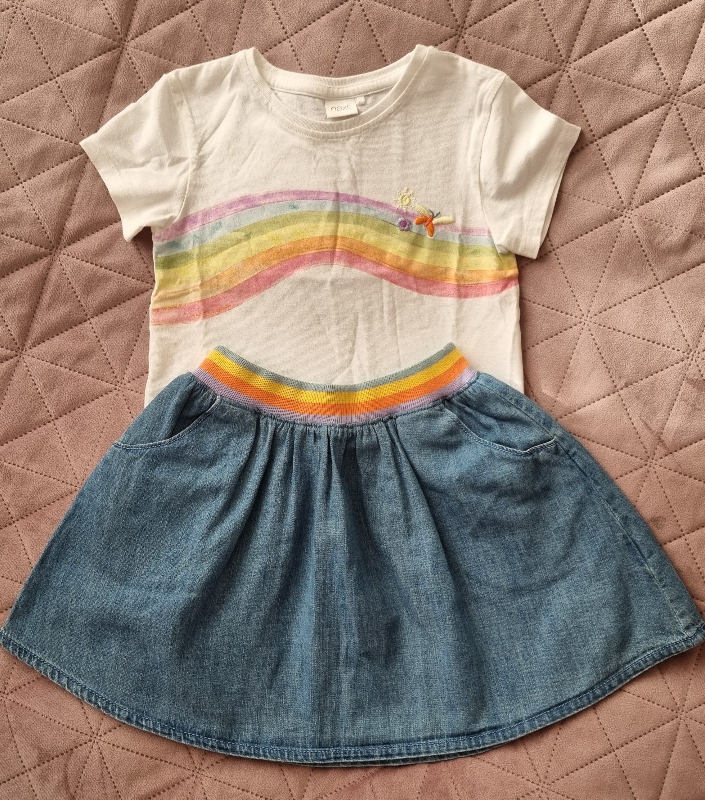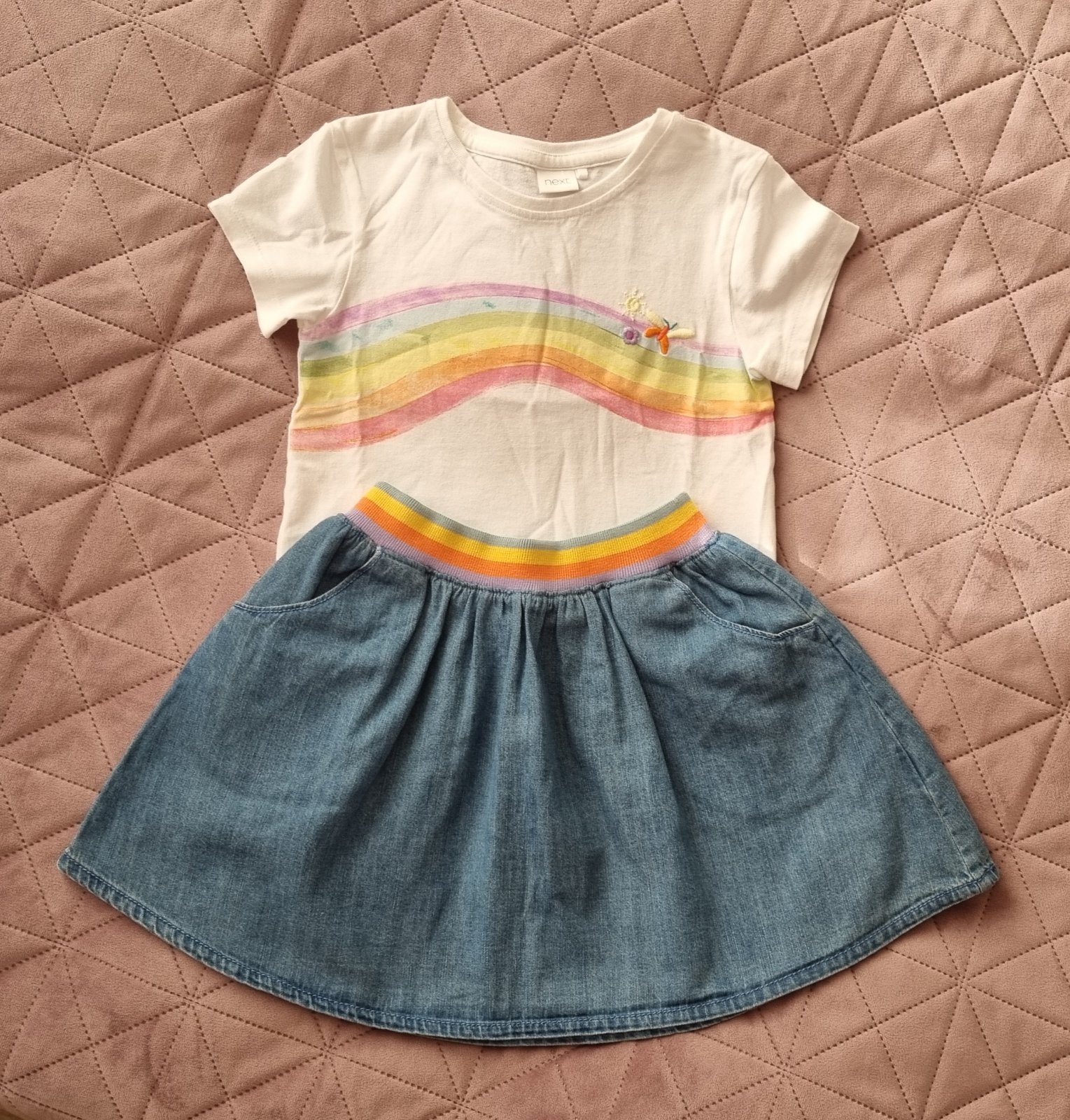 Predám túto krásnu súpravu sukne a trička značky Next vo veľkosti 104cm, vhodnú pre 3-4 ročné dievčatko. Je veľmi kvalitná, vo výbornom stave, bez poškodenia a škvŕn, ako nová. Nosena ojedinele. Pôvodná cena bola 25€