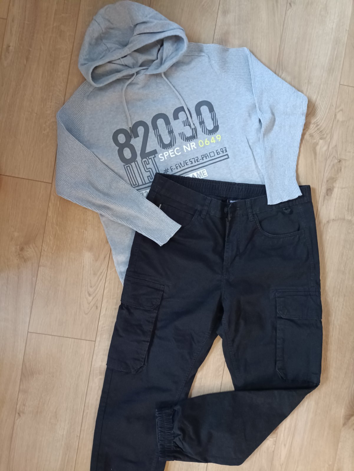 Čierne kapsáče Croop, dĺžka 103, zapínanie na gombík, vzadu gumička, pás v kľude 2x46, naspodku gumička, bez poškodenia, tenká svetlosivá mikina Urbán districk Angelo Litrico, veľkosť L, dĺžka 66 šírka 59 rukáv od krku 69, bežné známky nosenia a prania, minižmolčeky, cena3€+pošta,nohavice 10€+pošta, pri kúpe spolu 11€+ pošta