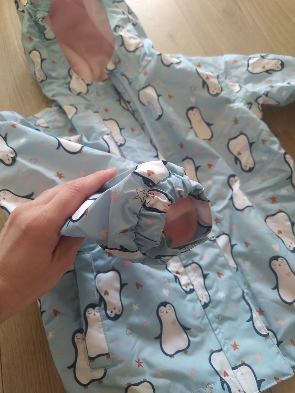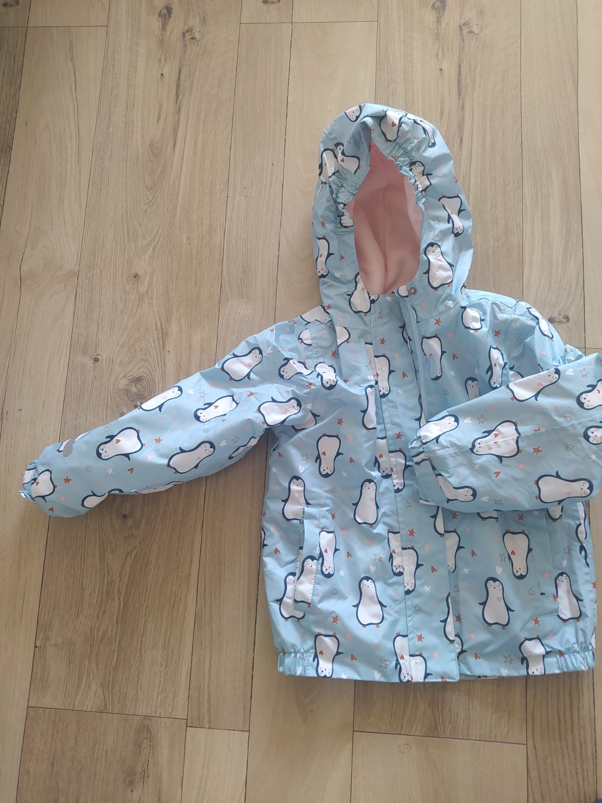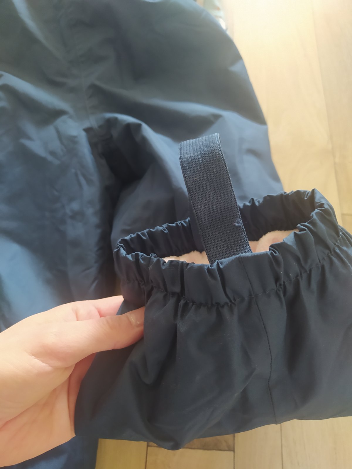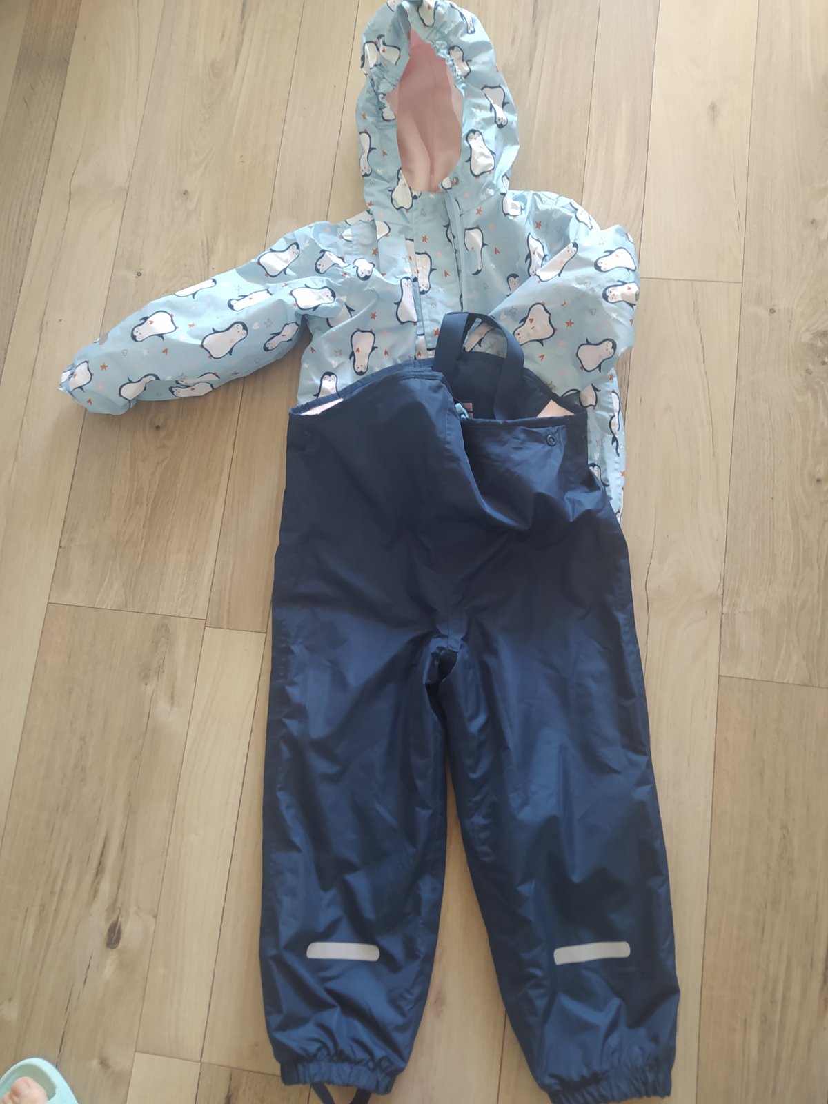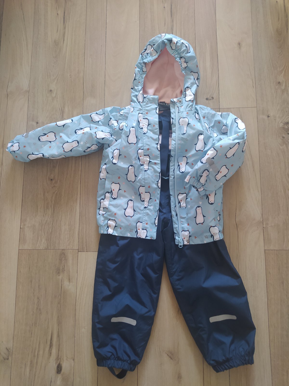 Krásny set nohavice nosené viac, bez poškodení jediná chybička zatiahnutá gumička na trakách nemá vplyv na nosenie, bunda nosená minimálne. Vetrovka dĺžka rukáva merané od podpazuchou 34cm