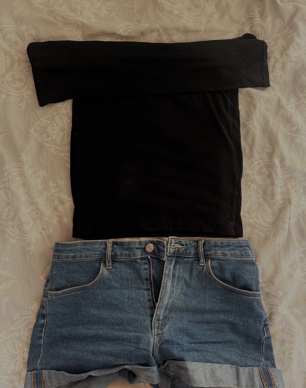 9€ cena obycajnou poštou Krásny set crop top a mini sukňa riflová, farba čierna, super stav nafotené, veľkosť 165/ S-ko, bol to môj obľúbený outfit krásne urobí postavu