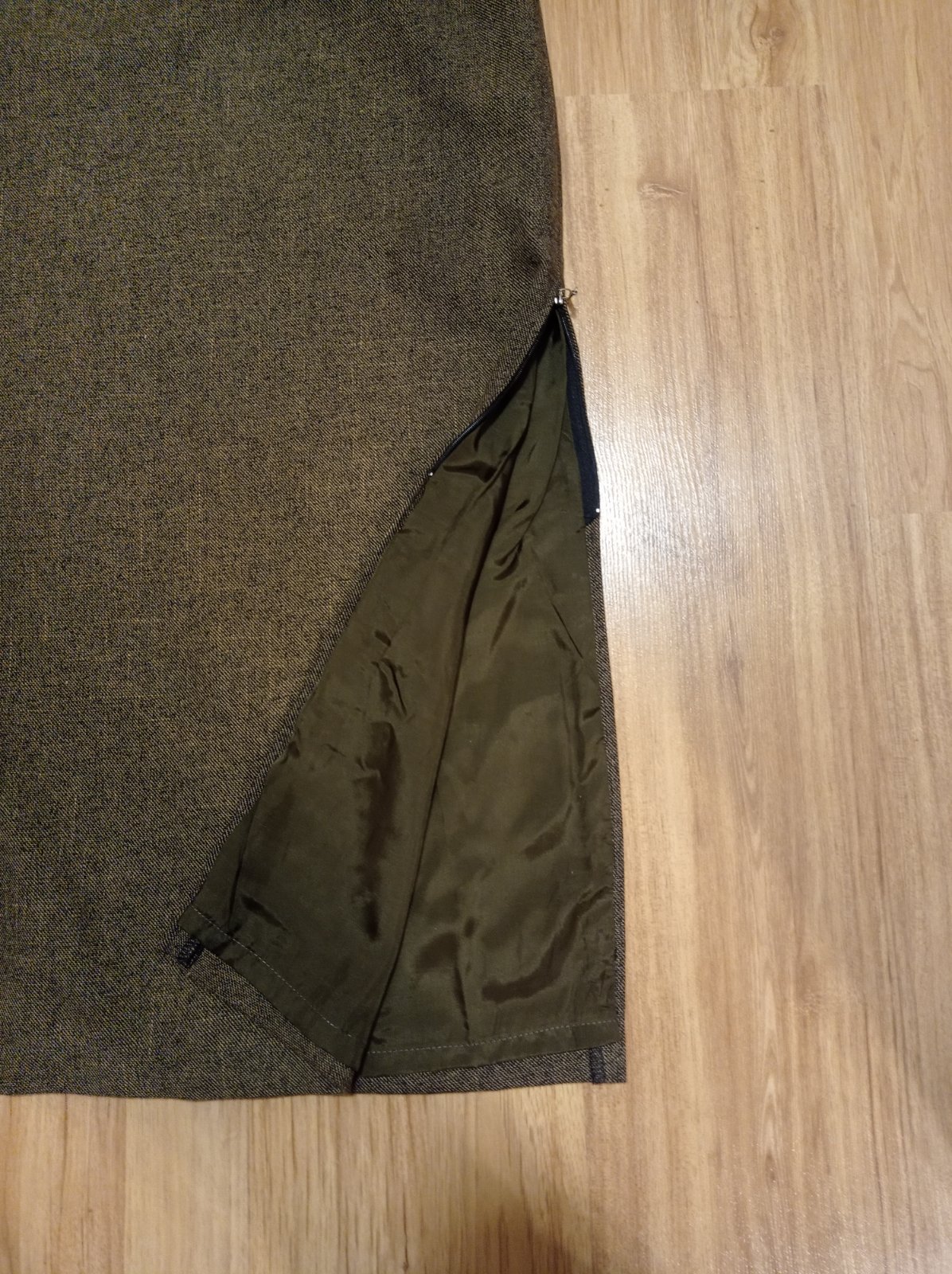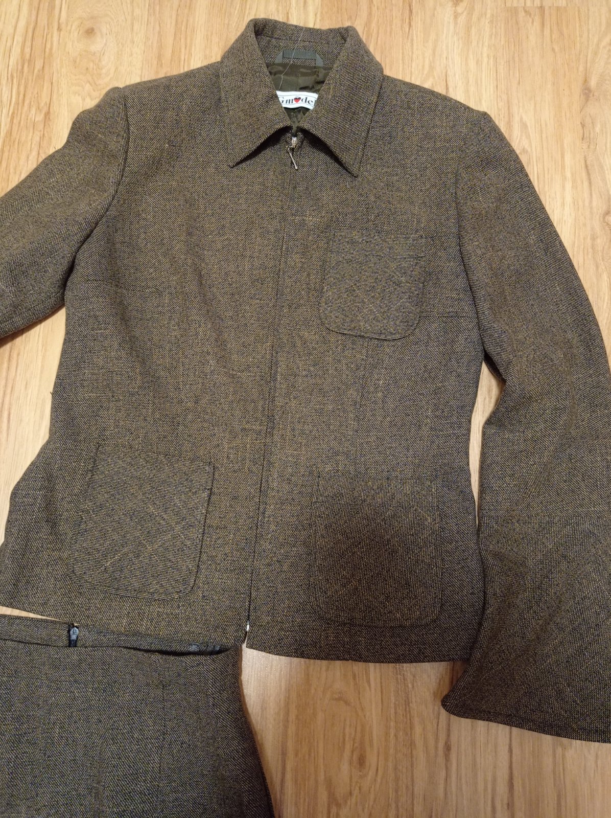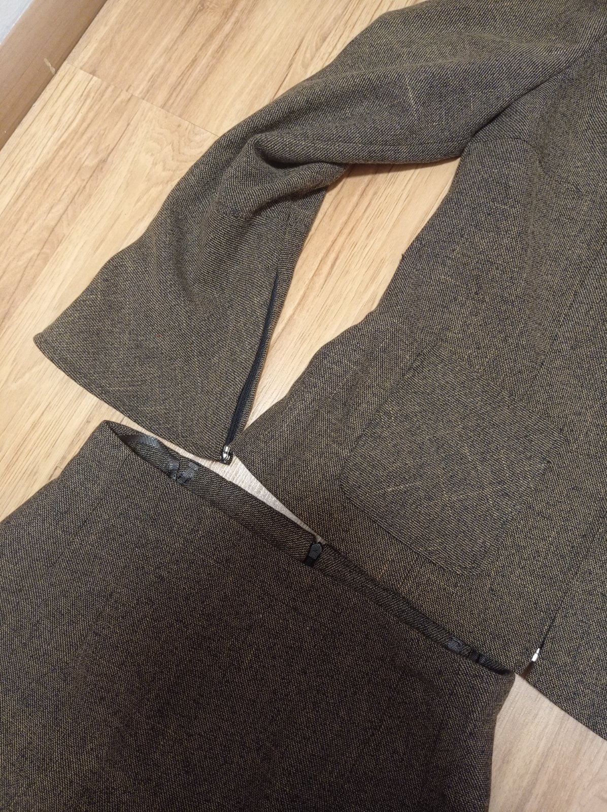 Hnedy suknovy kostym, par x obleceny, bez poskodeni. Podsity. Na rukavoch aj na sukni su zipsy. Velmi pekne sedi. Sukna dlha. Dlzka:92, pas: vzadu zips.35 cm, boky: 47. Sako: dlzka:57,5 cm, rukav od krku:69,5 cm. Pas 41,5 cm. Vyrobene na sk.