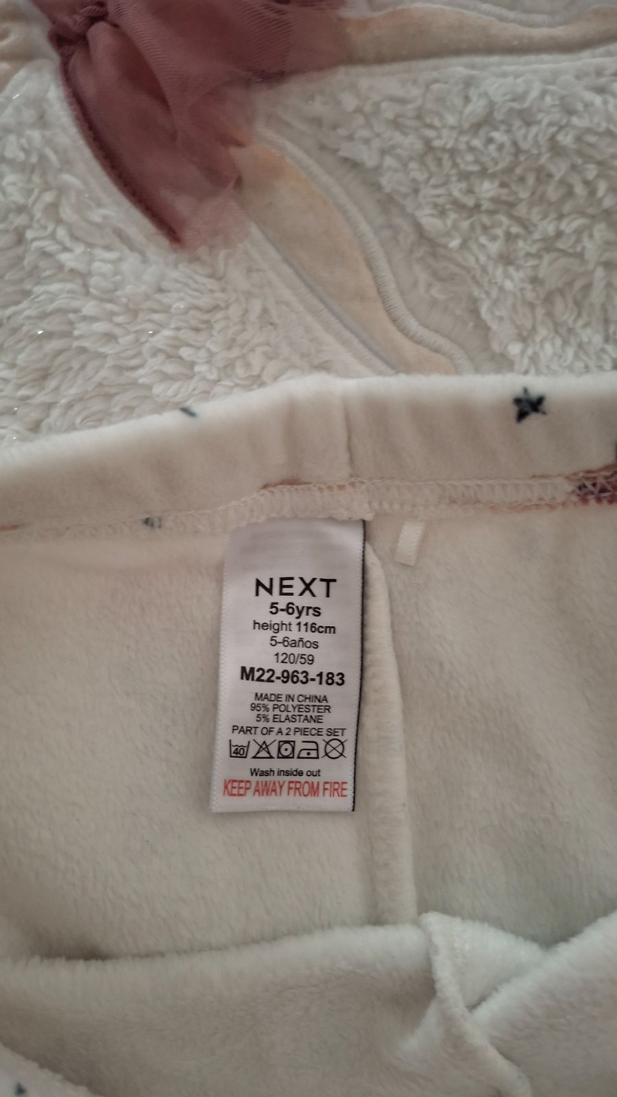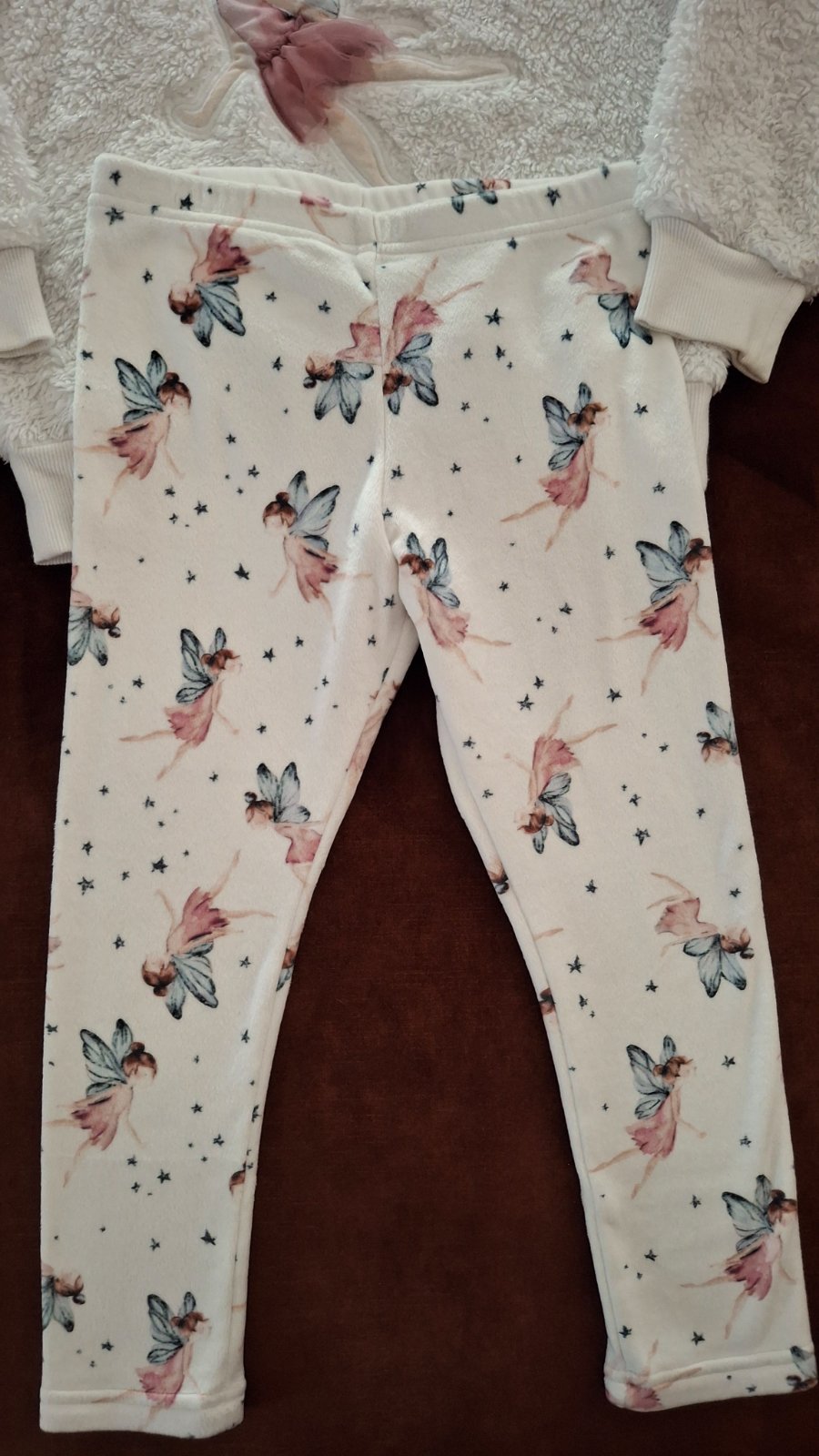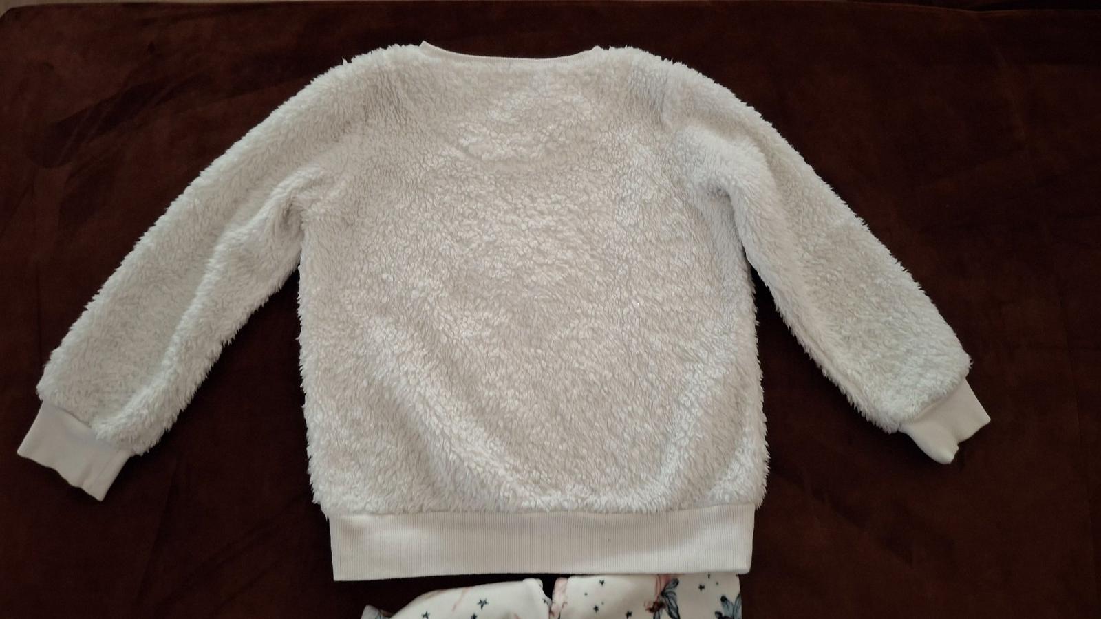 Hrubá súprava na zimu, uvedená ako pyžamo, ale na spanie príliš hrubá. Nosená, ale stále veľmi dobrý stav, až na mini fliačik na konci rukáva (viď foto). Guma v páse elastická, legíny sú slim. Veľmi príjemný a kvalitný materiál, mäkkučký, kto pozná pyžamá z Next, vie posúdiť. Pulóver: Dĺžka 45 cm, šírka 38 cm, rukáv od krku 48 cm. Legíny: Dĺžka 58 cm, dĺžka od pudla 40 cm, šírka 29 cm, pás 25 cm.