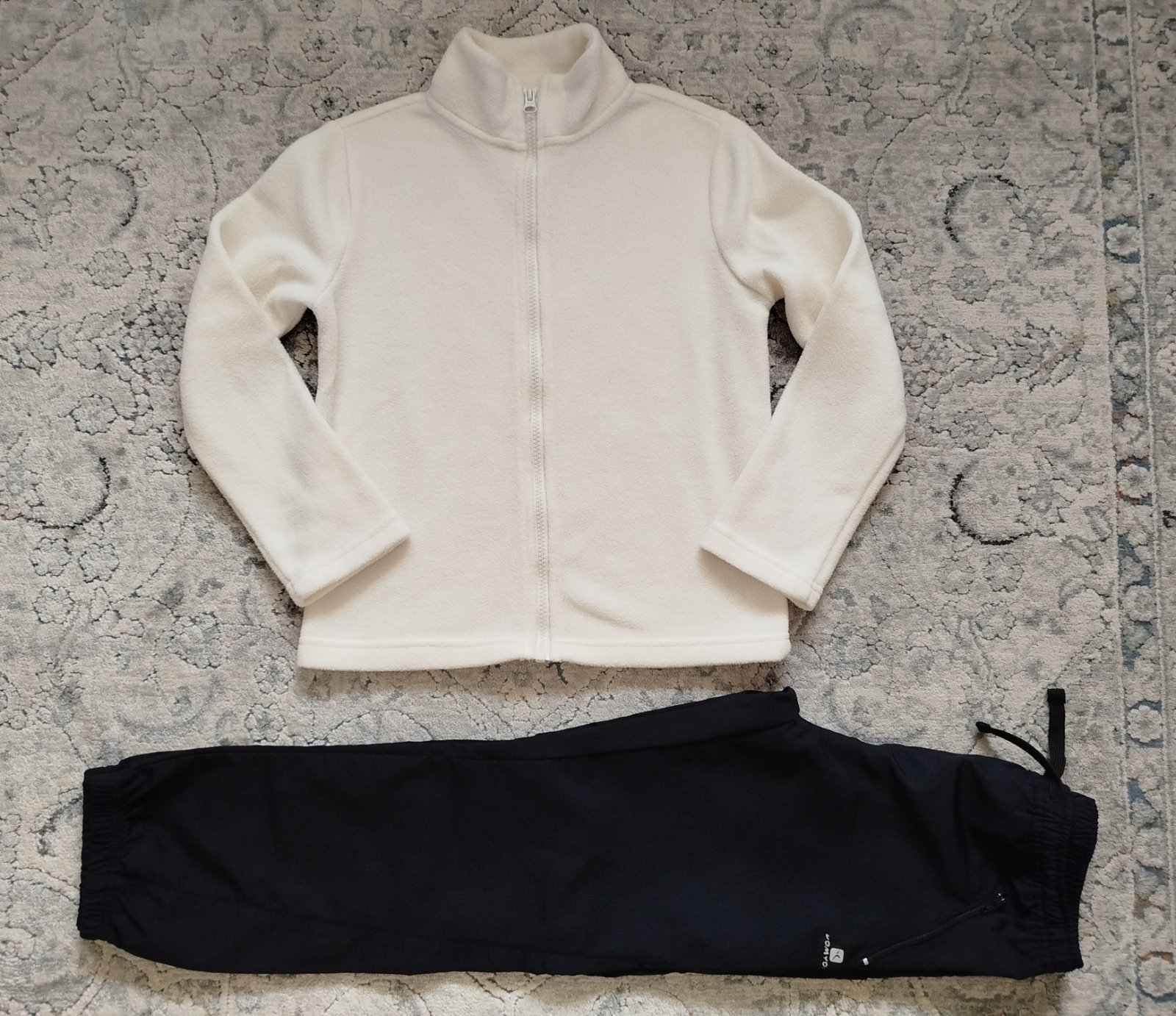 Športový komplet na prechodné obdobie, veľkosť 134 ale ponosíte až do 140. Tenké šušťákové nohavice Domyos, dĺžka 78cm, pás v kľude 30cm a dá sa stiahnuť šnúrkou ak treba. Na jednom kolienku sú jemnulinko šuchnuté, pri nosení to vôbec nevidno. Mikina je z tenkého flisu, značka F&F, dcéra ju nosila len týždeň na plavecký výcvik, je v super stave. Dĺžka 50cm, prsia 40cm, rukáv od krku 58cm. Cena a predaj LEN SPOLU + pošta do 500gr. Balné si neúčtujem 🙂