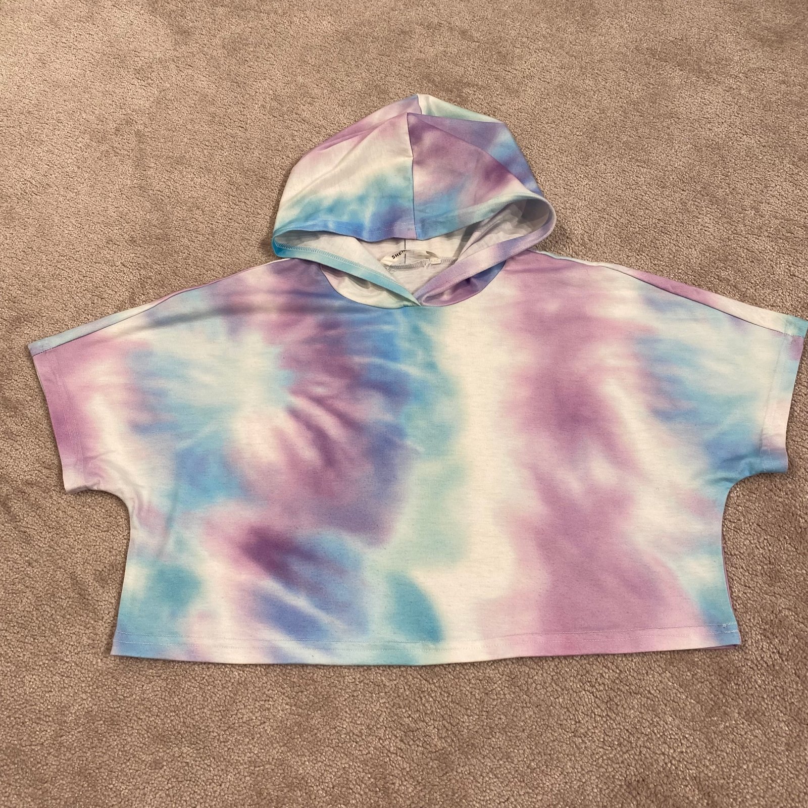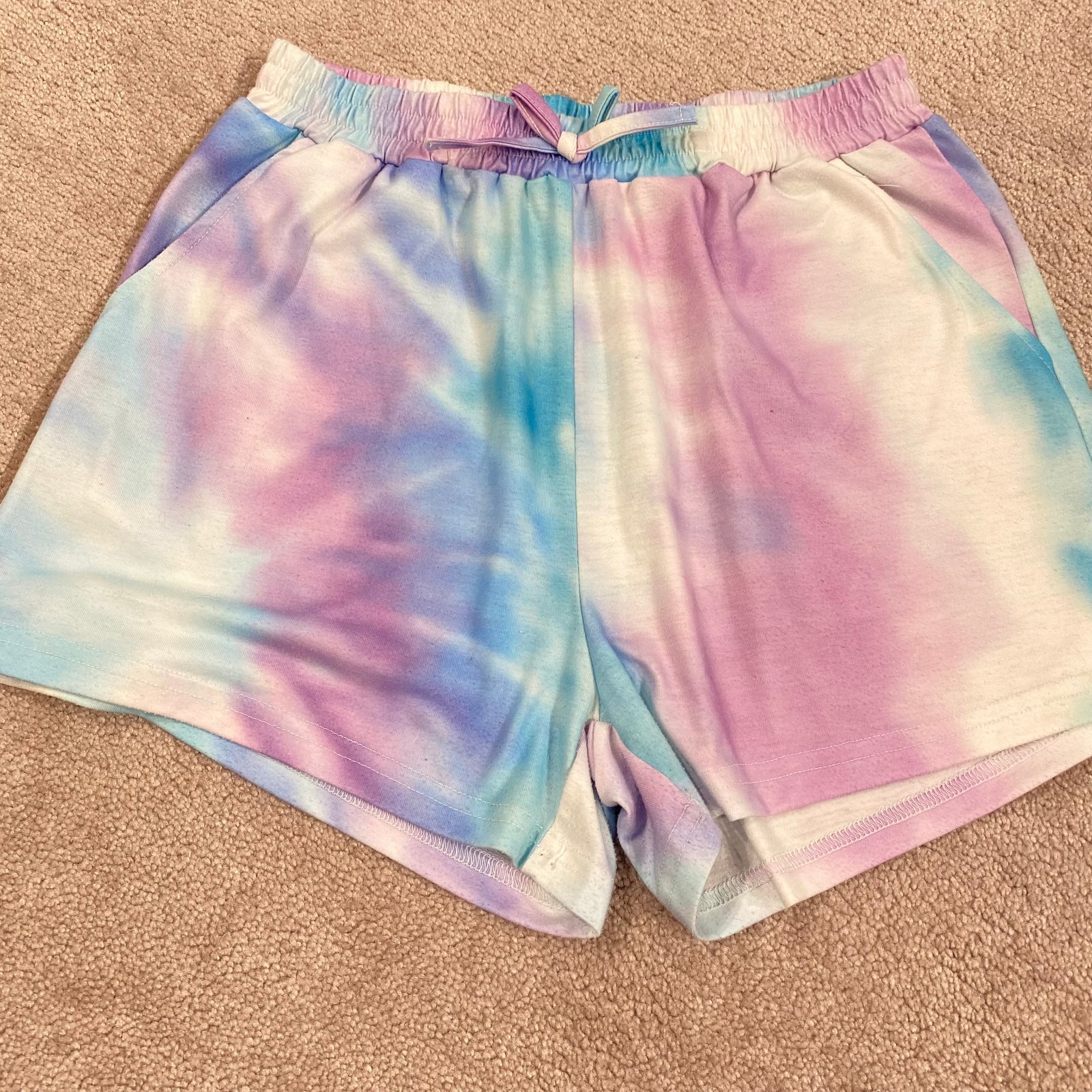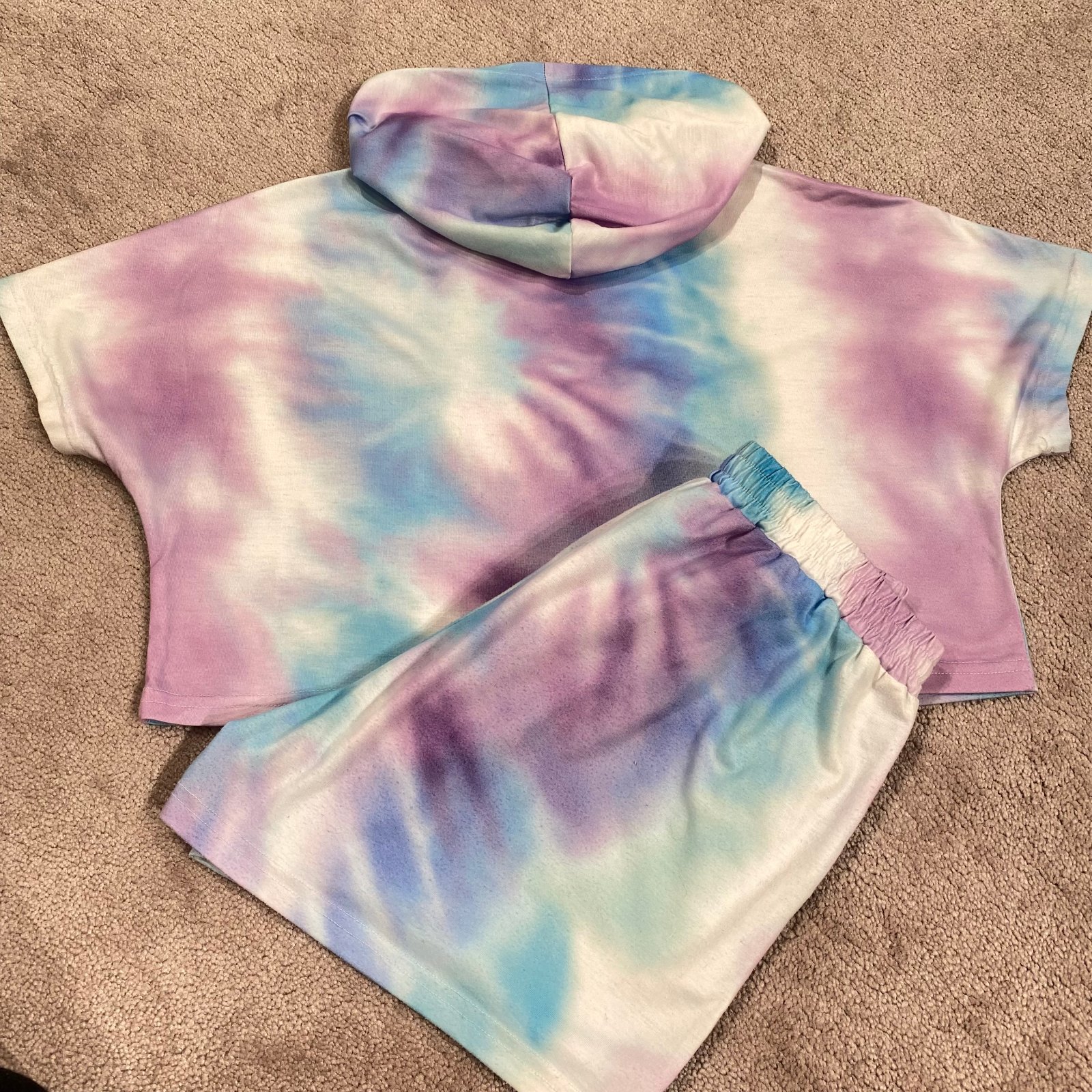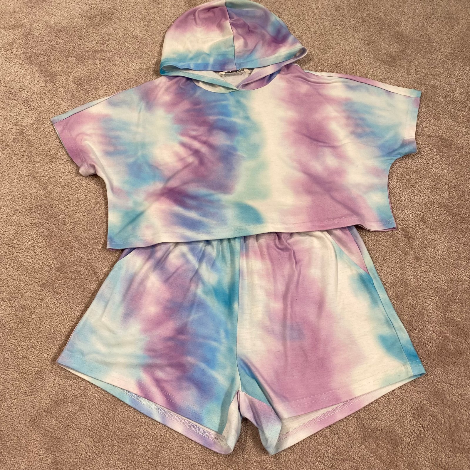 Komplet v príjemných farbách. Crop topové tričko s kapucňou dĺžka je 38cm, šírka je 48cm, Šortky s vreckami, pás na širokú gumu - 30- 38 cm. V dobrom stave.