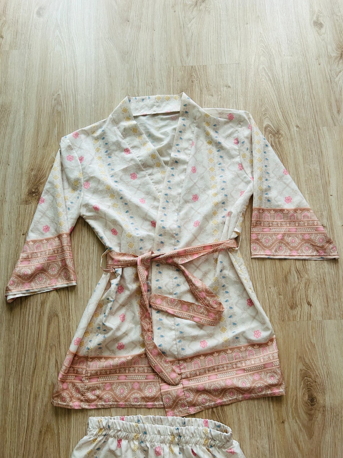 Predám tento kimono komplet značky GREENAPPLE v univerzálnej veľkosti, sedí na XS, S, M a menšie L. Komplet bol len 1xoblečený. Jeho pôvodná cena bola 36 EUR. Vyrobený bol v Taliansku. Kimonový dámsky komplet je tenšieho materiálu, ktorý sa skladá z dlhých rozšírených nohavíc a kaftanu pod zadok, ktorý sa dá v páse stiahnuť pomocou šnúrky. Nohavice majú v páse gumičku, takže sa pekne prispôsobia. Jednotlivé kúsky sa dajú nosiť aj samostatne. Krásny a štýlový kúsok, ktorý má mnoho možností využitia.