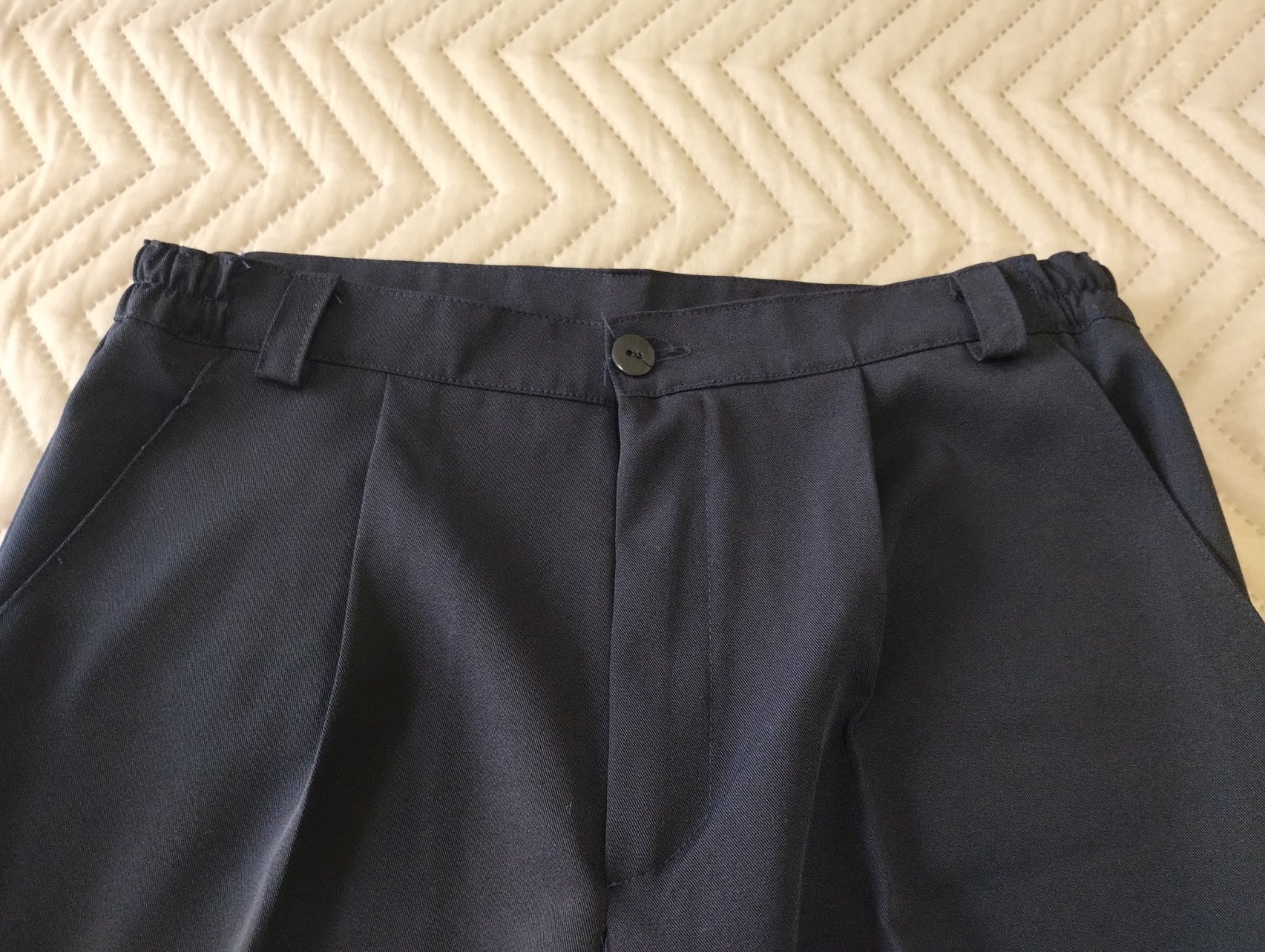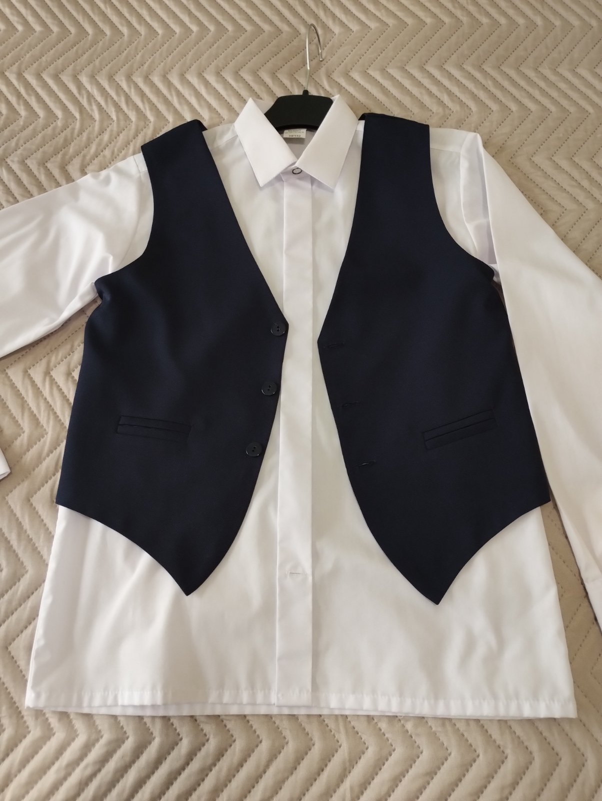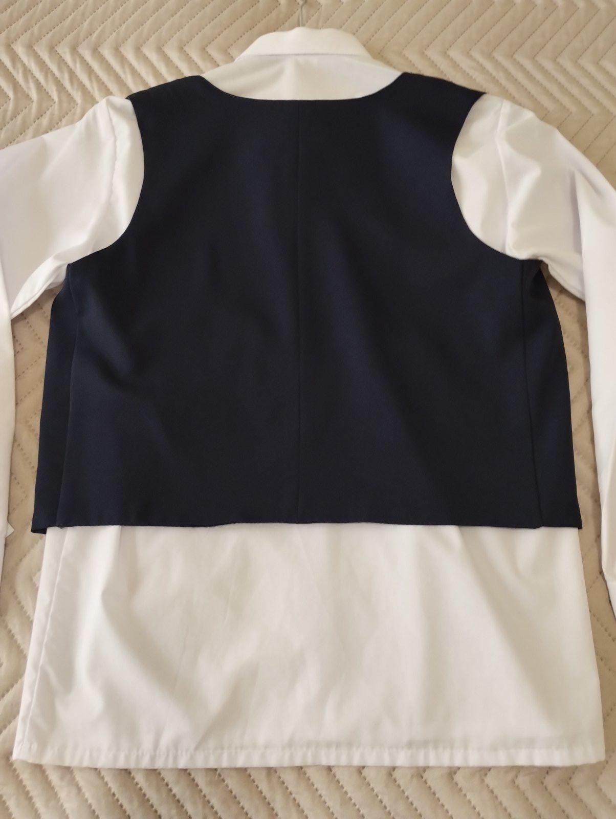 Top stav. 1 x oblečené na svadbe. Vesta a nohavice tmavomodrá farba. Košeľa biela, Zn. Lora. Všetko kupované v kamennej predajni ako sada. Nohavice sú v páse čiastočne na gumu. Veľmi praktické. Dĺžka je v spodnej časti zašitá ručne. Dajú sa ľahko upraviť.