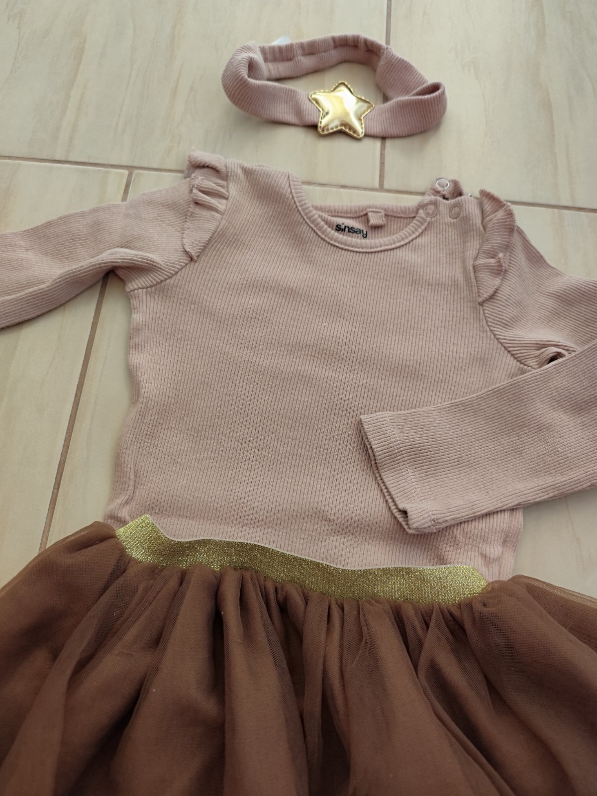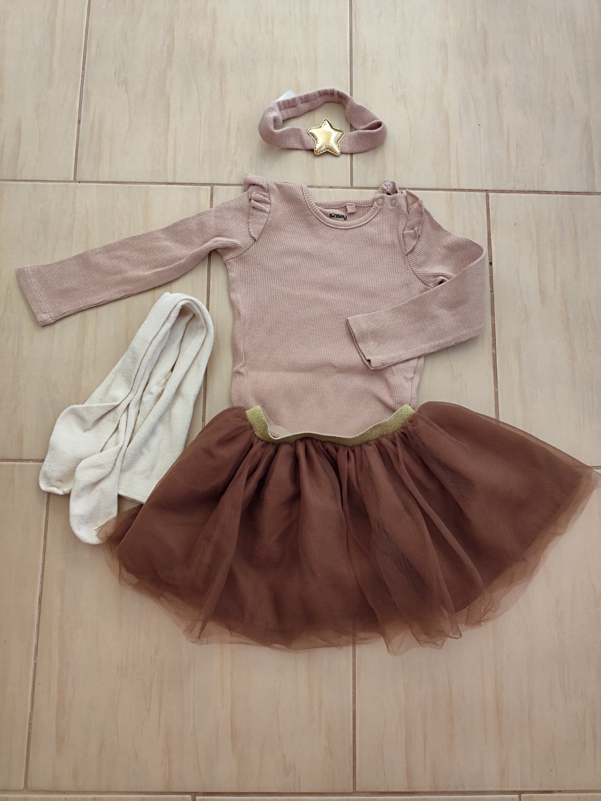 Hnedo-zlatý komplet pozostávajúci z rebrovaného body, sukne, pančušiek a čelenky, veľkosť píše 98 (reálne 92/98), super stav, párkrát oblečené (pančušky majú jemné žmolky z prania). Vyprané v Non toxic prášku. Cena za komplet spolu.