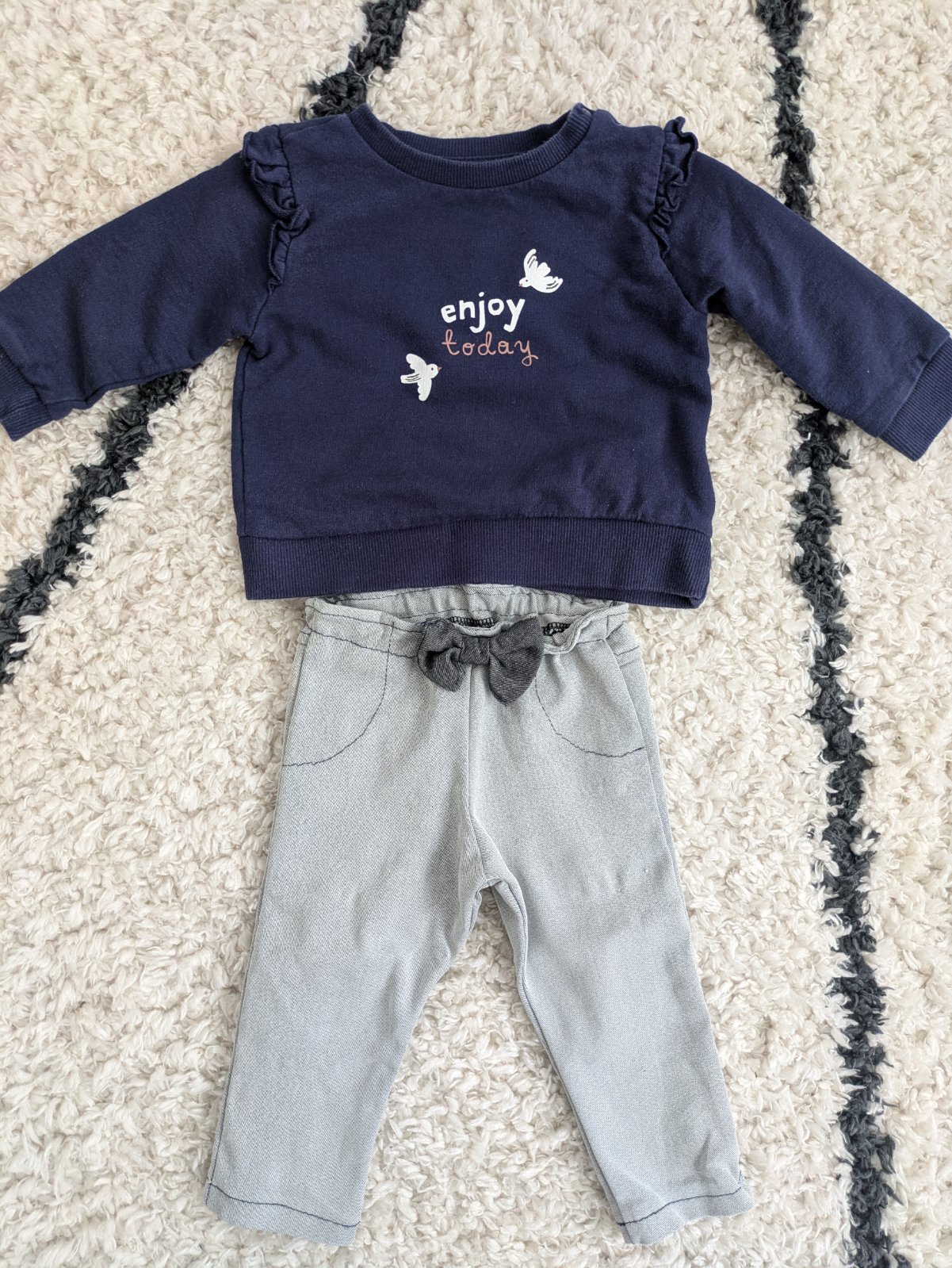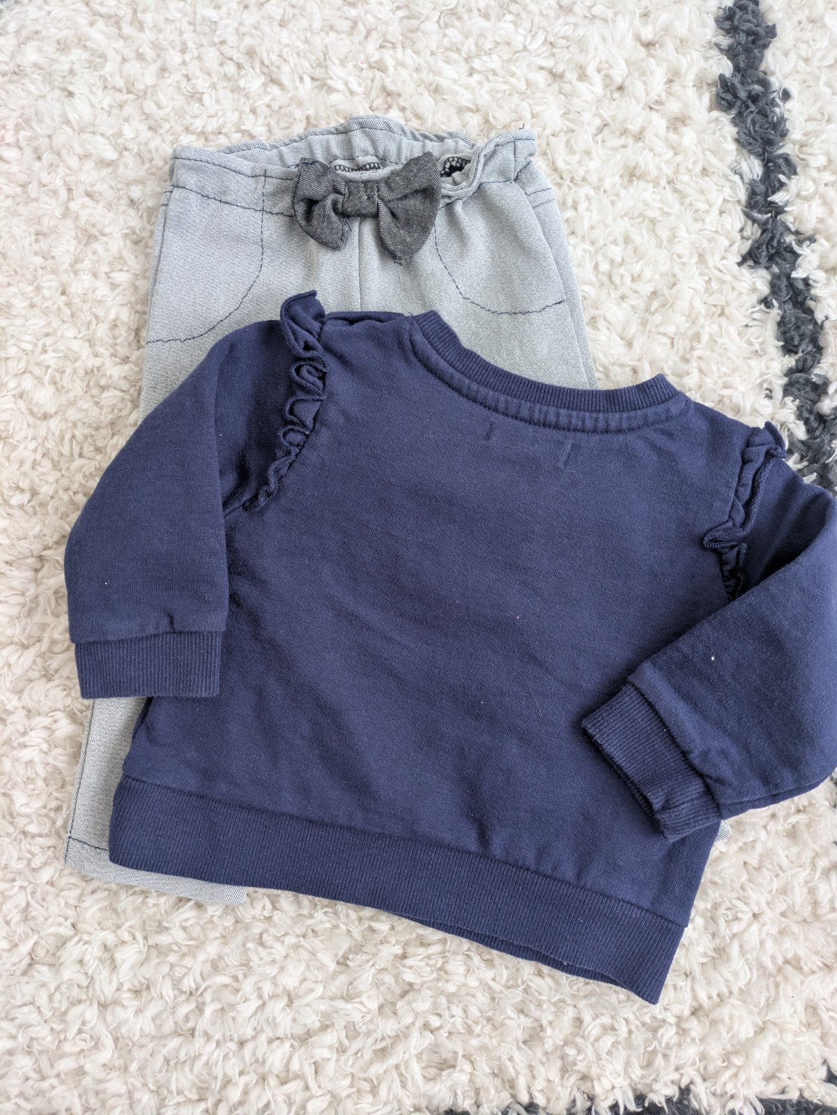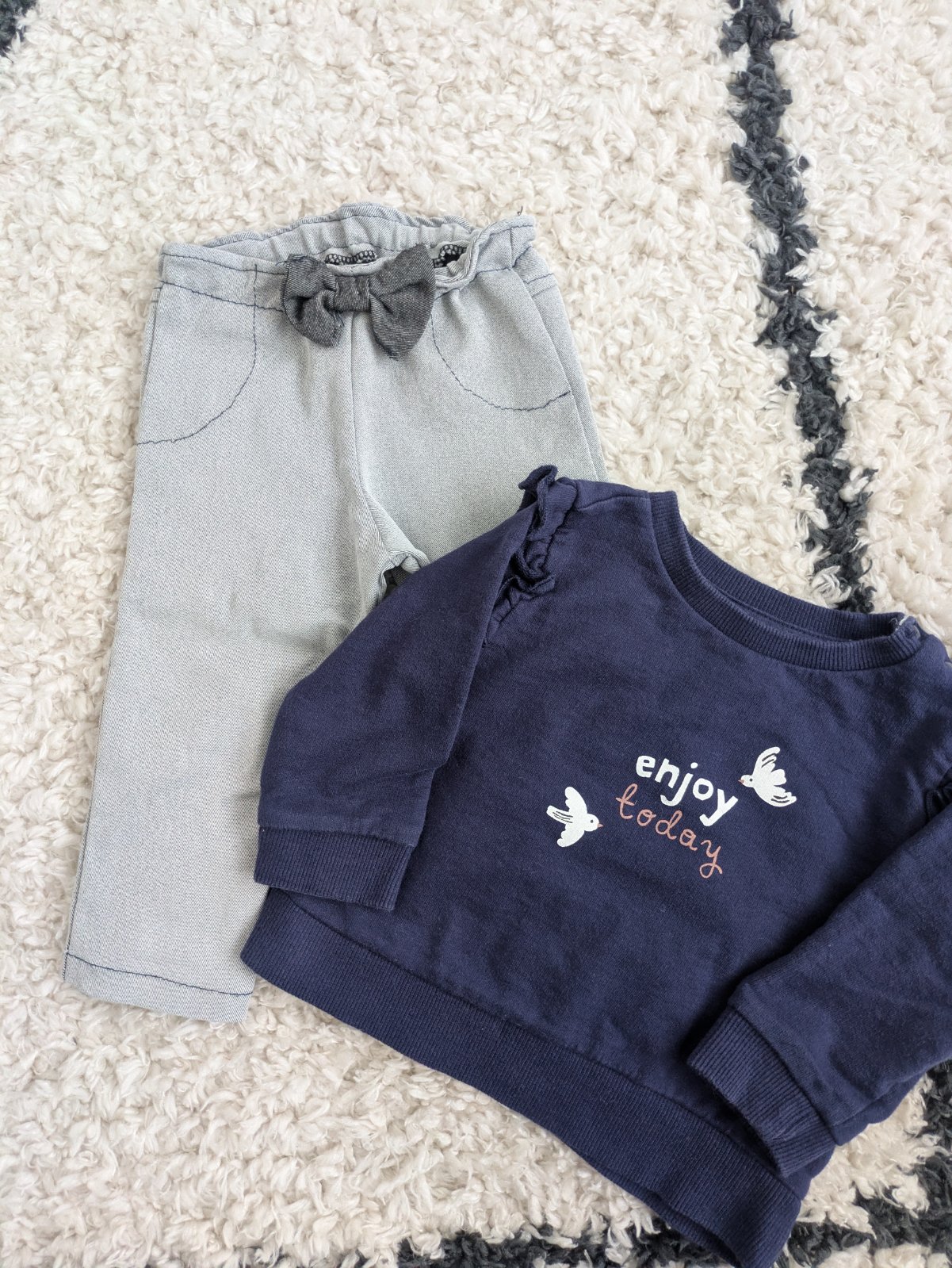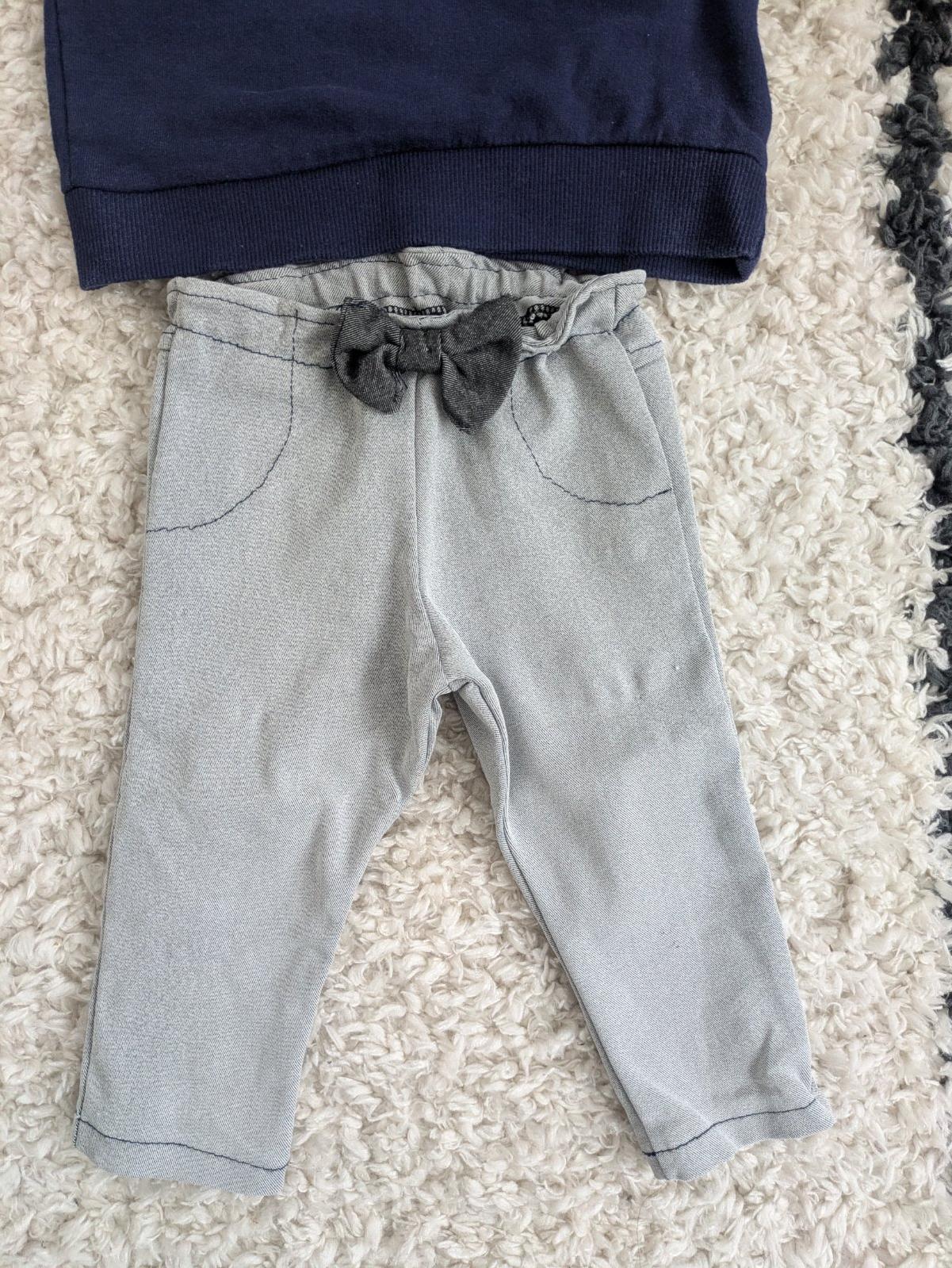 Modrá mikinka a sivé legíny s mašľou, bez poškodení v super stave