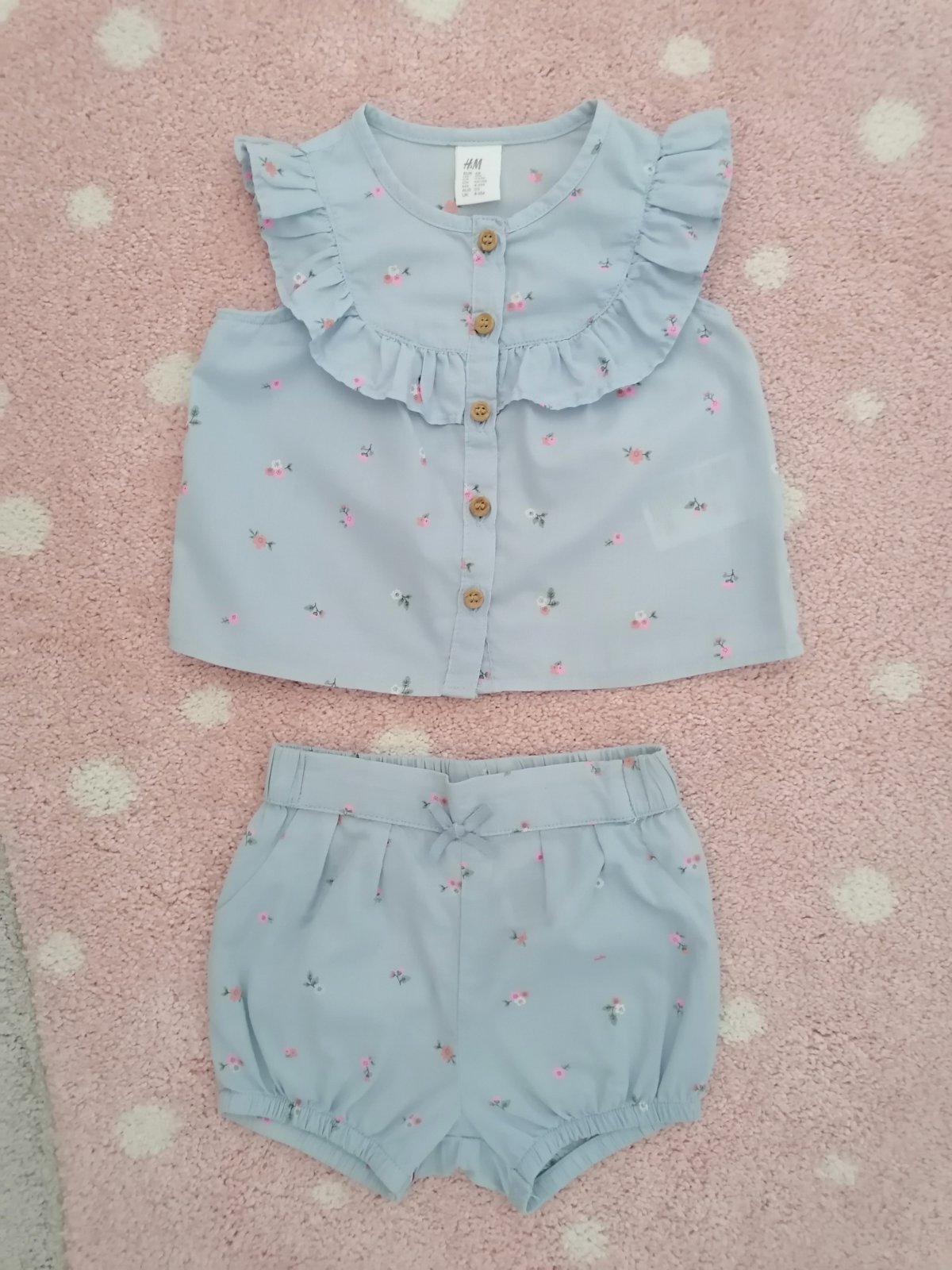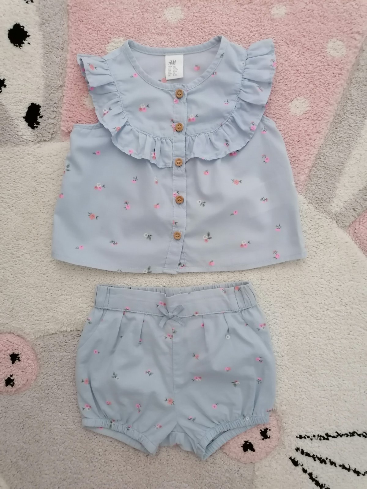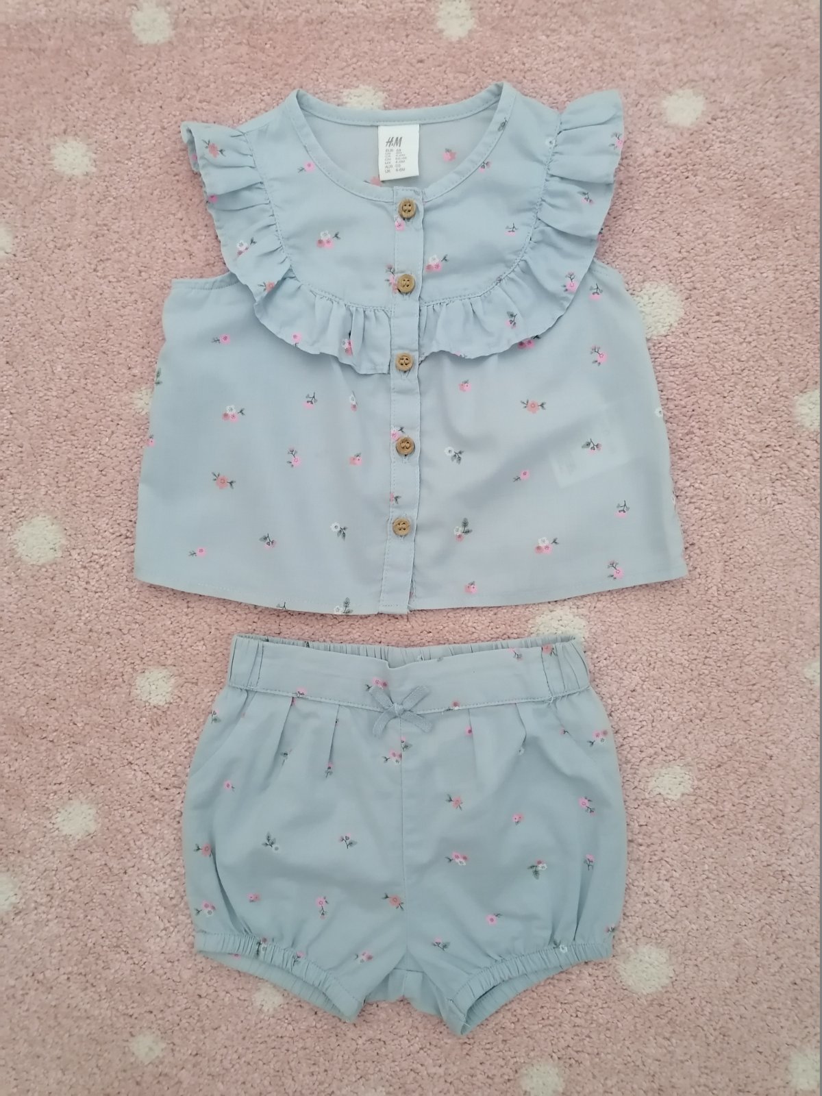 Krasna 2-dielna letna suprava - sortky a bluzka/tunika. Vyborne sedi na babatku. Pekne detaily (vid fotky). Farba je pekna svetlomodra - krajsia v skutocnosti nez na foto. Top stav.