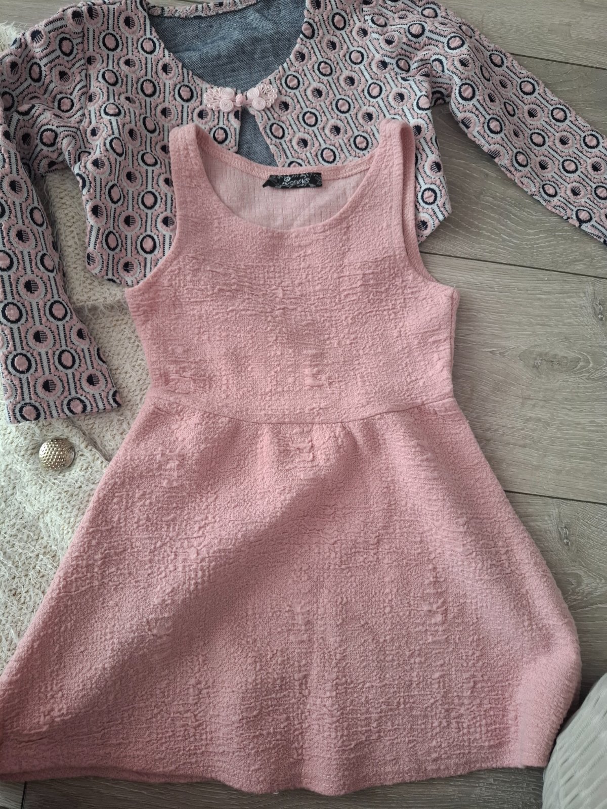 Kabatik oblečený 2x, plus pridam ruzove saty s bolerkom. V ponuke aj biely kabatik so šatami, uplbe novy, vhodny ako darcek cena 20 eur