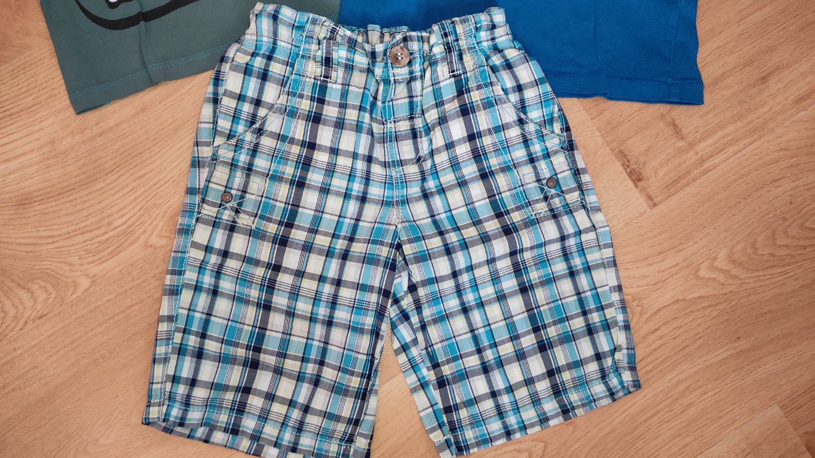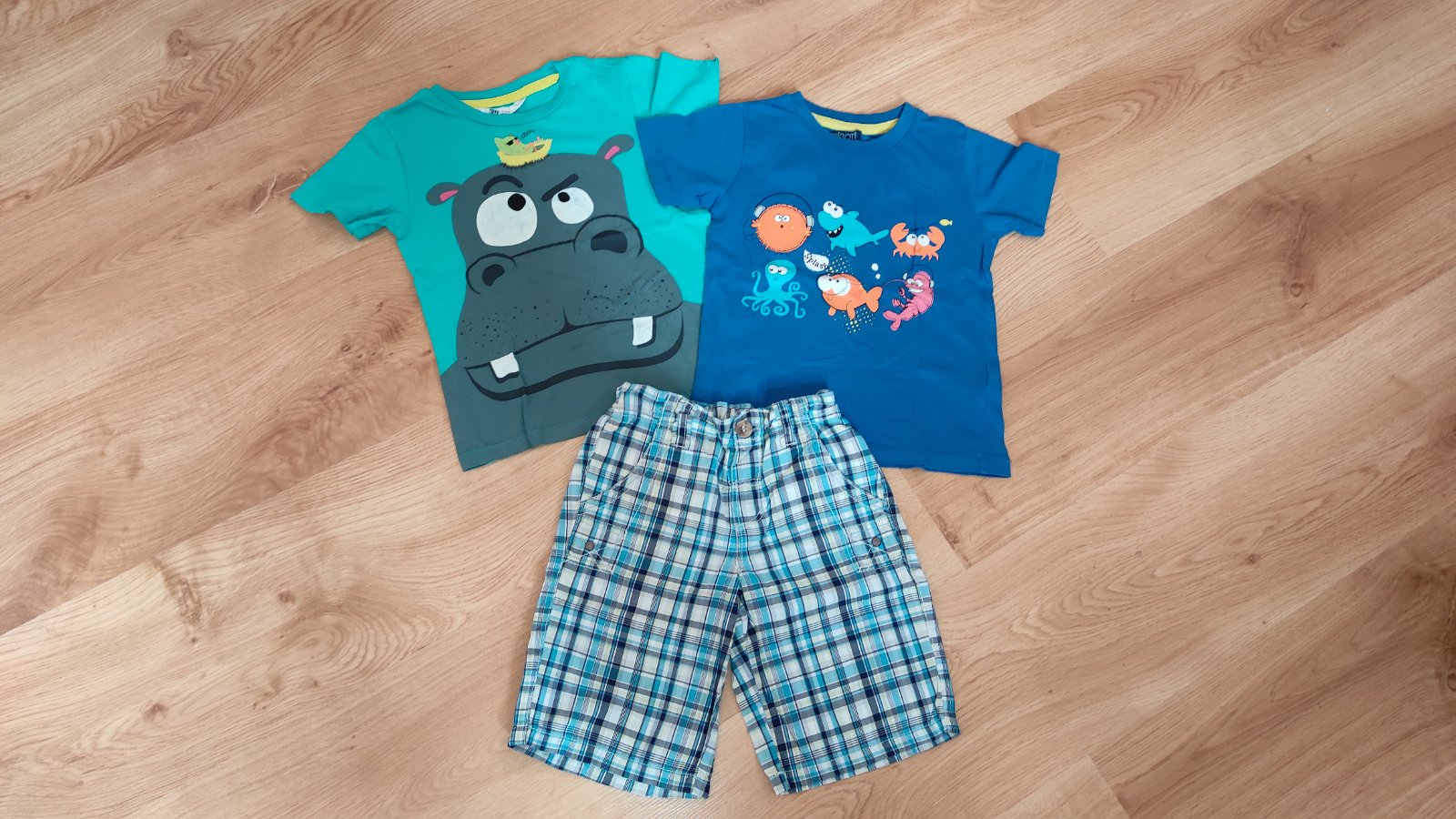 Ponúkam na predaj pekne bavlnené veci pre chlapca. Nosené na hrochovi (H&M) vidno malicke ošúchanié, ale stále pekne. Kraťasky next. Inak sú veci bez poškodenia. Dajú sa aj ako väčšia 98 ka aj ako 104ka. Cena 6 eur.