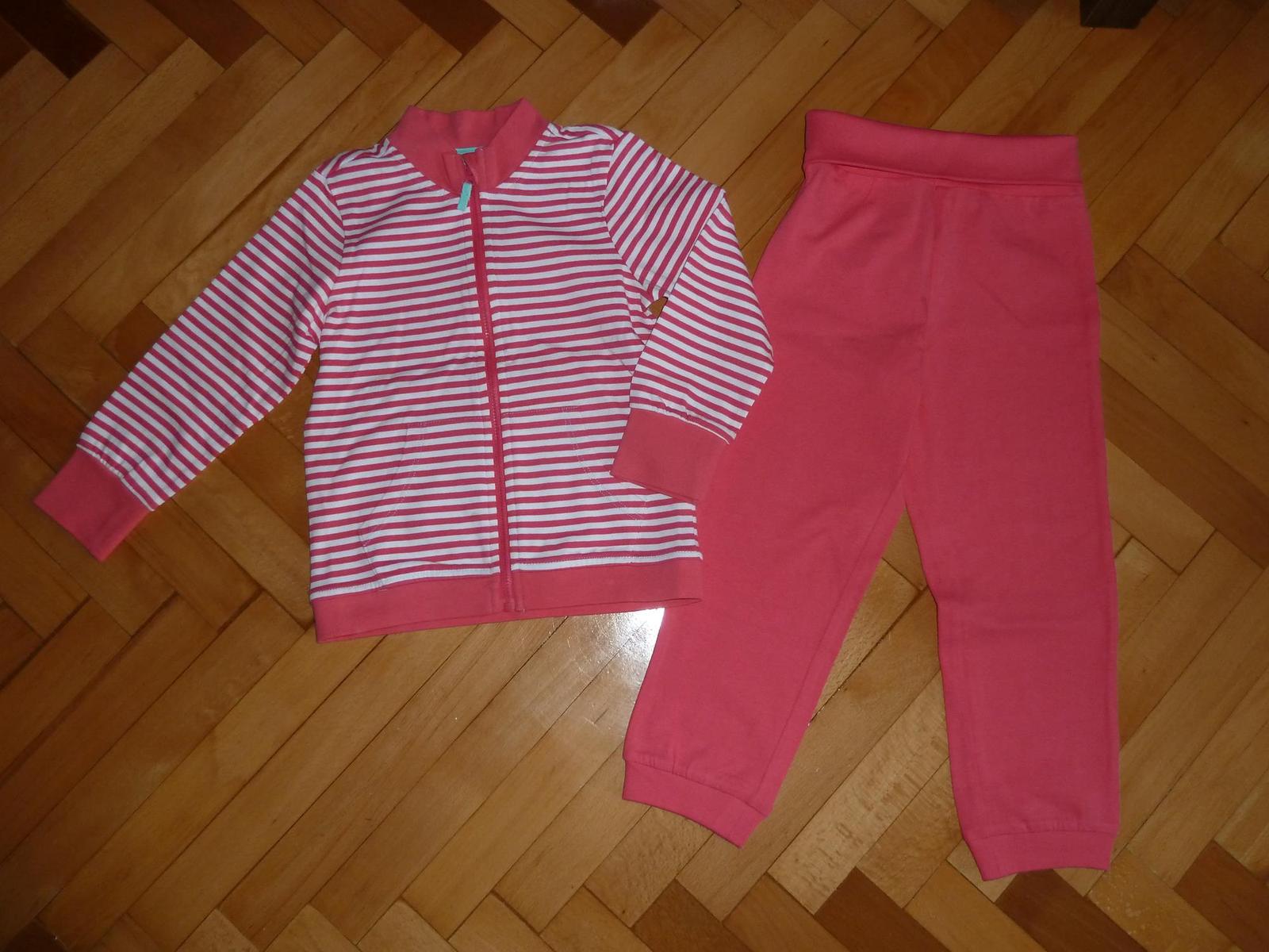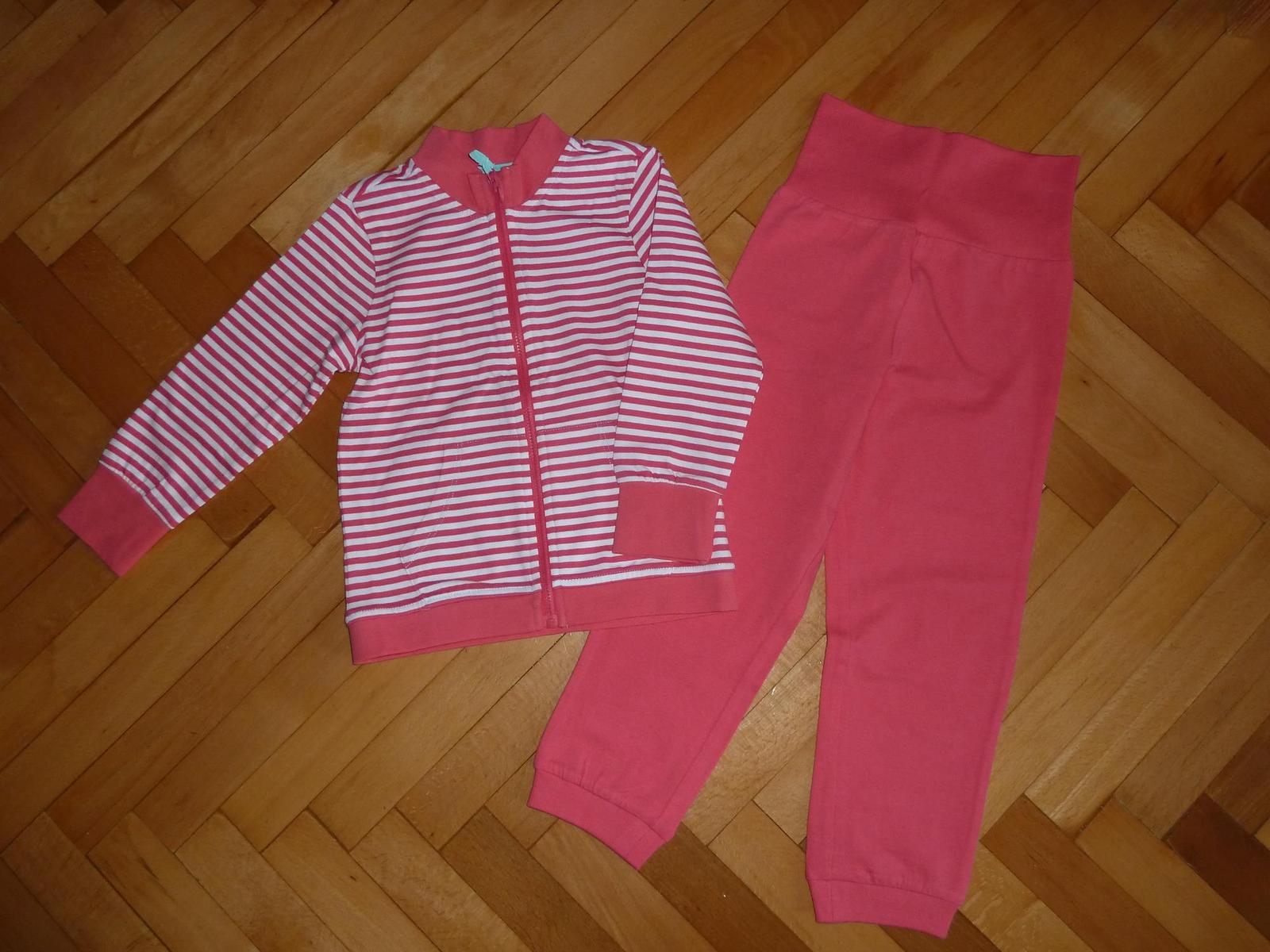 Bez visacky, nenosena suprava, neprana, tenka mikina na zips a tenke teplaciky. Farba ako na fotke (nieco medzi ruzovou a cervenou). Pisana velkost 98/104, ale je vacsia, sedi skor na velkost 104/110. Pokojne vhodne aj ako dar.