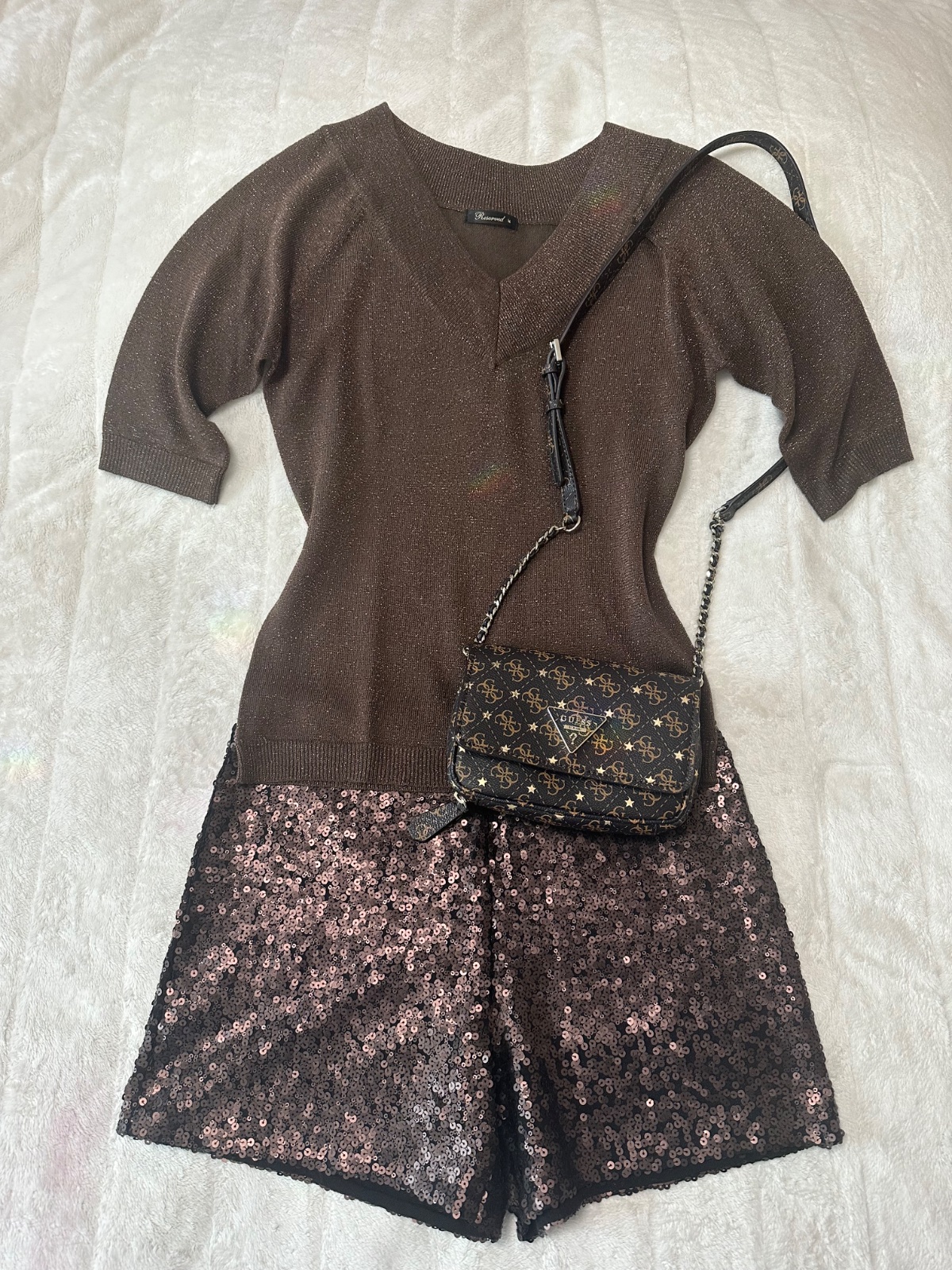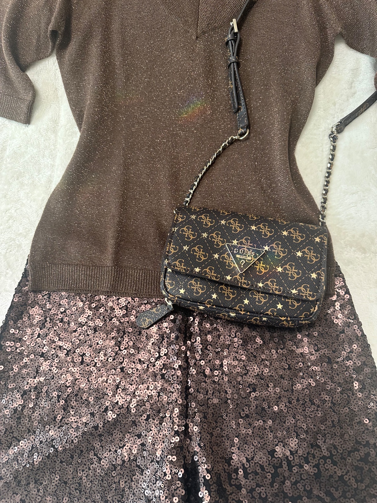 Krásny hnedý slávnostný komplet s kabelkou Guess
