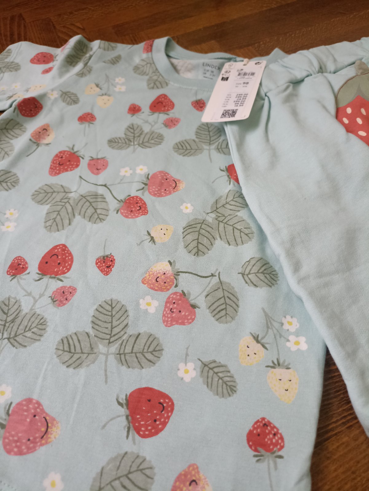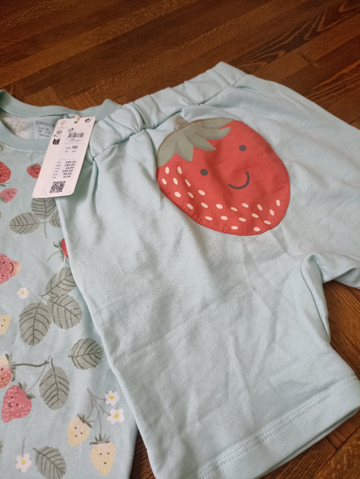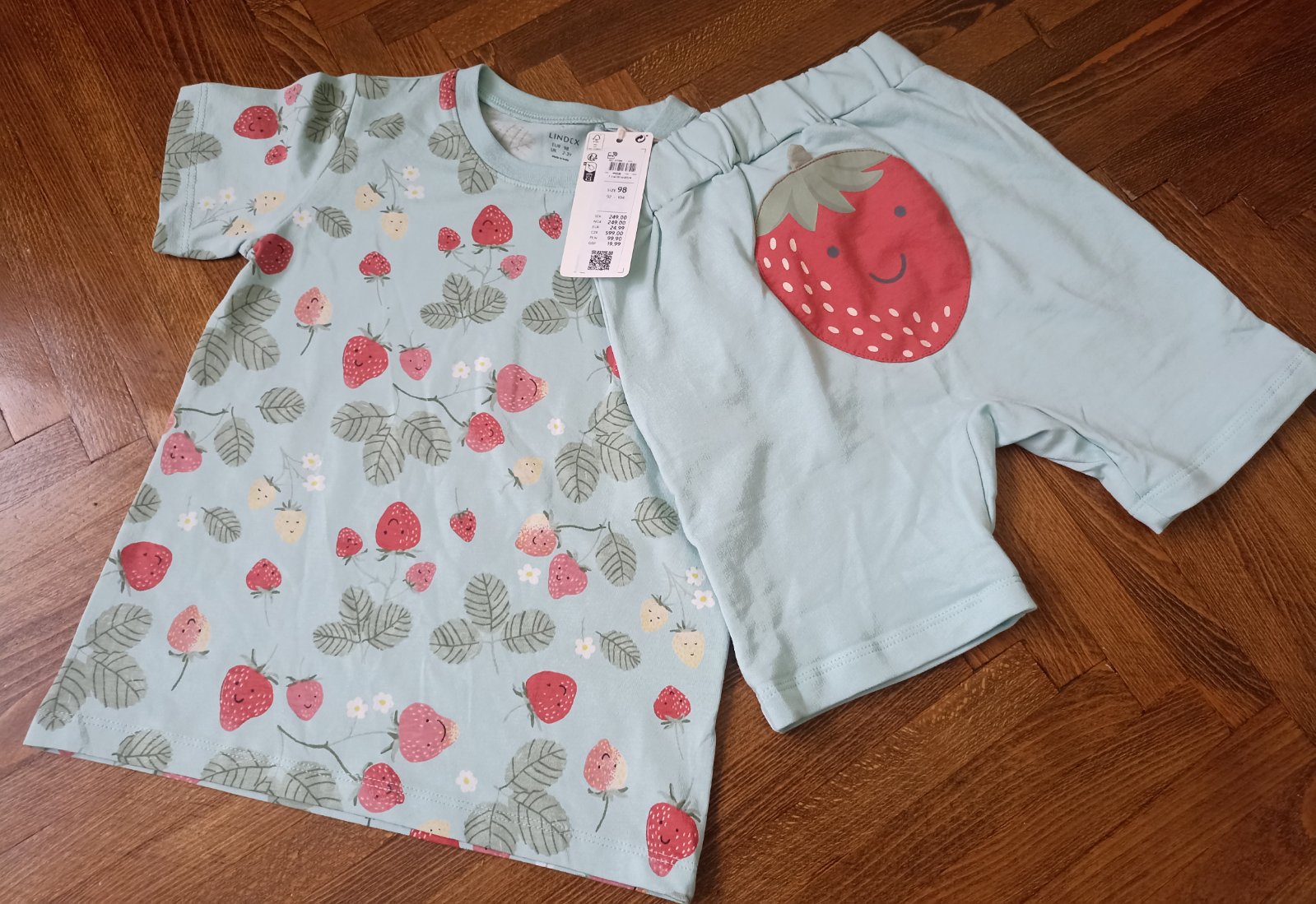 Nová letná súprava Lindex - tričko+ kraťasy s reguláciou v páse. Krásny jahodový vzor. Materiál je bavlna a elastan. Veľkosť 98.