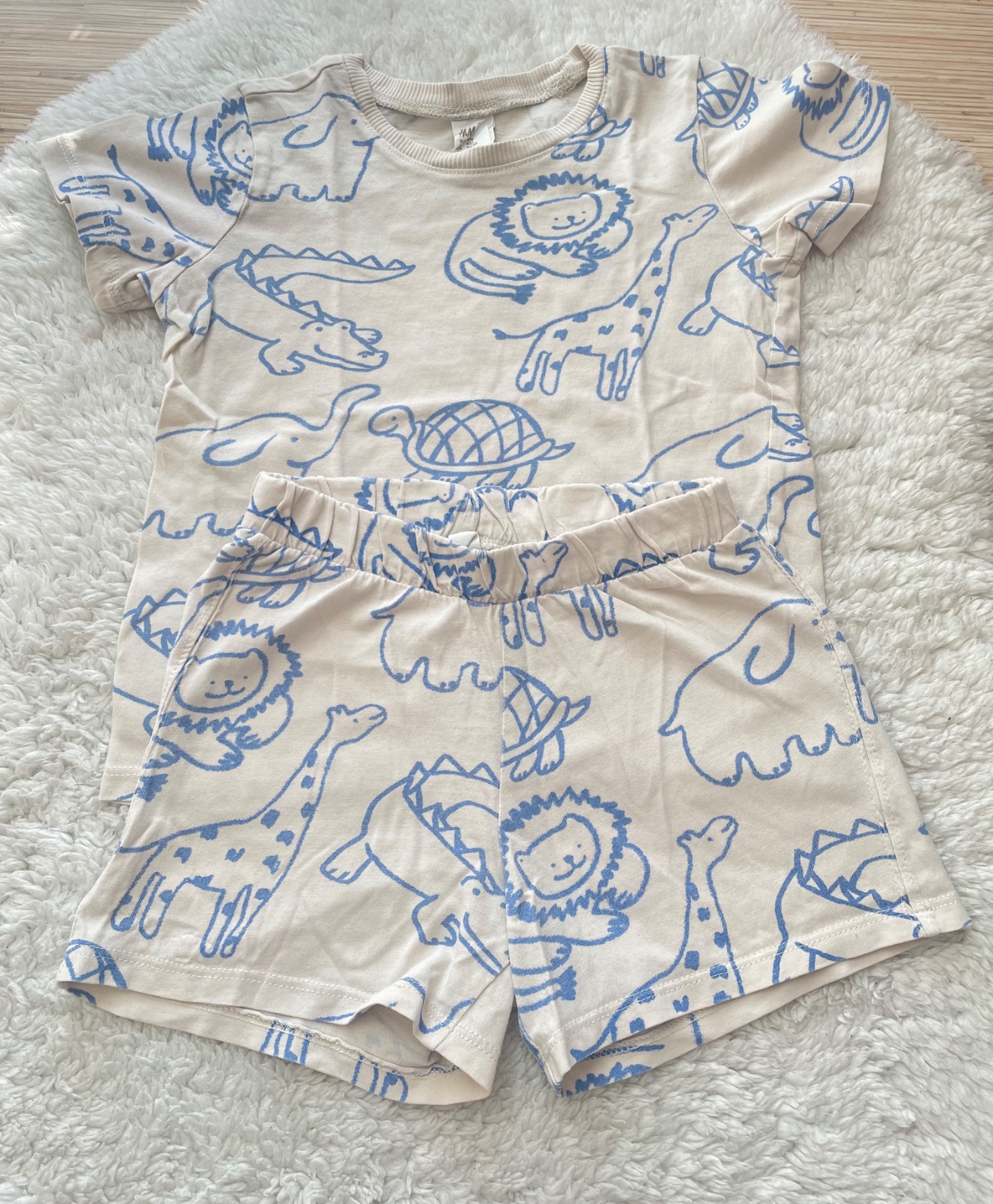 Letna bavlnena suprava v kremovej farbe s modrymi zvieratkami, trnky material, kratasky na gumu, velkost 104, neposkodena, moze sa nosit aj ako pyzamko