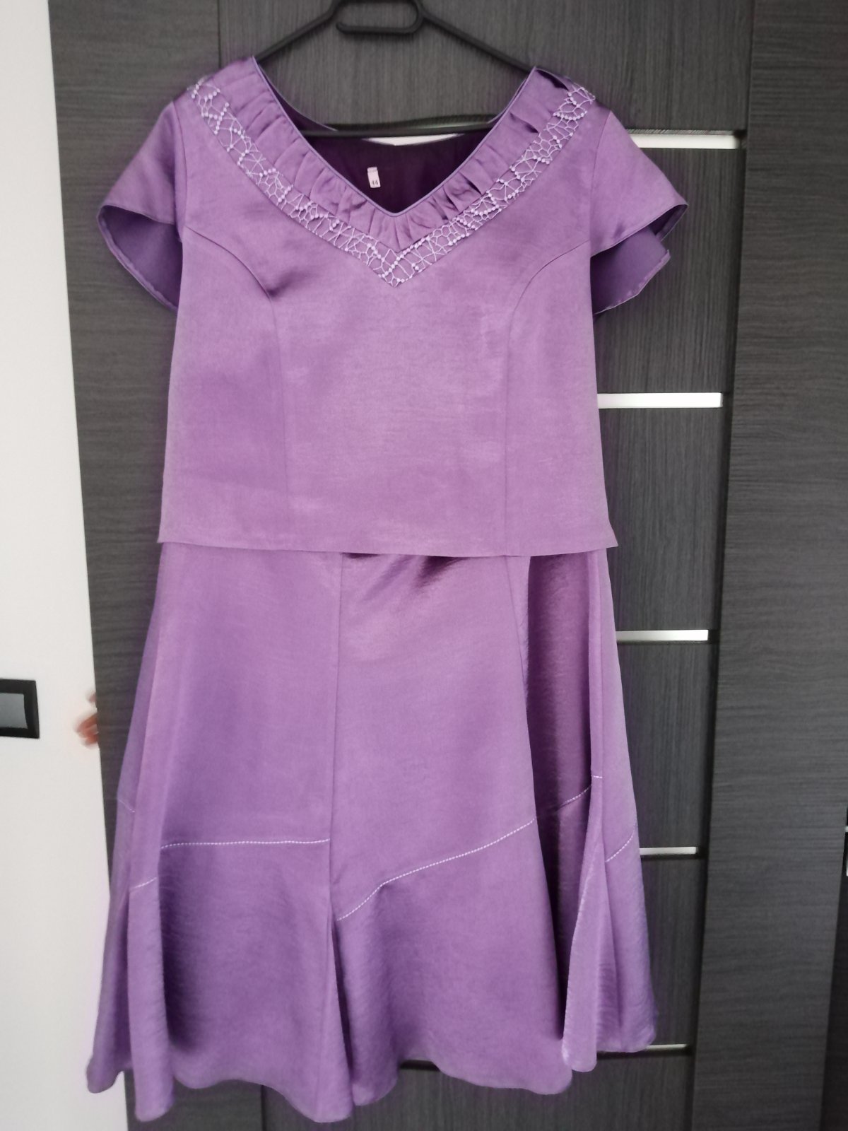 Zachovale, raz oblečené, splývavé material, sukňa strih do A, tricko výstrih do V, sukňa je podsita, tricko je podšité len vpredu, tricko dlzka 64cm, obvod hrudnika v klude 110cm, sukňa pas elastic...