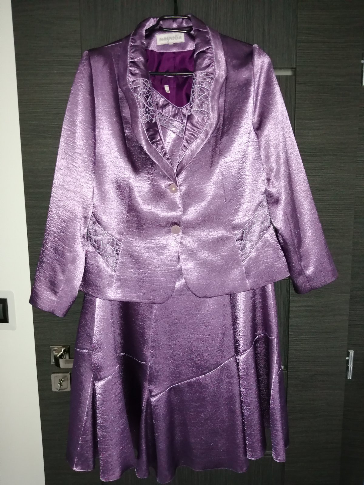 Pekny kvalitny kostym na slavnost,filaovej farby,s podsivkou,kontrasne lemovany.100%polyester.ako novy. d11 ROZMĚRY: vel.44/46,UK18r,blejzer cez prsia 2x56cm,cez pas 2x53cm,cez boky 2x58cm,dl 67cm....