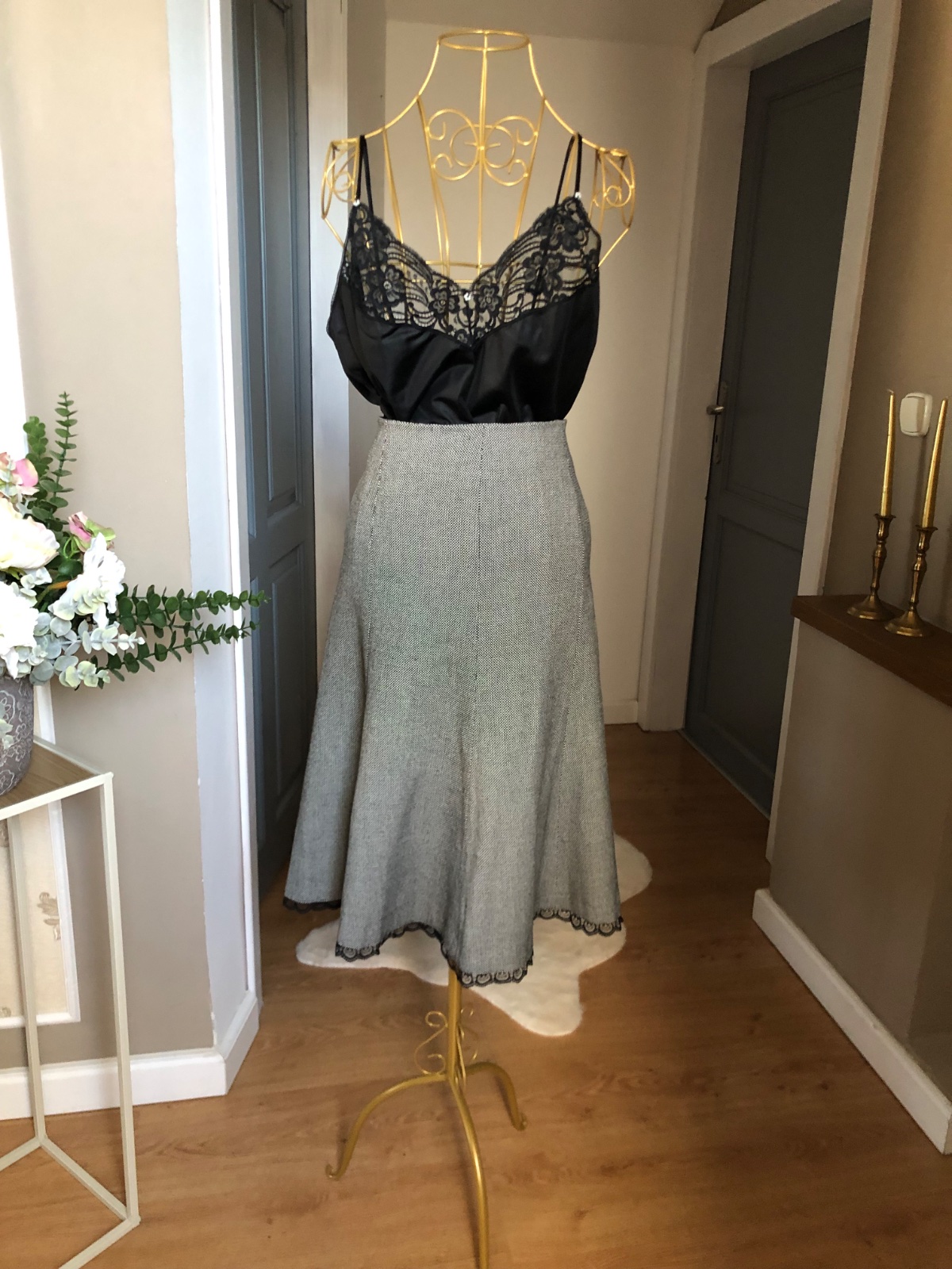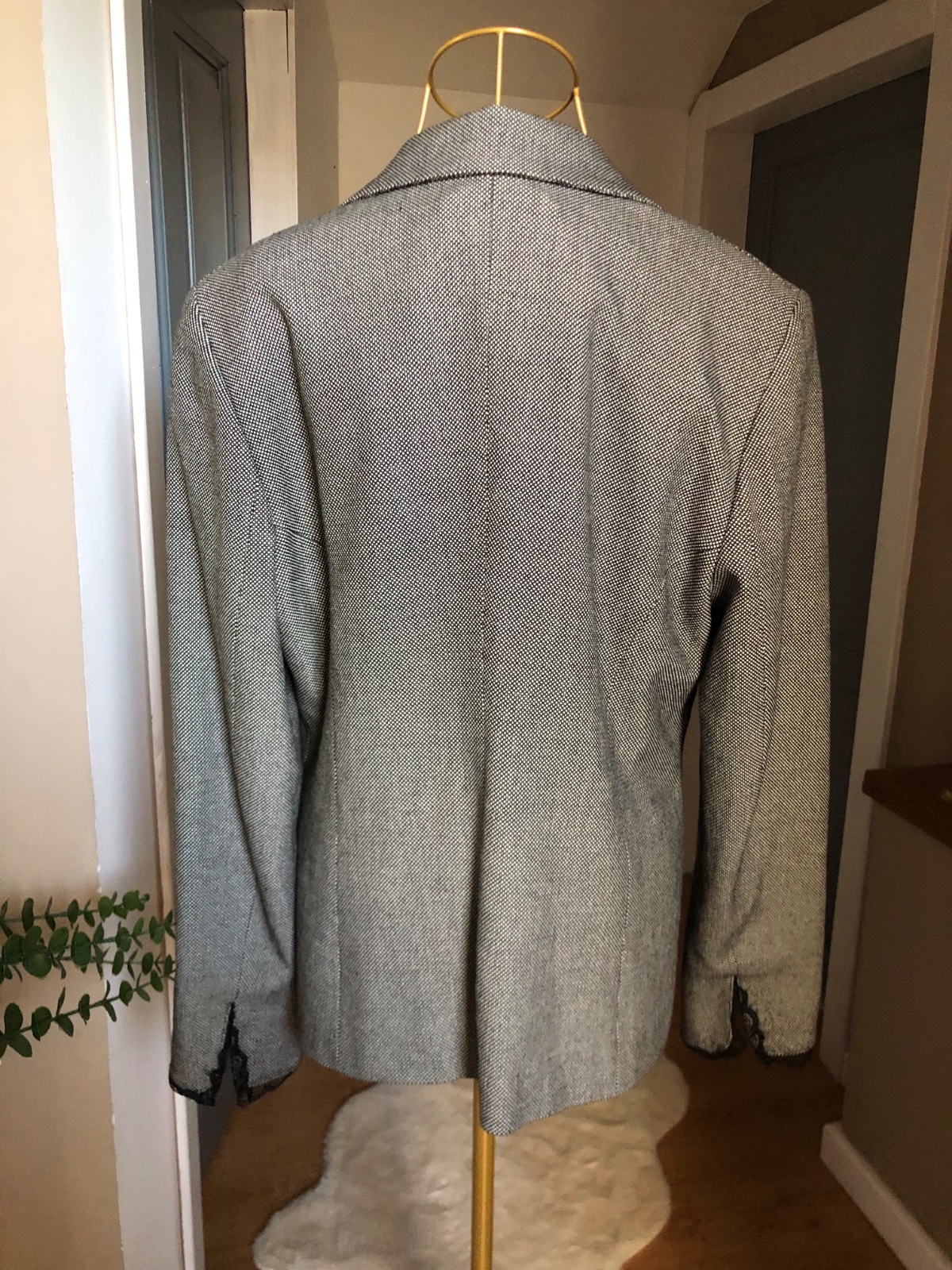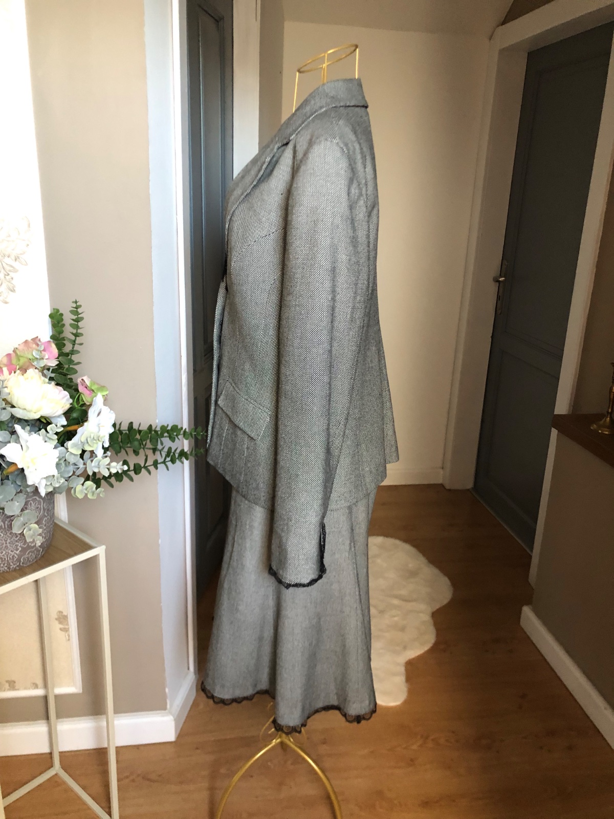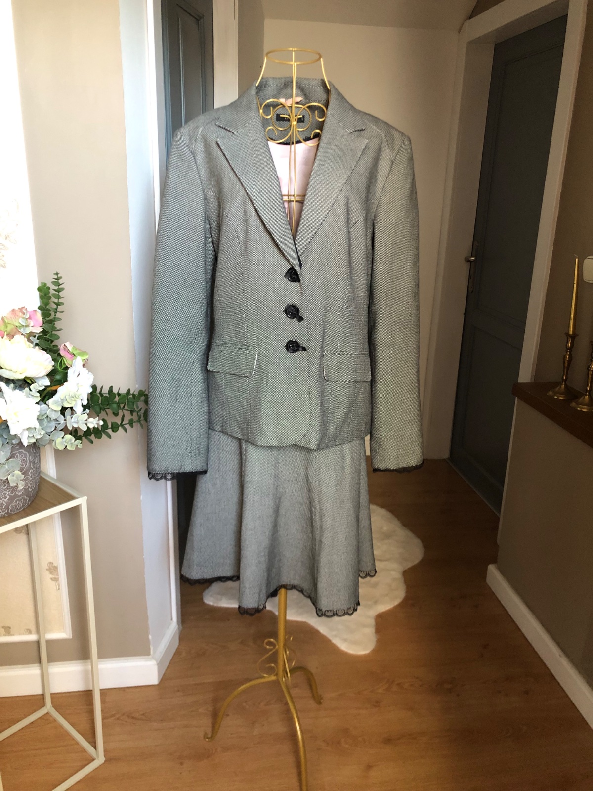 Kvalitný sukňový kostým, drobný vzor, zdobený čipkou, podšitý, super stav