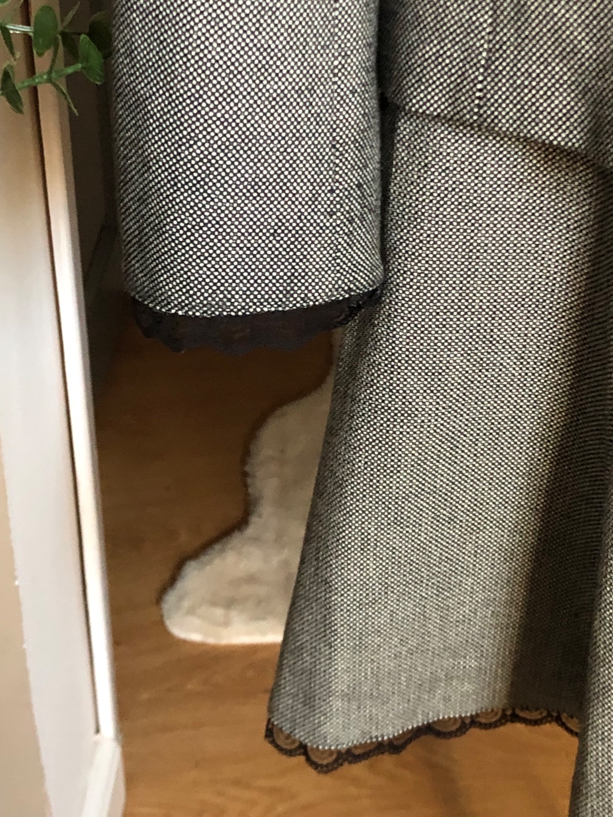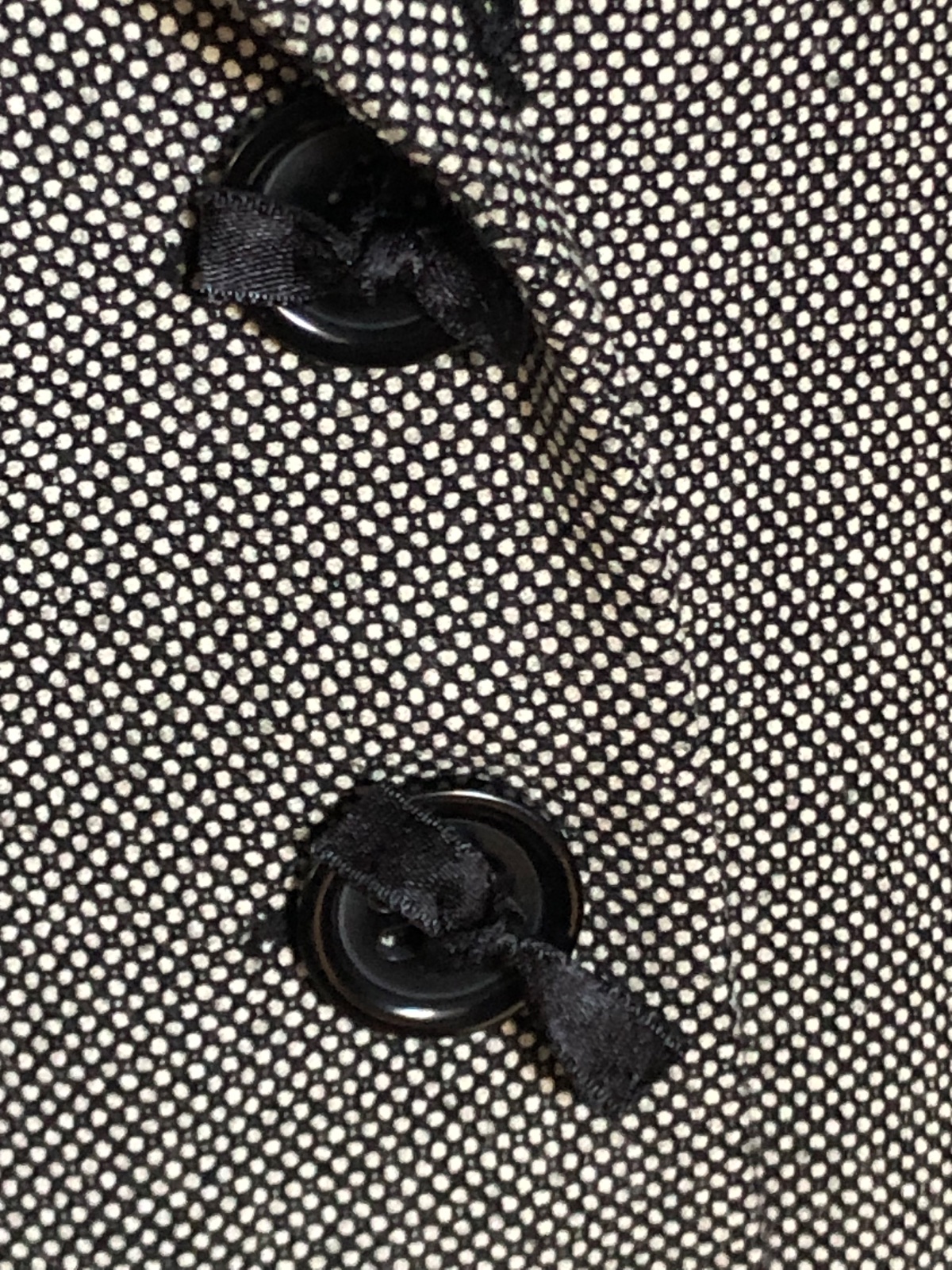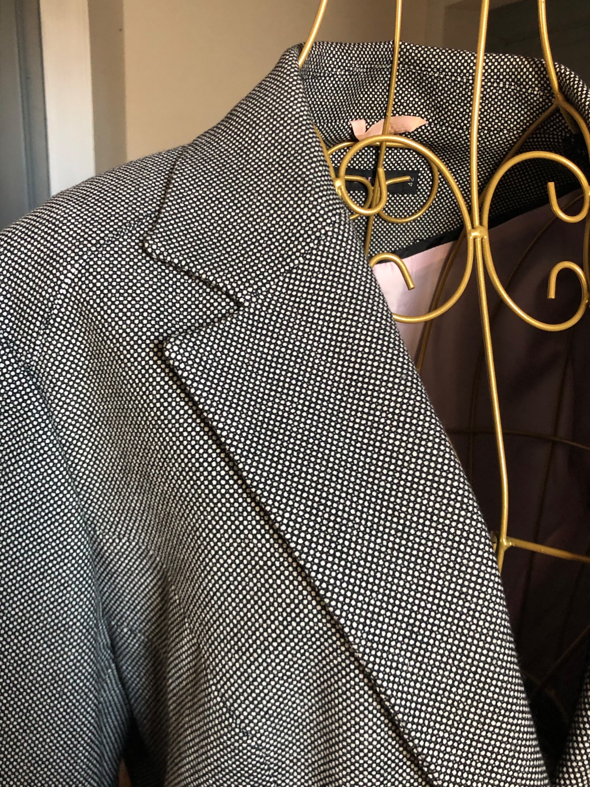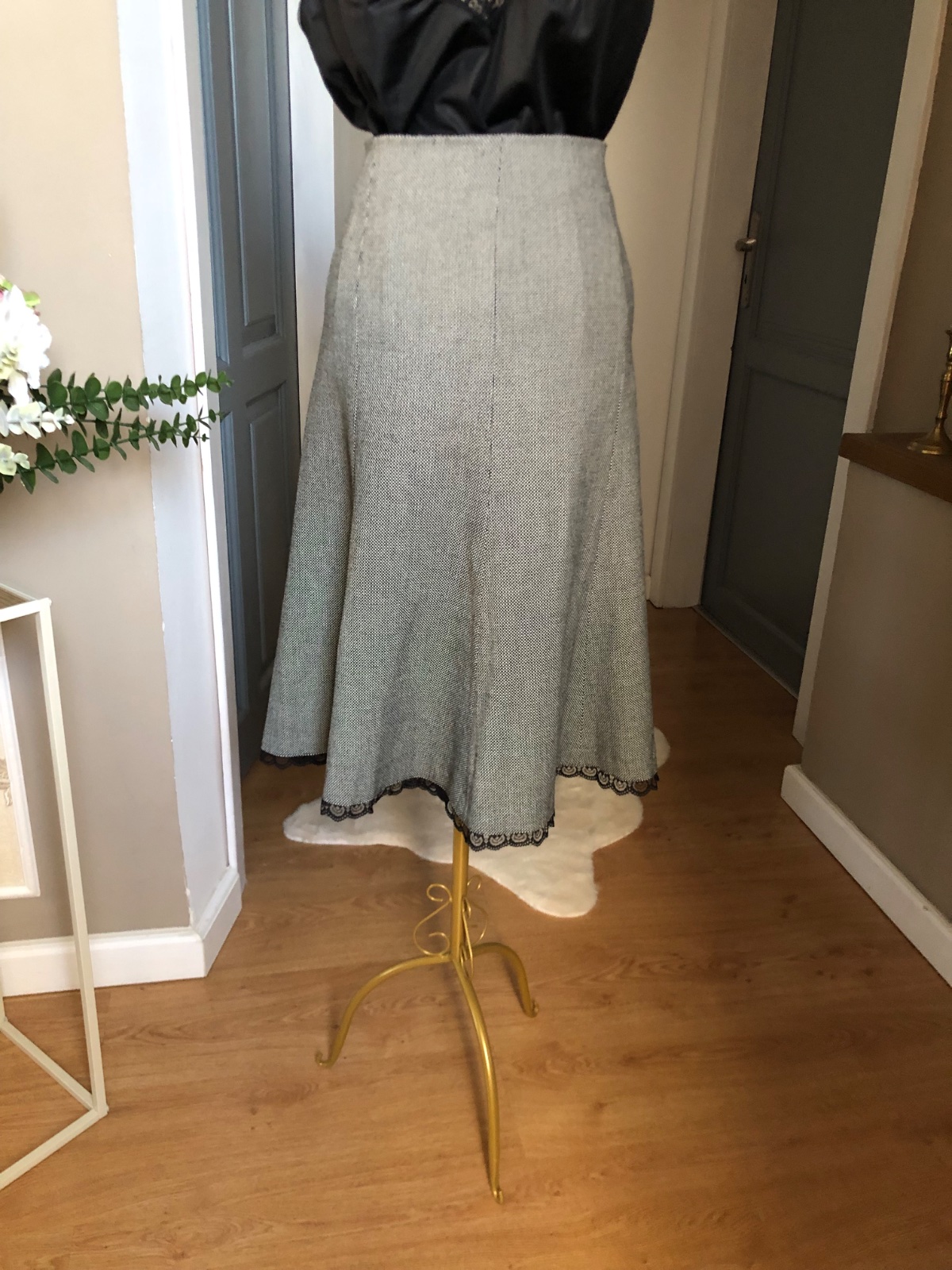 Kvalitný sukňový kostým, drobný vzor, zdobený čipkou, podšitý, super stav