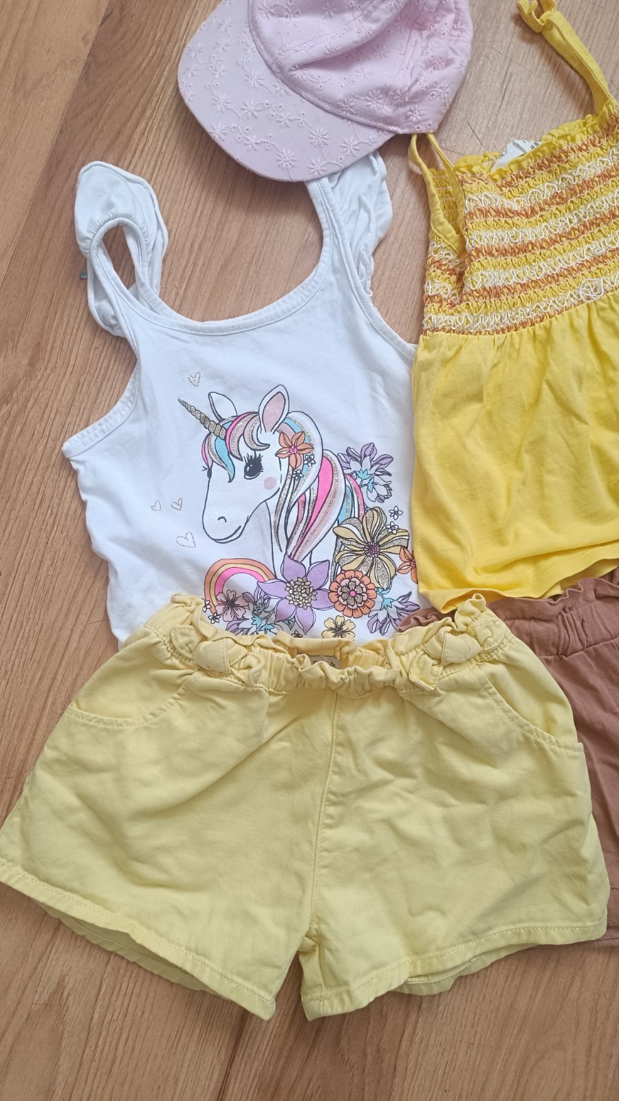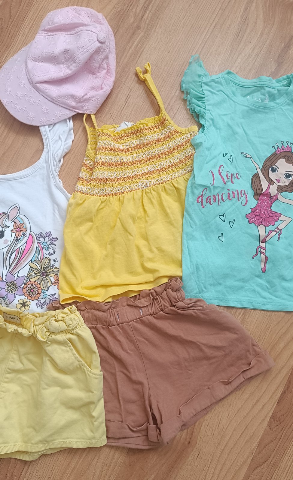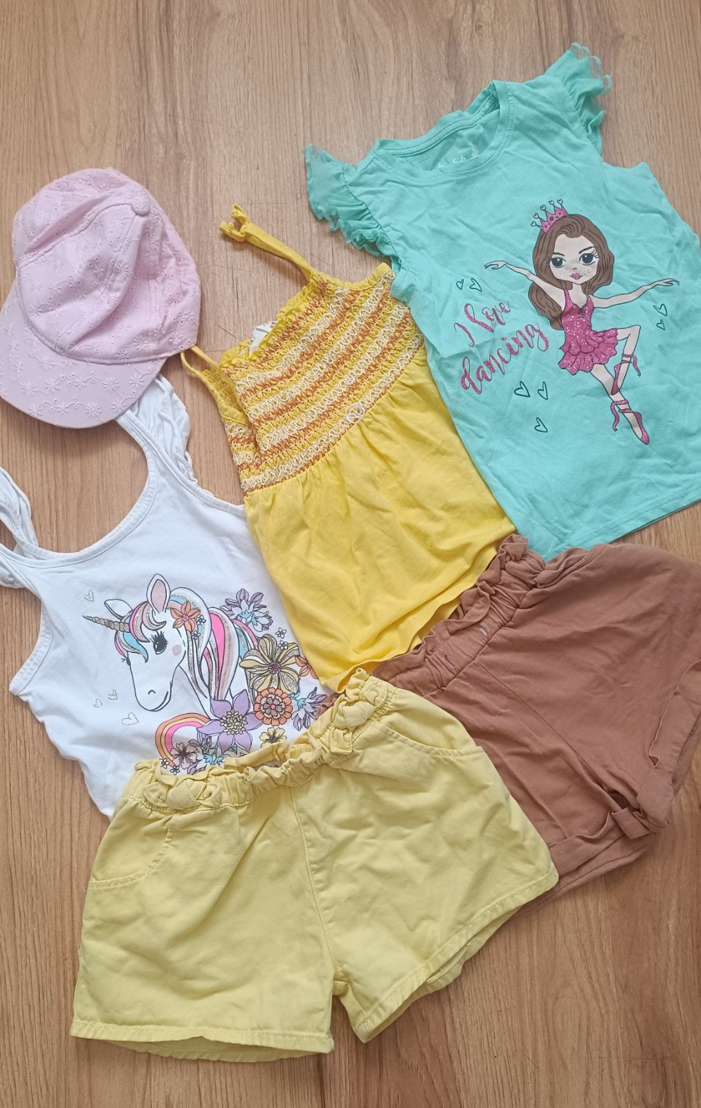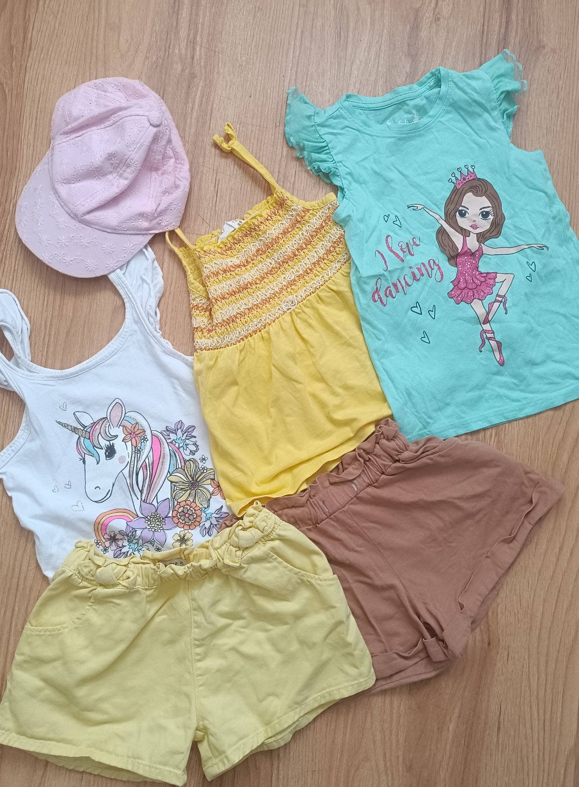 Tielka nové c&a obe , tričko Takko ako nové , kráse žlté f&f pár krát oblečené 116 , hnedé kraťasy pepco 116 malo nosené , šiltovka ružová