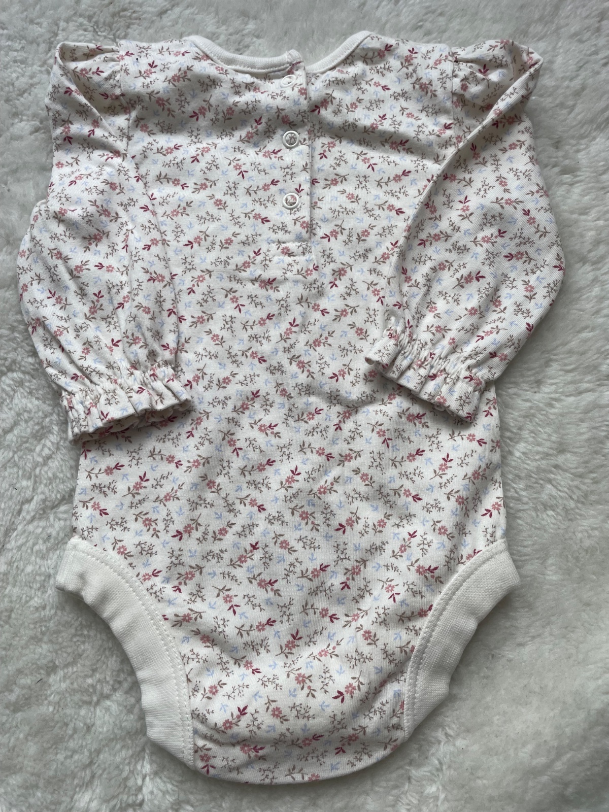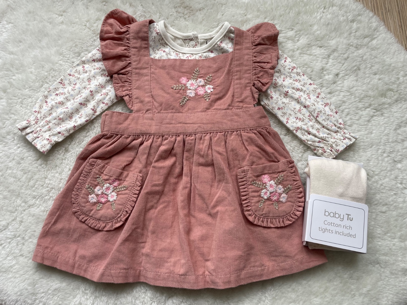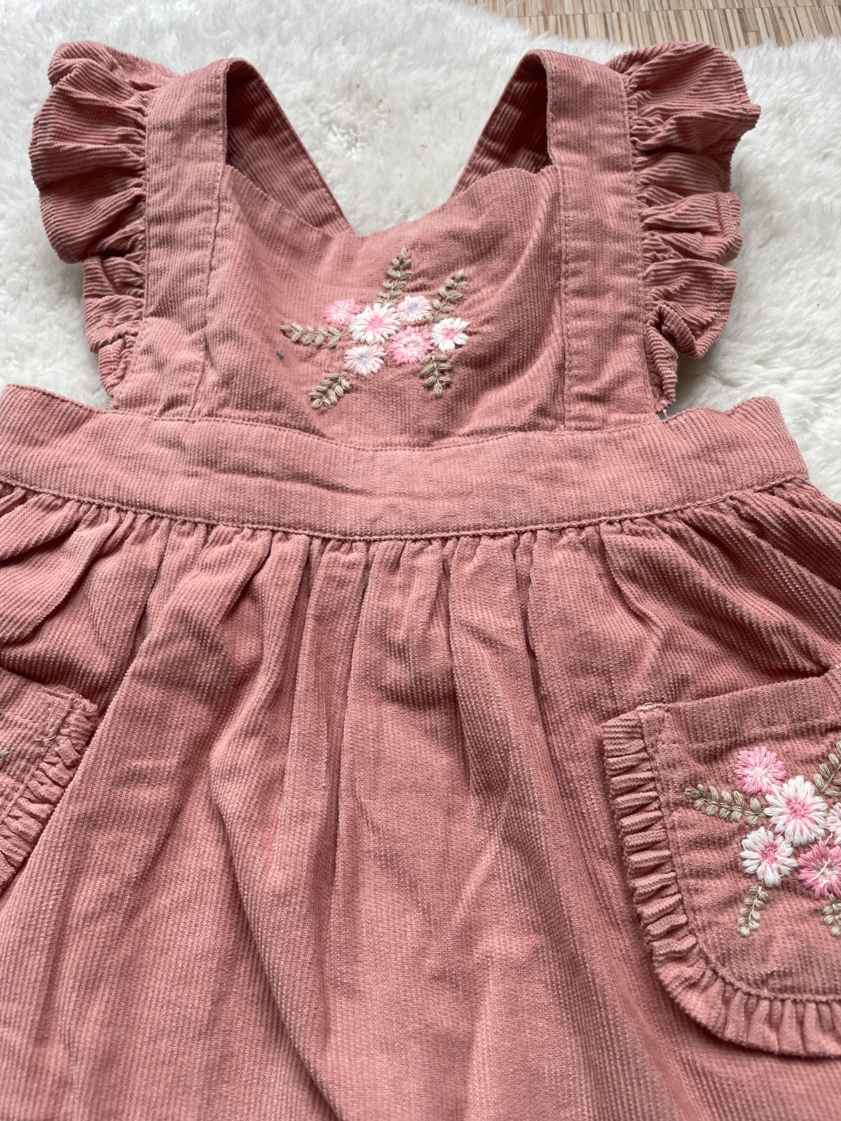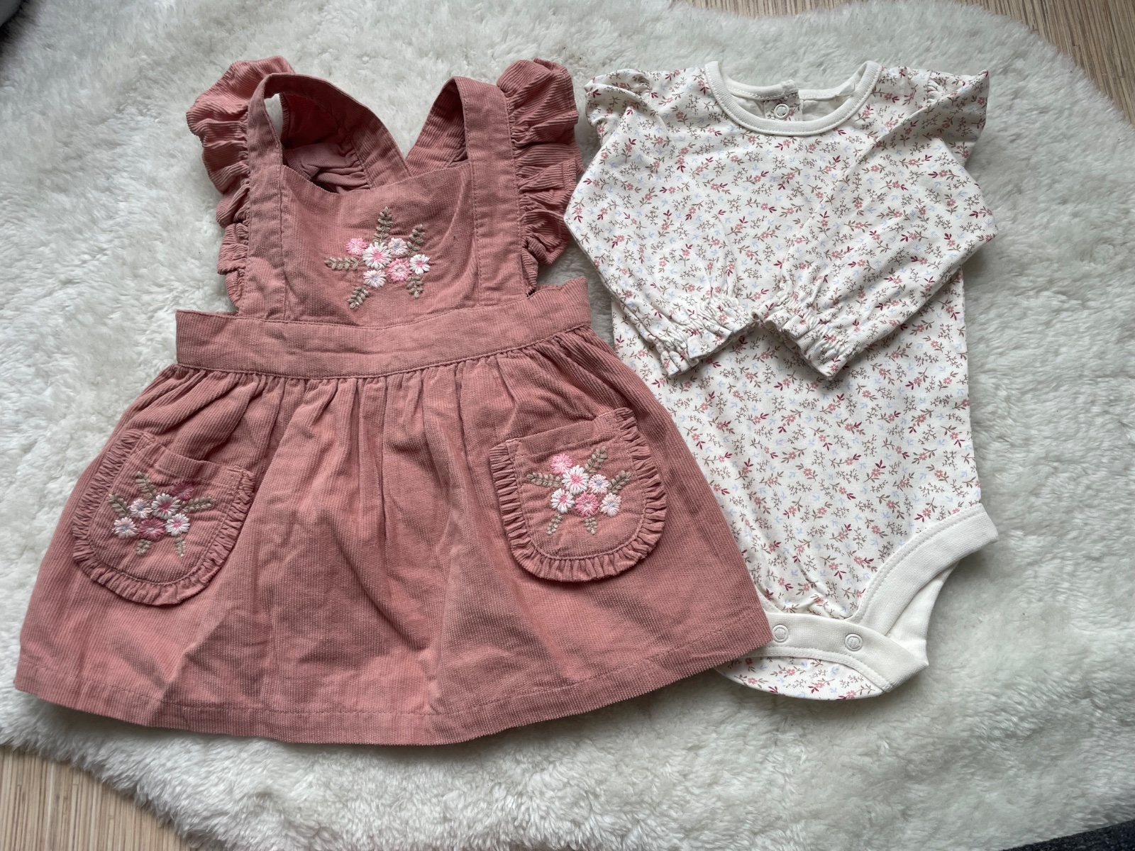Bavlnena 3 ks suprava kvetovaneho bavlneneho bodynka, vzadu zapinanie na cvocky, rukavy su ukoncene gumickou, suknicka s vysivkou kvetov na prednych vreckach, zadna cast na gumu, traky volanove a nastavitelne gombickom, sucastou su kremove pancusky, bezchybne