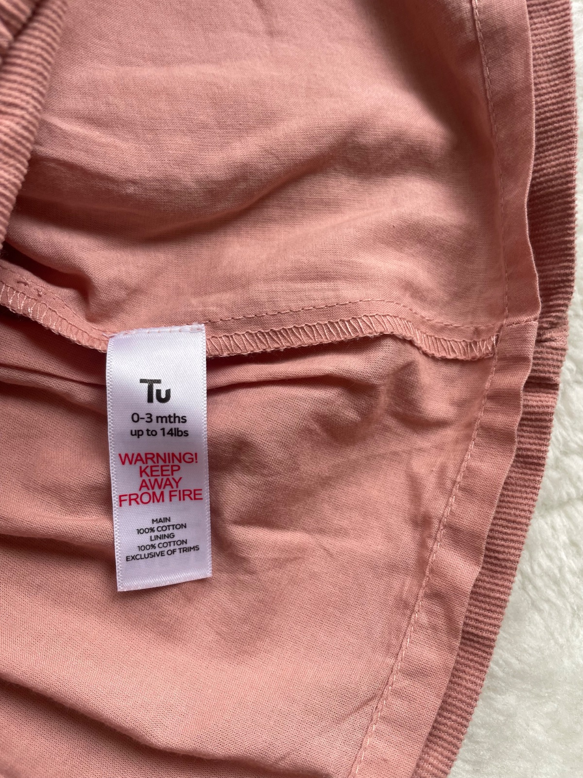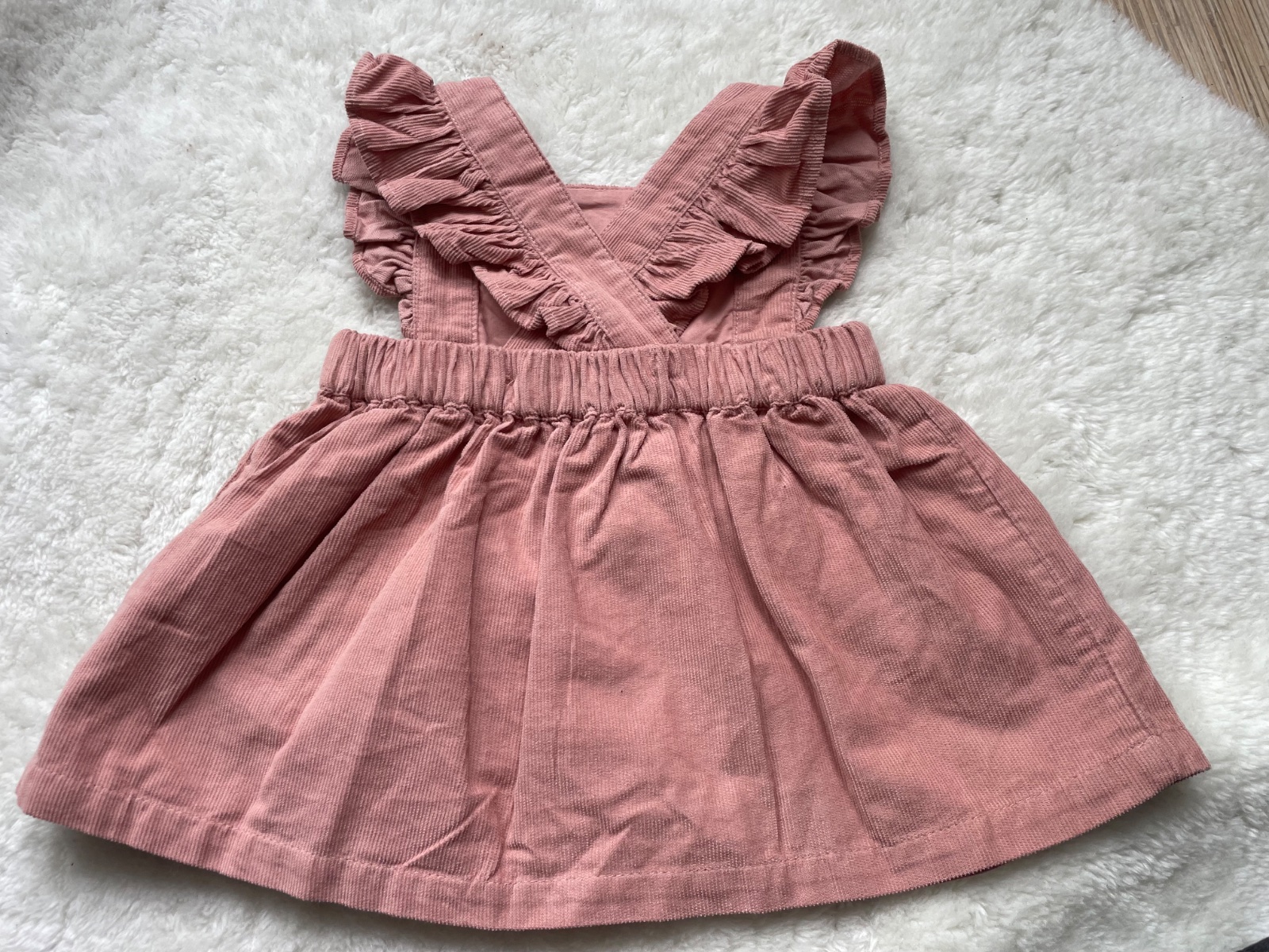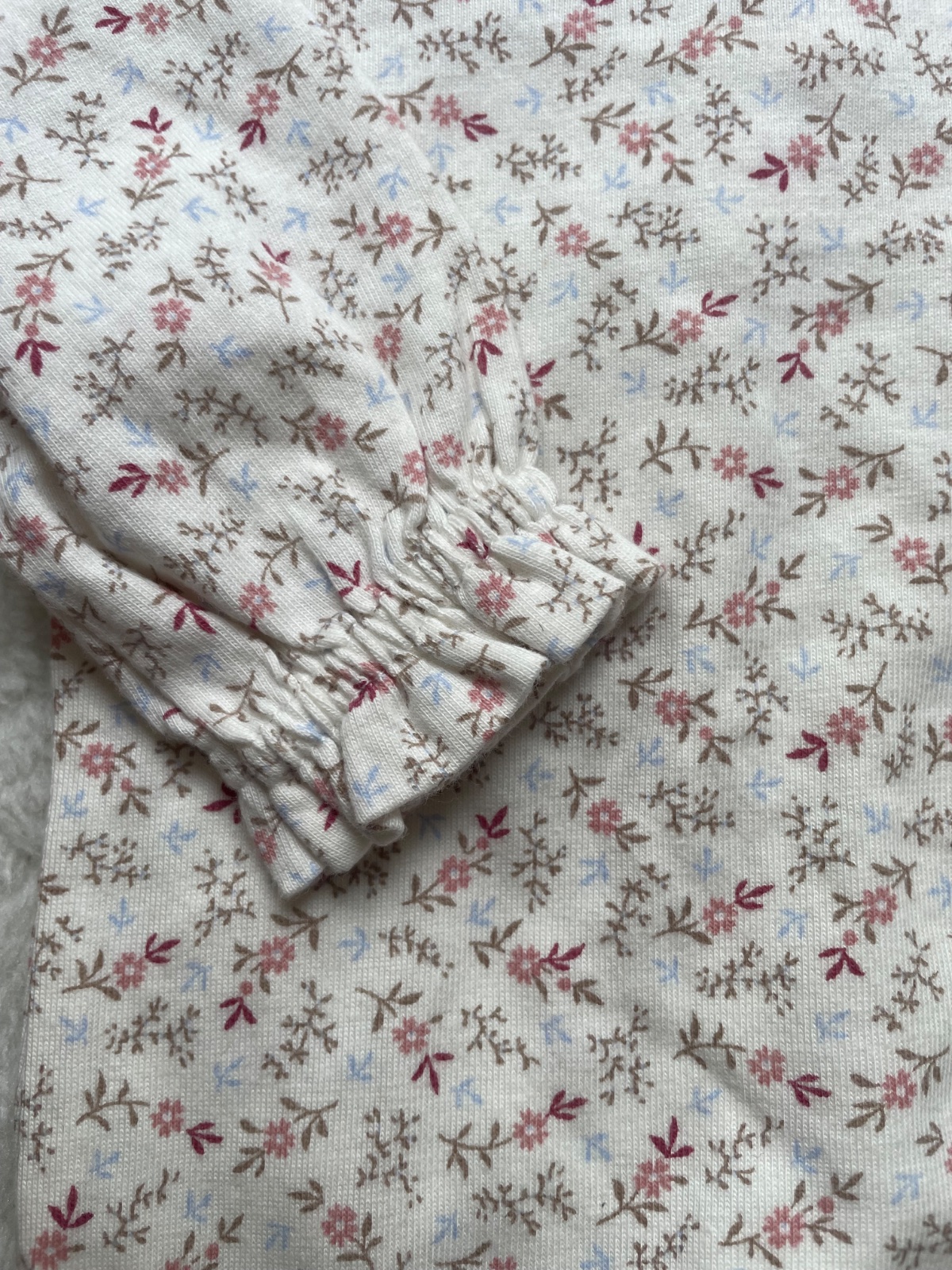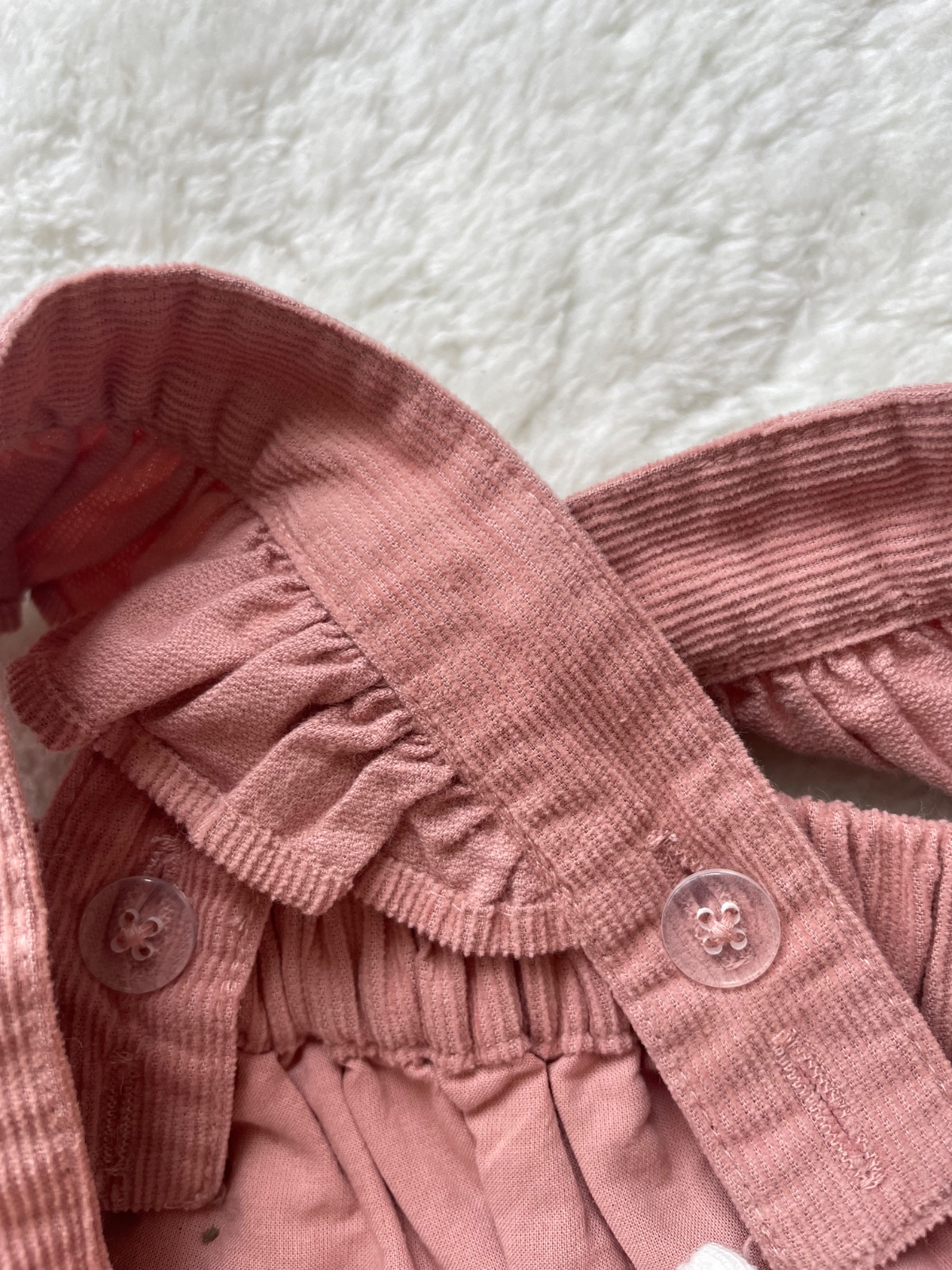 Bavlnena 3 ks suprava kvetovaneho bavlneneho bodynka, vzadu zapinanie na cvocky, rukavy su ukoncene gumickou, suknicka s vysivkou kvetov na prednych vreckach, zadna cast na gumu, traky volanove a nastavitelne gombickom, sucastou su kremove pancusky, bezchybne