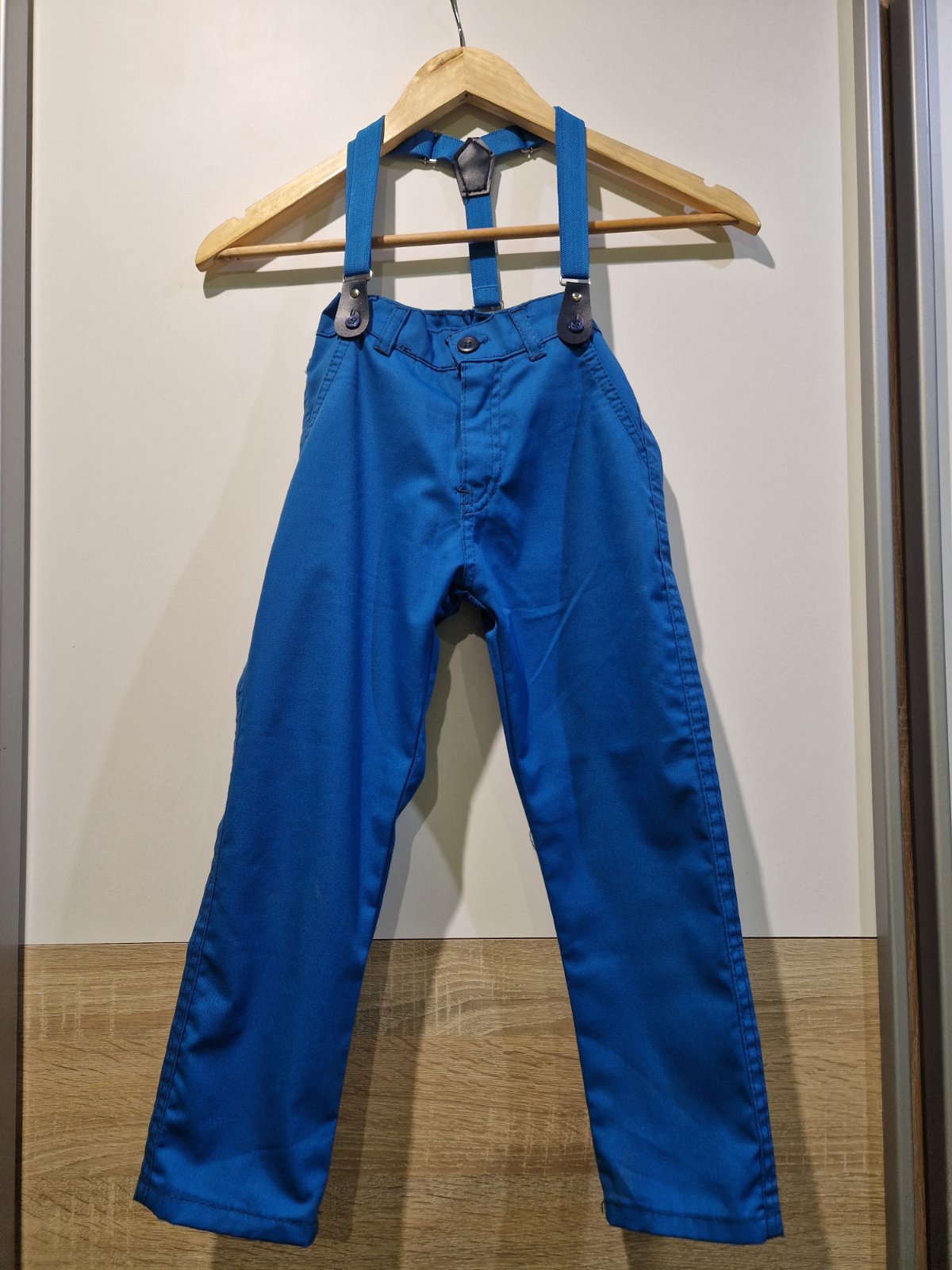 Predam 1 krát vzaty chlapčenský komplet po mojom synčekovi mal ho na sebe minuly rok len keď nastupoval do 1.ročníka aj to len 20 minút.Oblek obsahuje motylika,košeľu a nohavice s trakmi .Nohavice z vnútra maju po bokoch gumičky s gombíkmi a daju sa stiahnuť v páse na koľko mam chuduckeho synčeka tak nám to veľmi pomohlo.Veľkosť kompletu je na 6 rokov a vtedy mal 116 veľkosť.Nepremeriavam.Komplet bol kupovaný riadne v obchode.