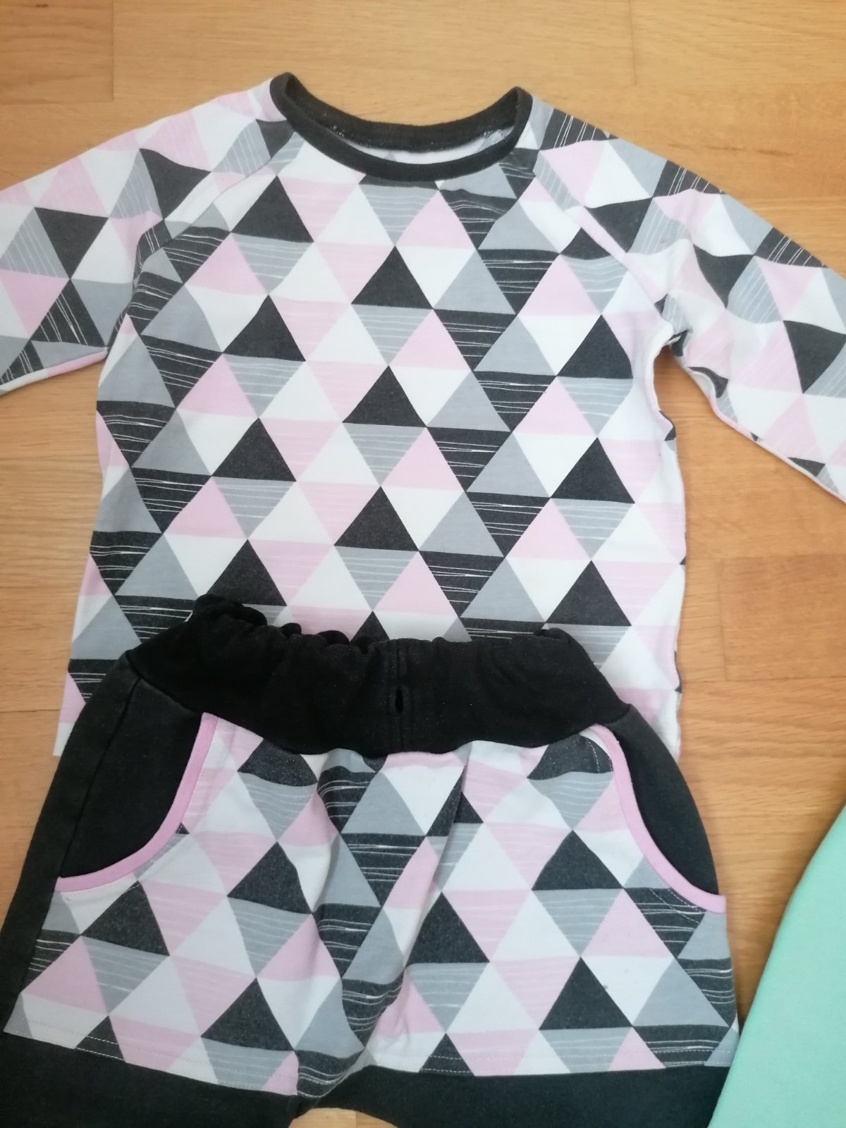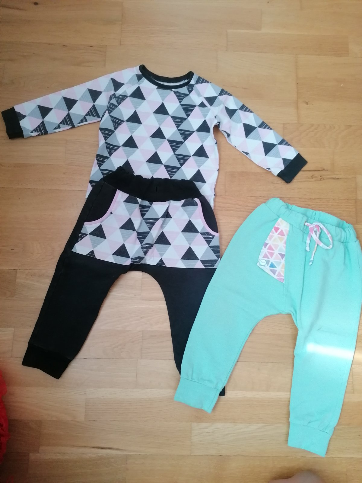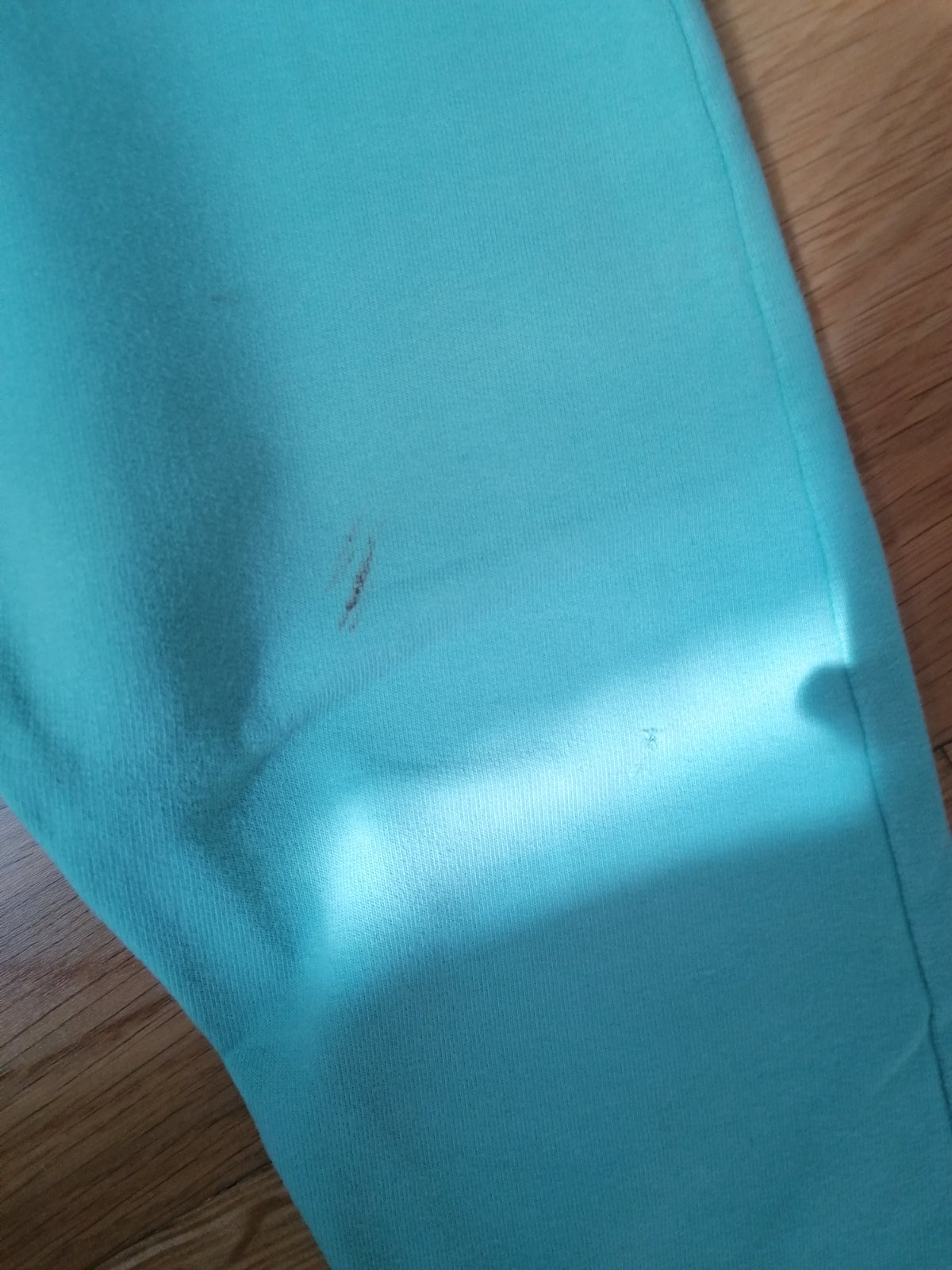 Súprava je nosená, ale ešte poslúži, už je na nej vidieť pranie a chýba šnúrka na nohaviciach (nemala žiadnu funkciu), nemá žiadne dierky. Zelené tepláky sú k nej zdarma, majú na kolienku fliačik, ktorý sa nedá vyprať, inak bez poškodení
