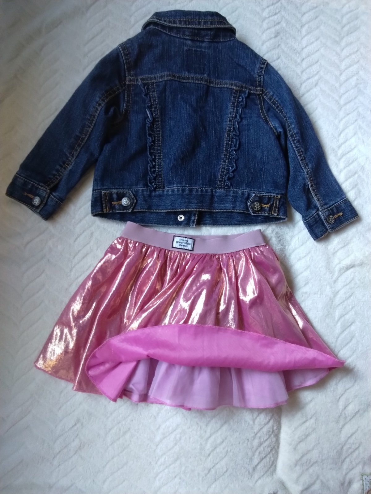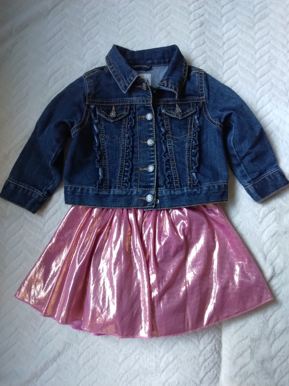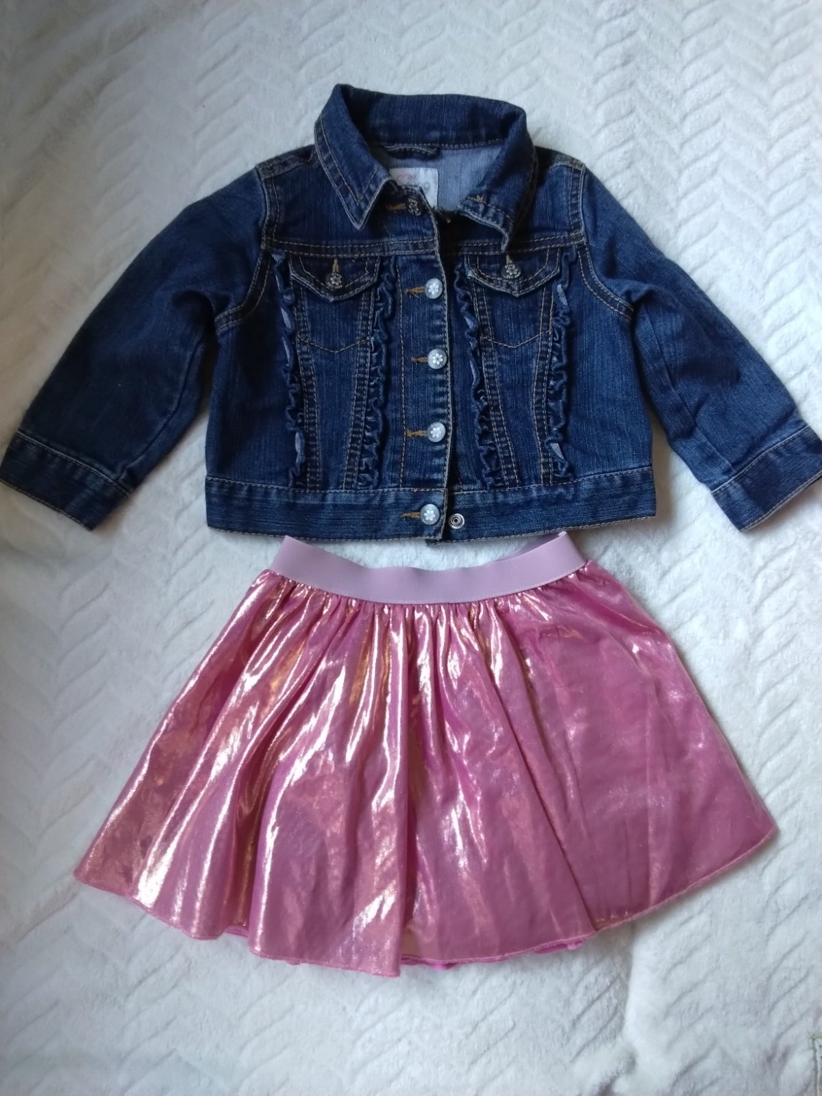 Málo nosené,riflová bunda veľkosť 18 mes. dĺžka od ramena 30 cm, dĺžka rukáva od ramena 29 cm, sukňa ružová lesklá,OP22cm×2, dĺžka 25 cm značka OVKS.