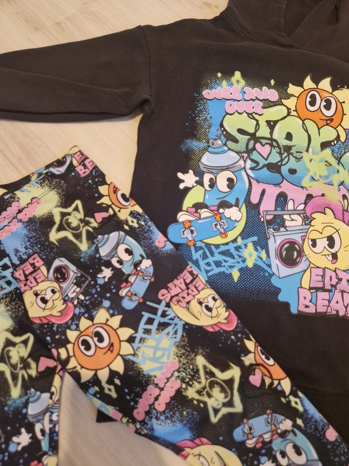 Paradna teplakova suprava pre paradnice, s grafitovym dizajnom, mikinka cez hlavu, 2 vrecka, vnutri cesany vlas, teplaky do gumy, aj na snurku, top stav, bez poskodeni Farba syta cierna