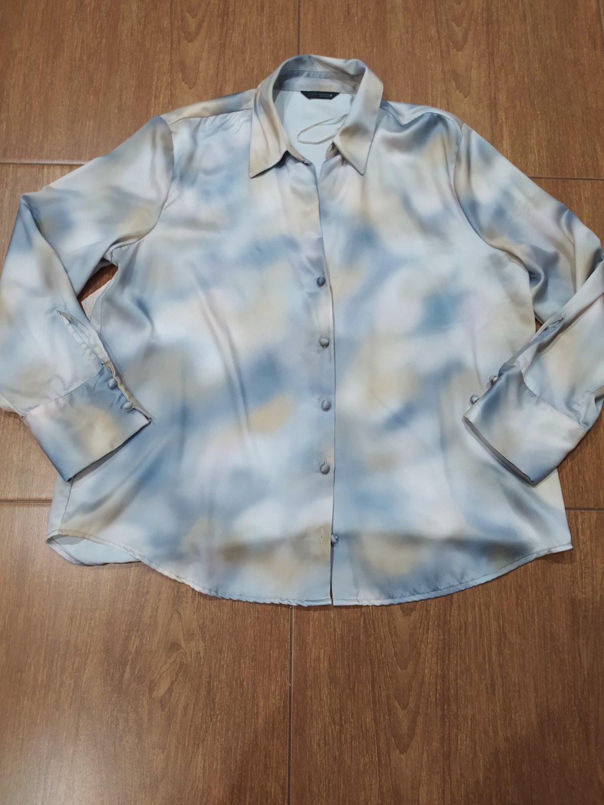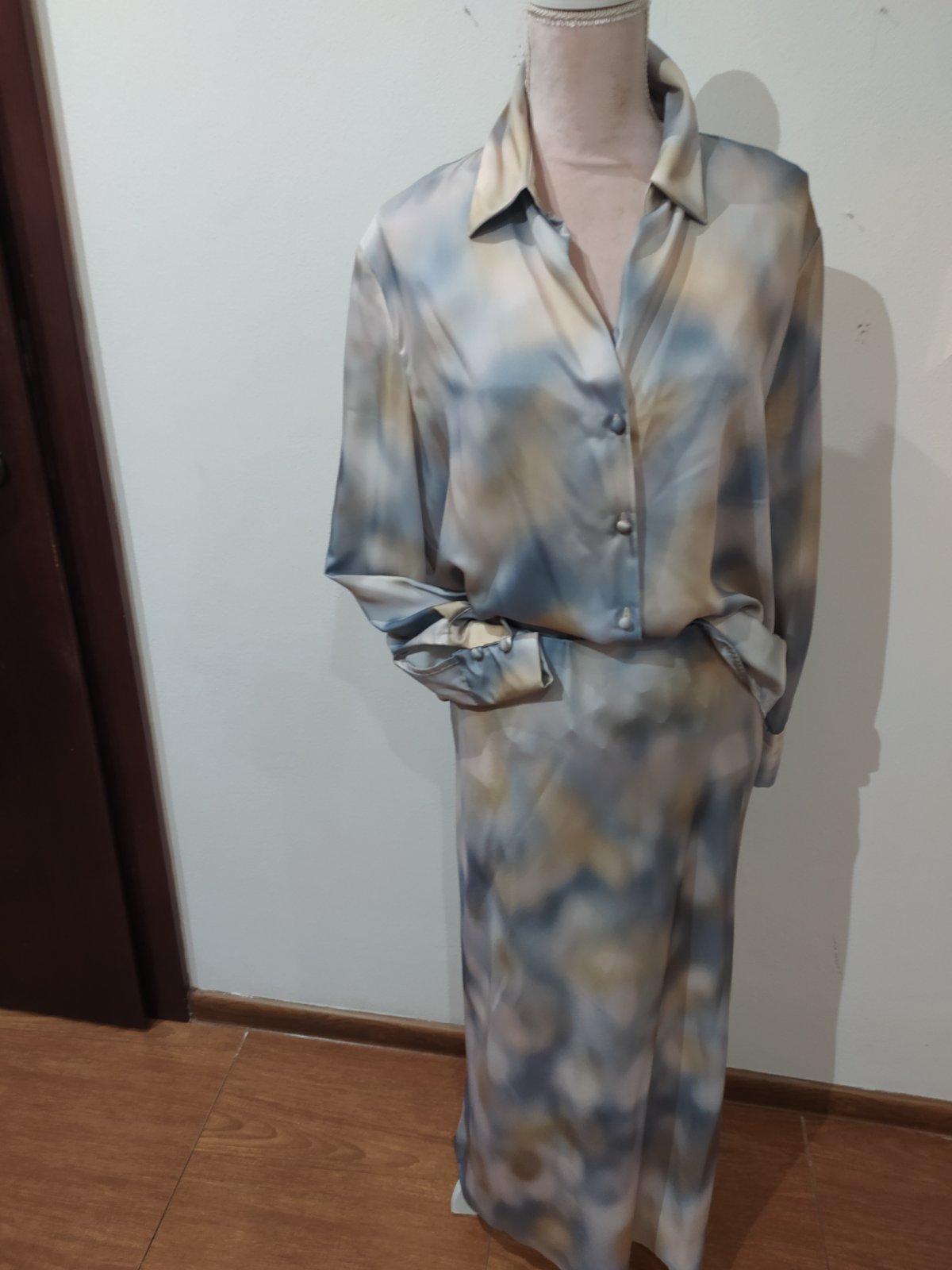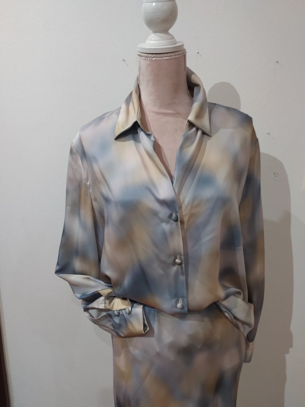 Krásny batikovaný satenovy komplet košeľa + sukna.