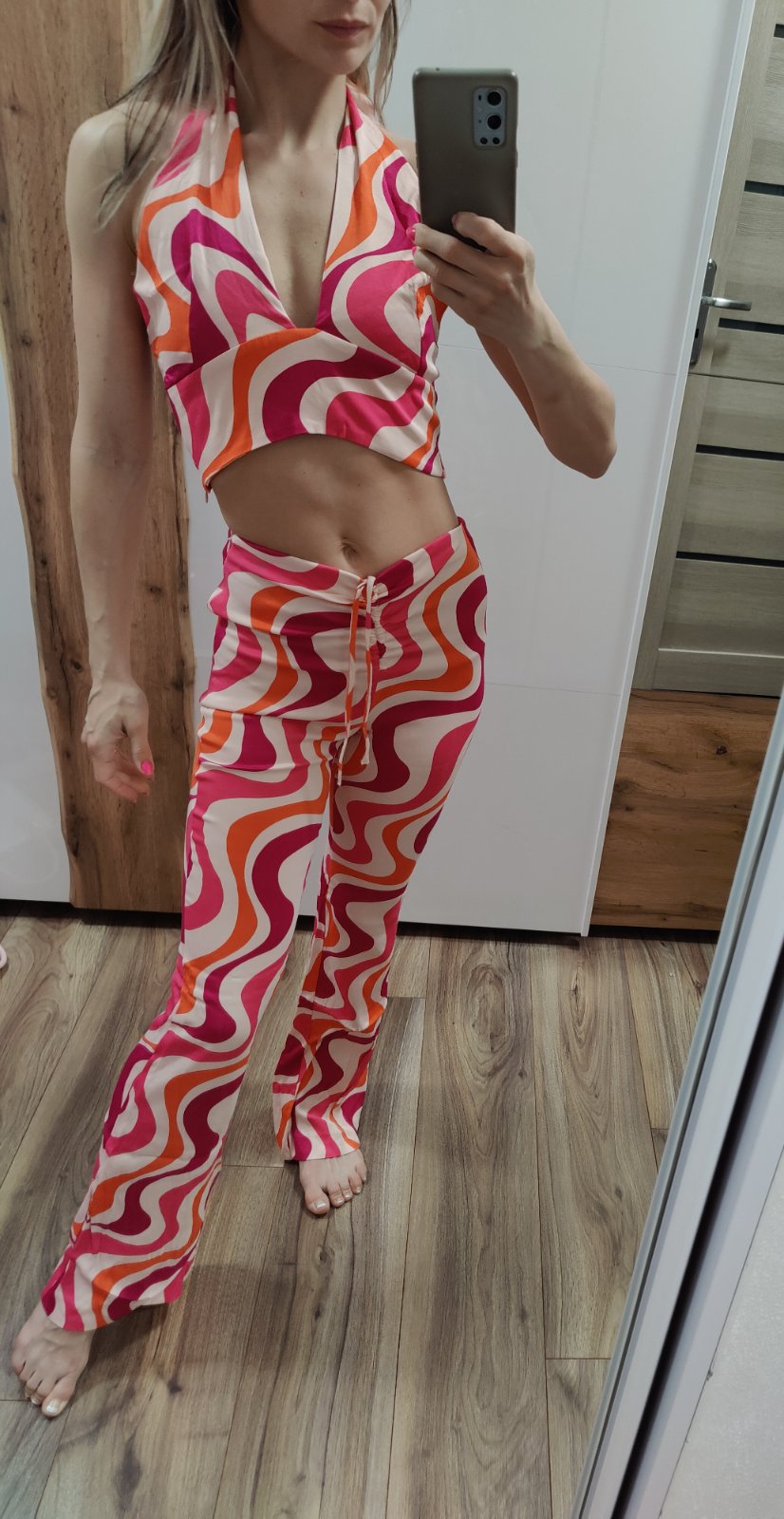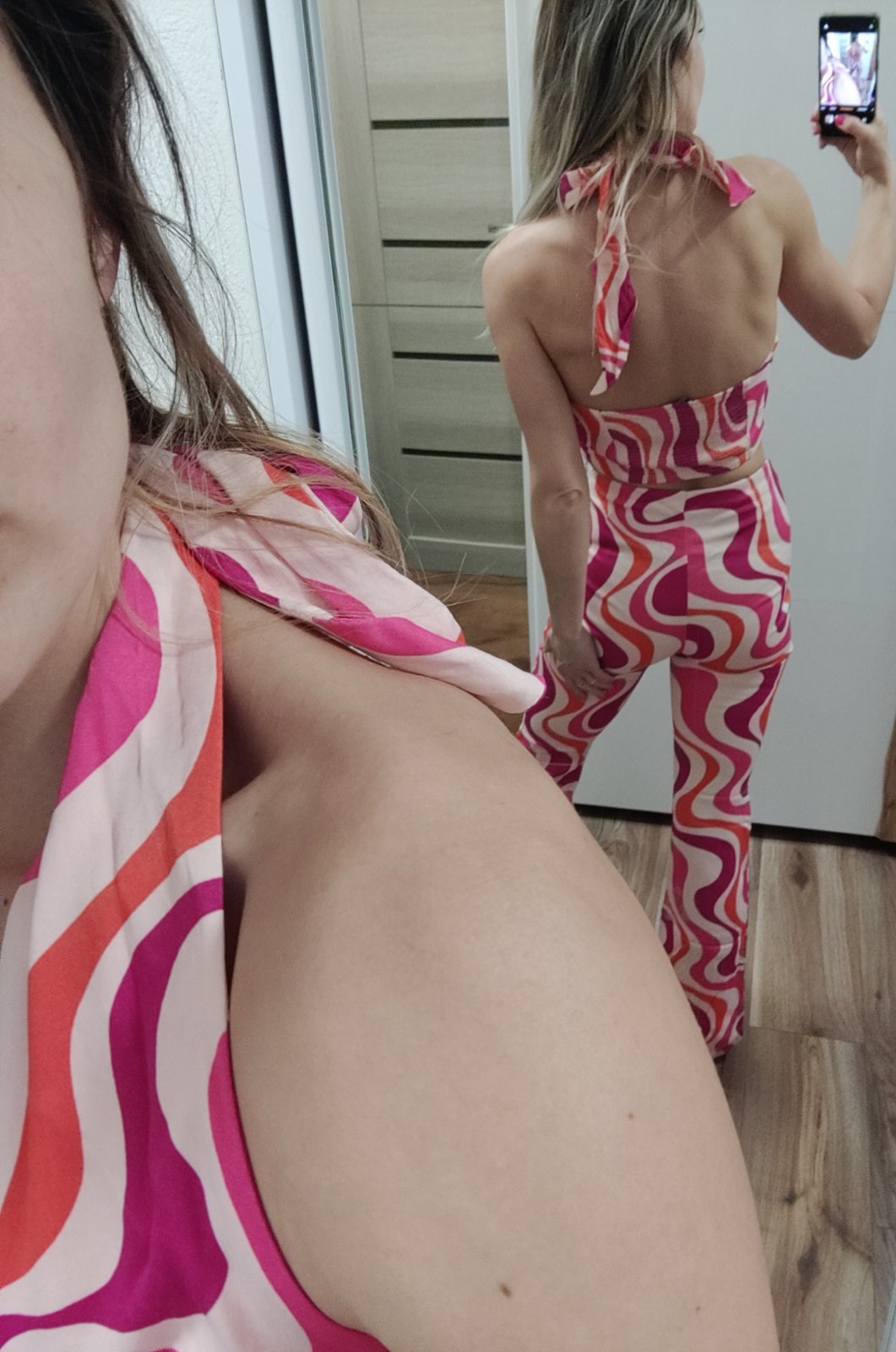 Top veľkosť S dĺžka prispôsobiva, zapínanie okolo krku a na boku zips, šírka v páse 32x2 vzadu je guma niečo povolí