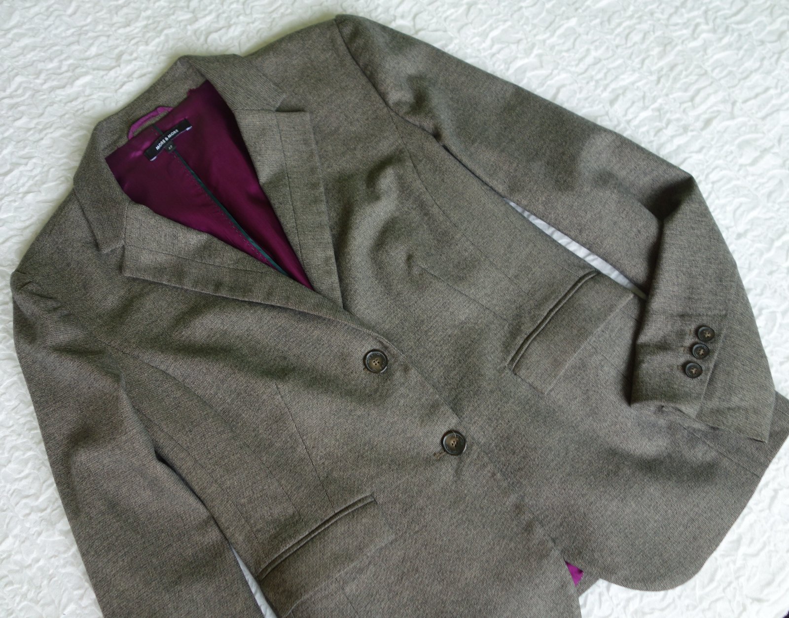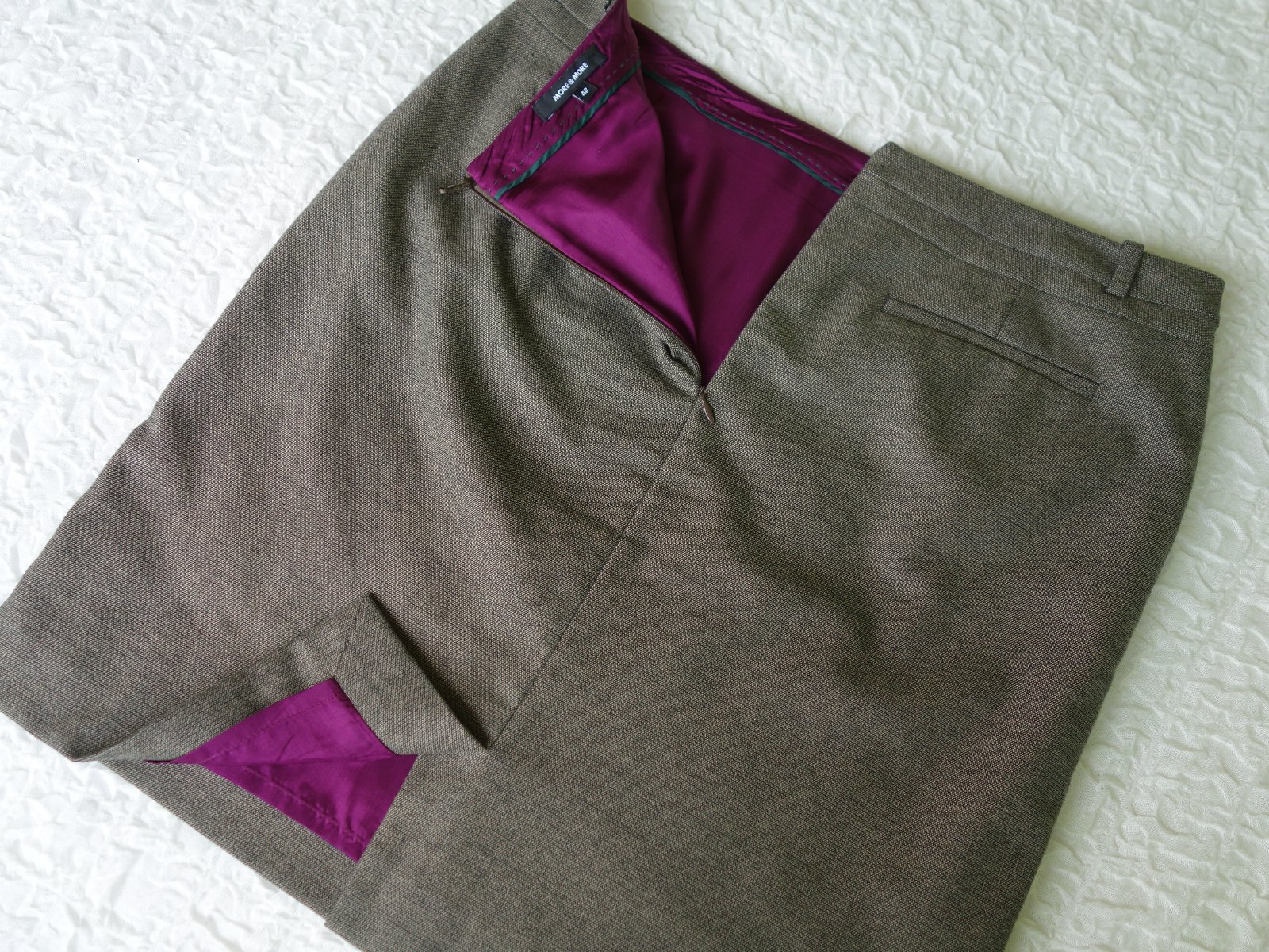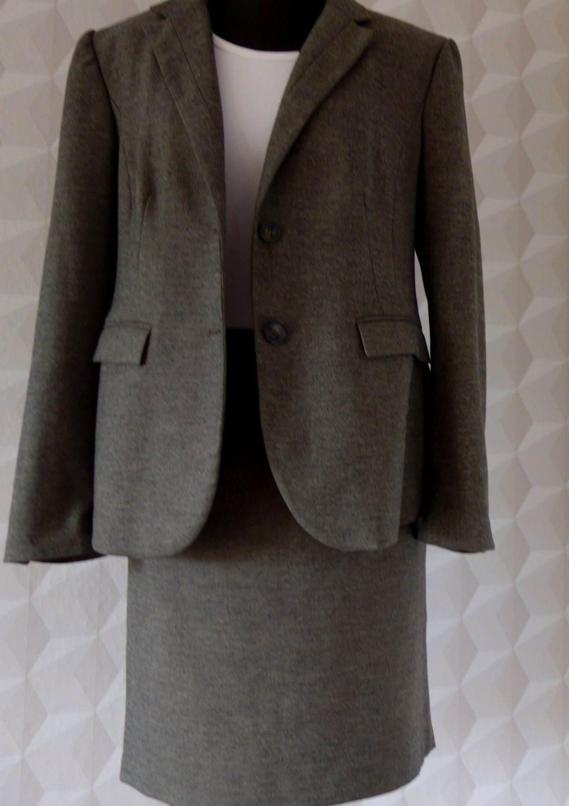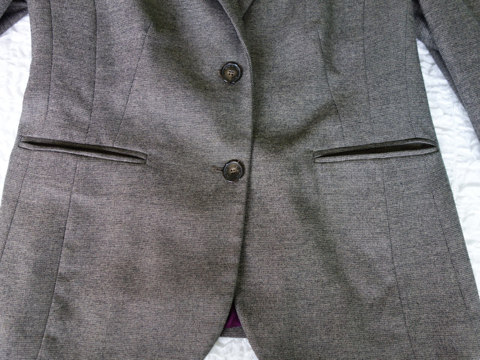 Kostýmček je kvalitný, nekrčivá látka, sukňa aj blazer podšité kontrastnou fialovou podšívkou. Vrchná látka nie je hrubá, príjemná - padavá.