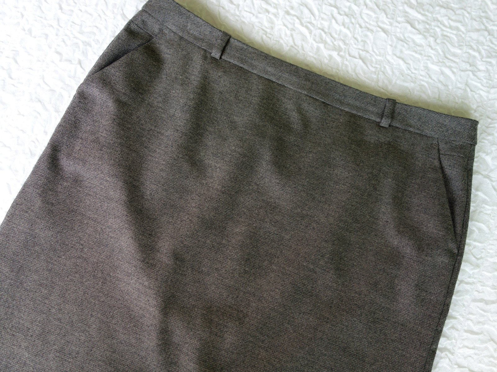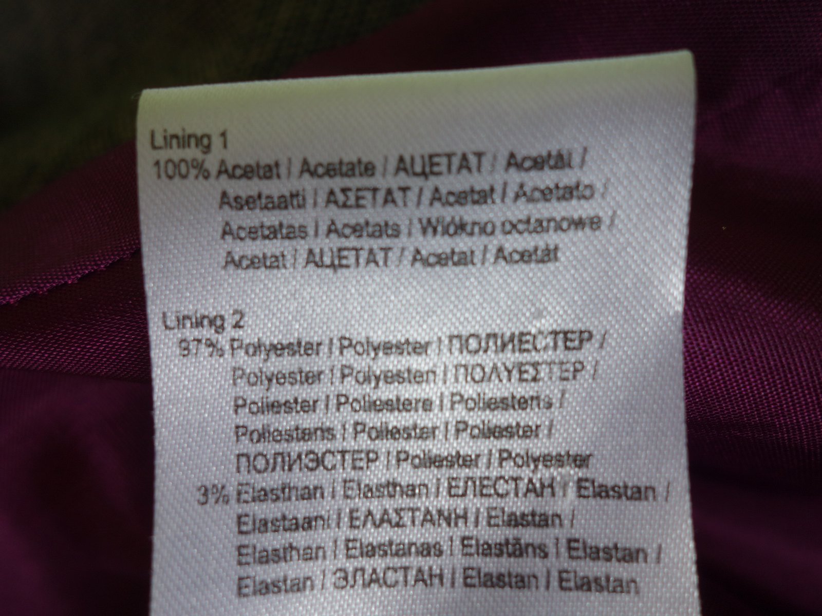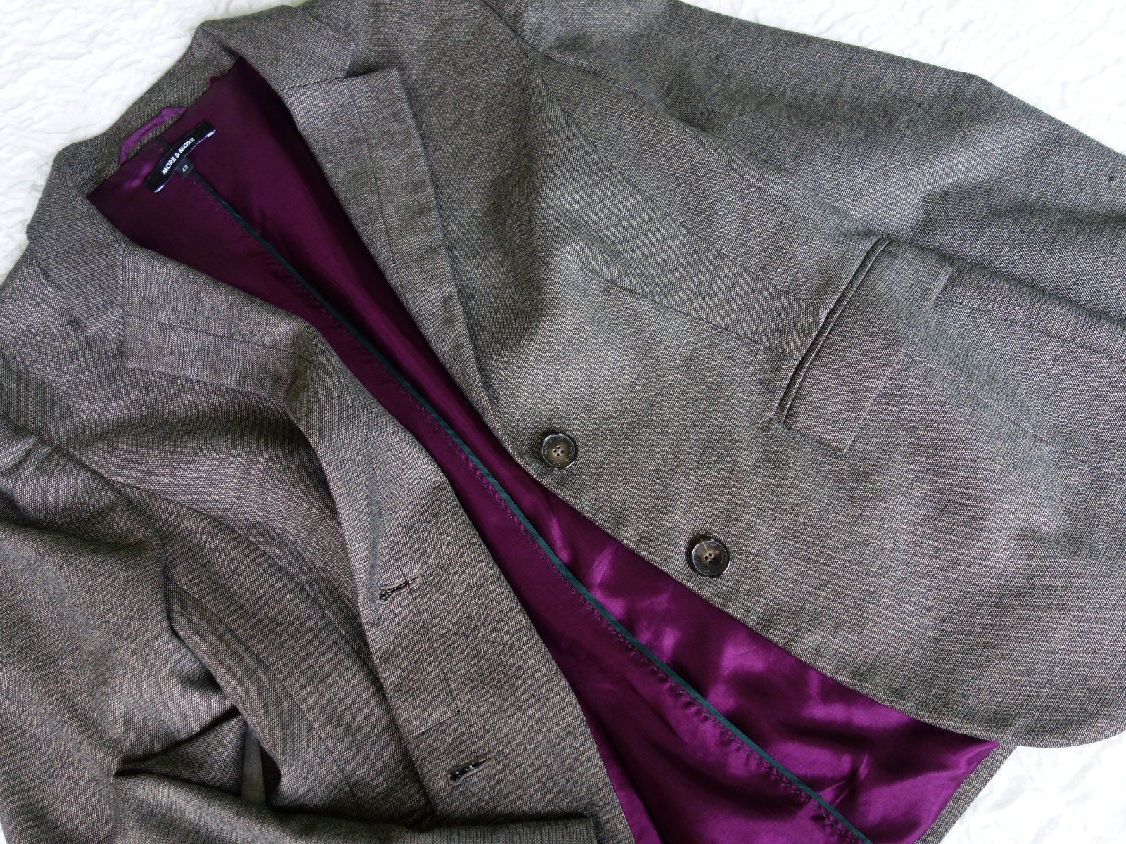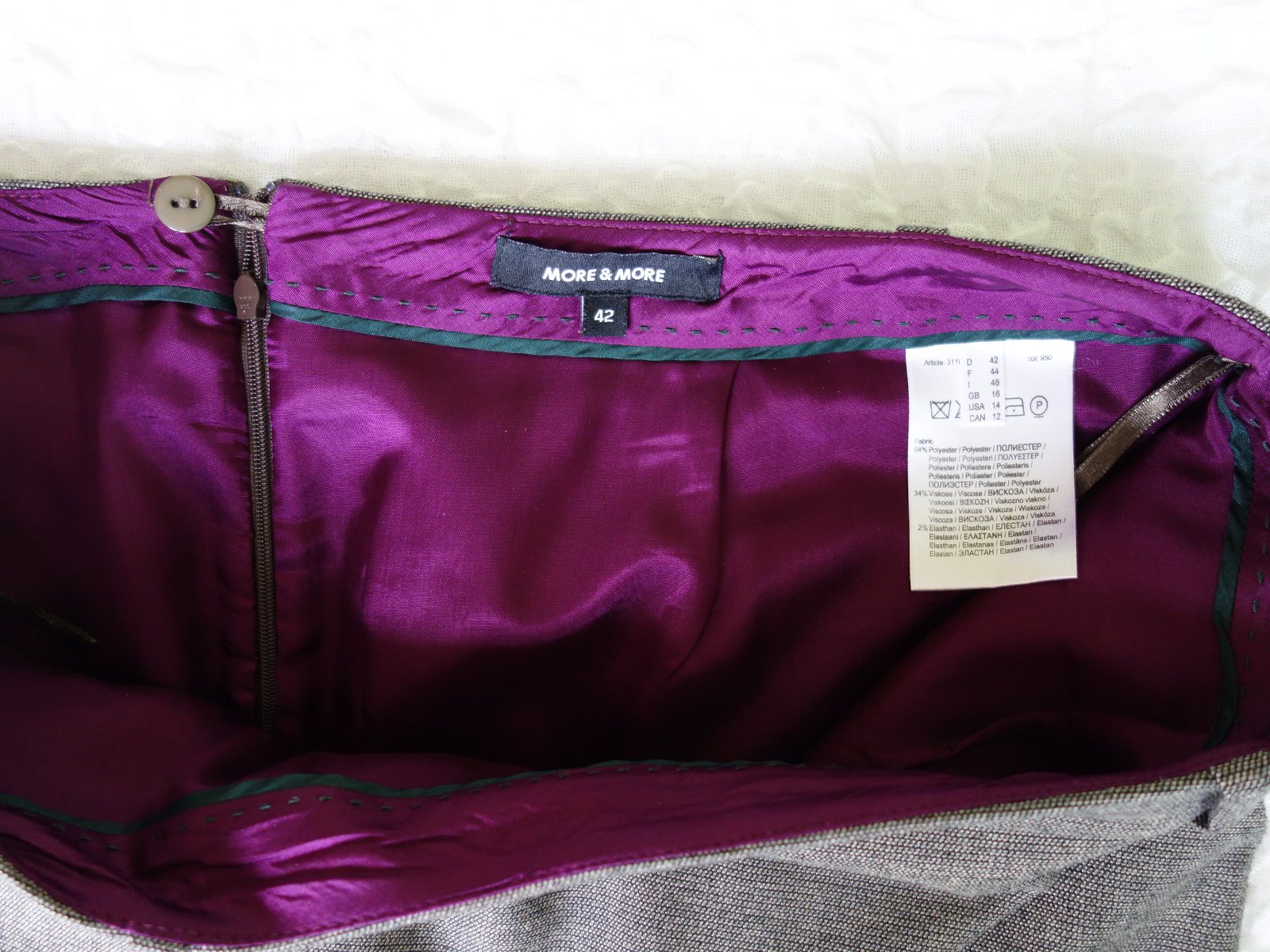 Kostýmček je kvalitný, nekrčivá látka, sukňa aj blazer podšité kontrastnou fialovou podšívkou. Vrchná látka nie je hrubá, príjemná - padavá.