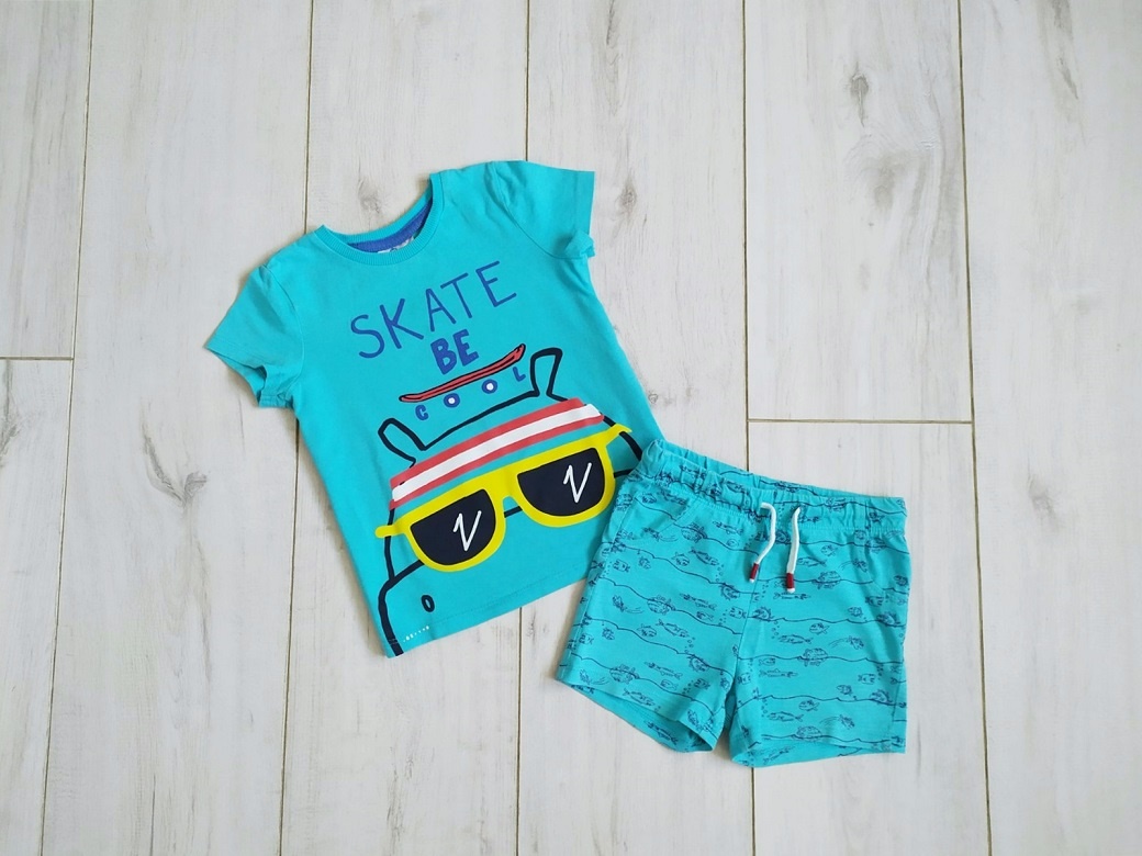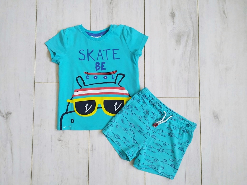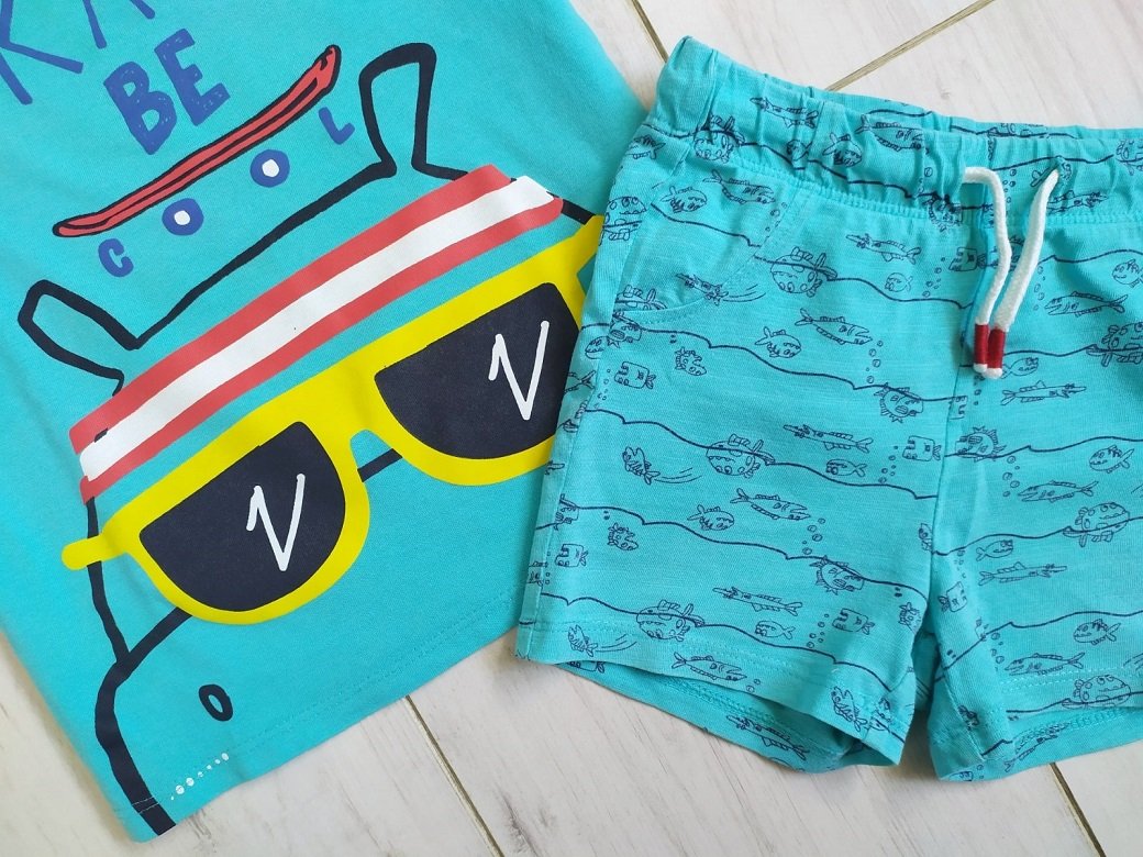 Ponúkam tento chlapčenský kompletík krásnej tyrkysovej farby s letným motívom, v perfektnom stave ako nový, veľkosť trička 92, veľkosť kraťasov 80, ale veľkostne pasuje tričko aj kraťase na 86.