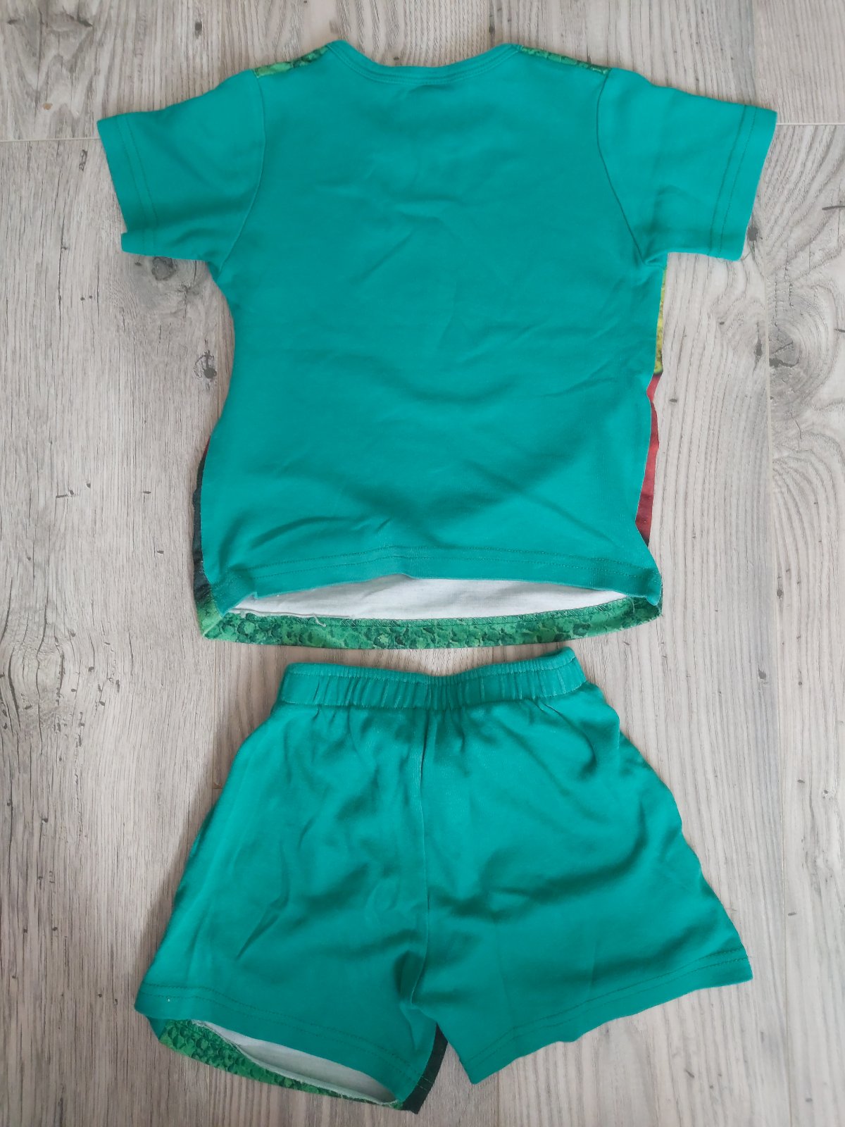 Farby pekné, vpredu na tričku maličké žmolky, spodok jednej nohavice má kúsok vypáraný, vid.foto, ináč v dobrom stave. Veľkosť písaná 98/104. Materiál bavlna. Kupované v Turecku.