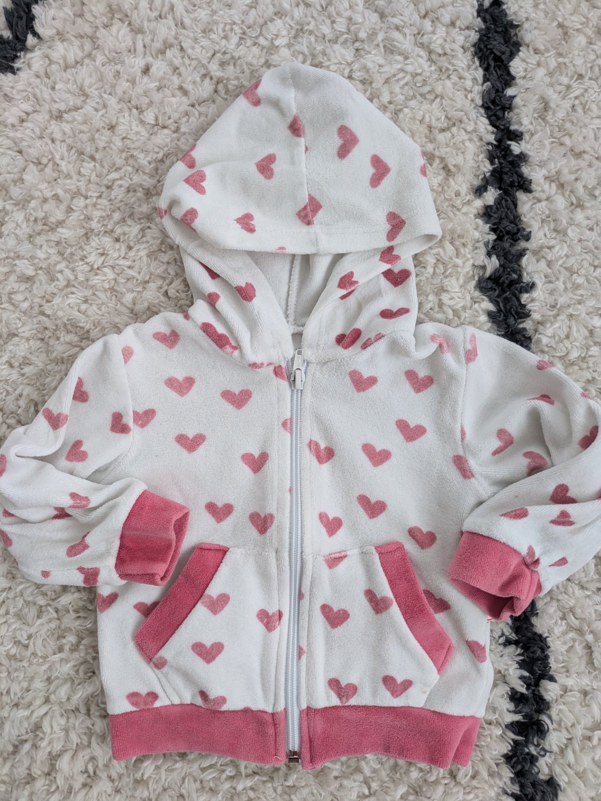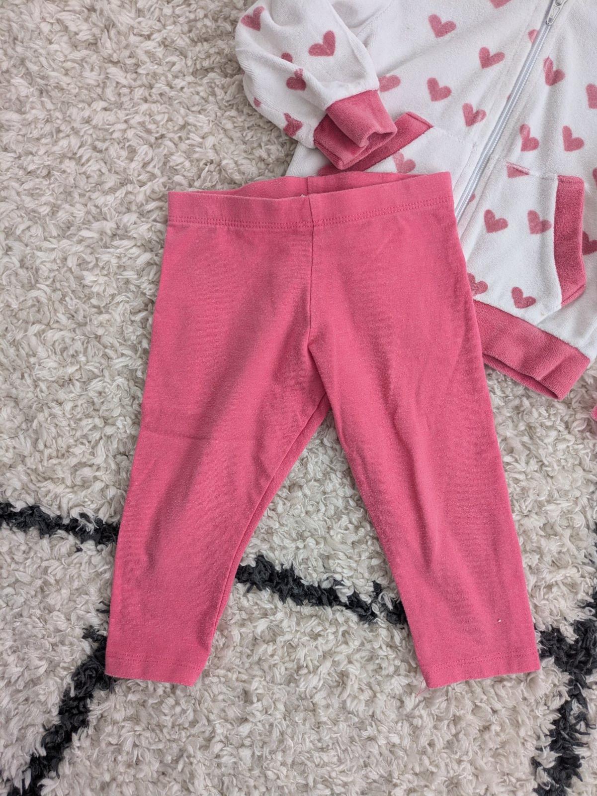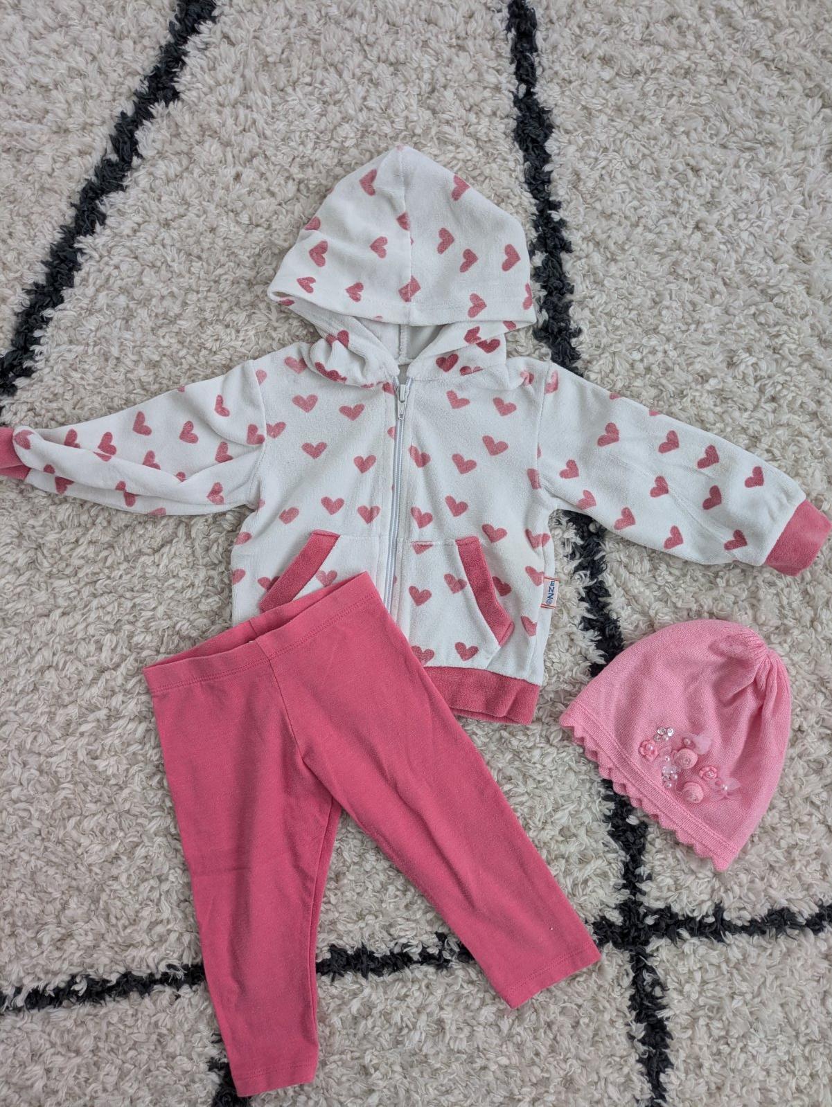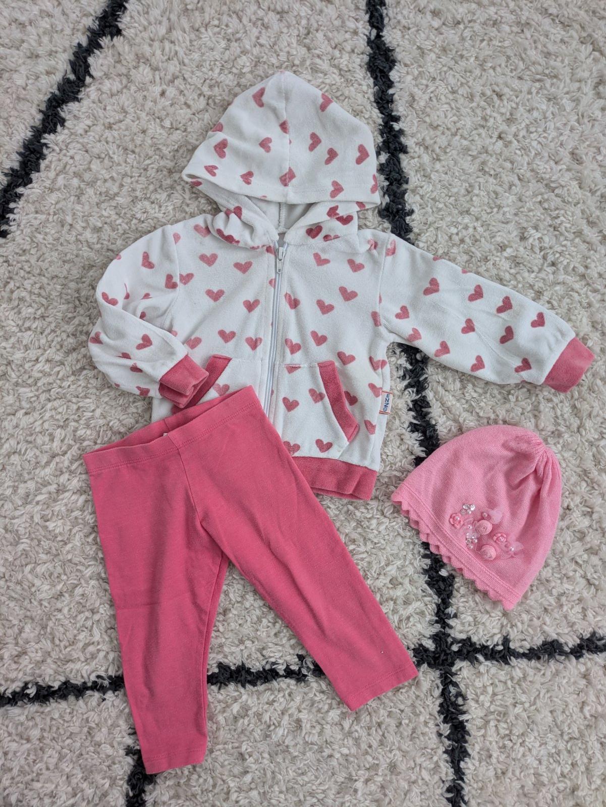 Ružové legínky a mikina so srdiečkami, v dobrom nosenom stave, čiapočka grátis k nákupu