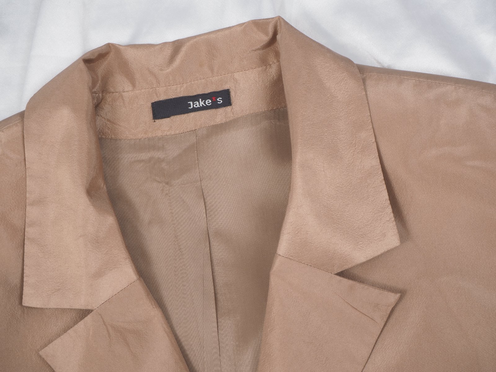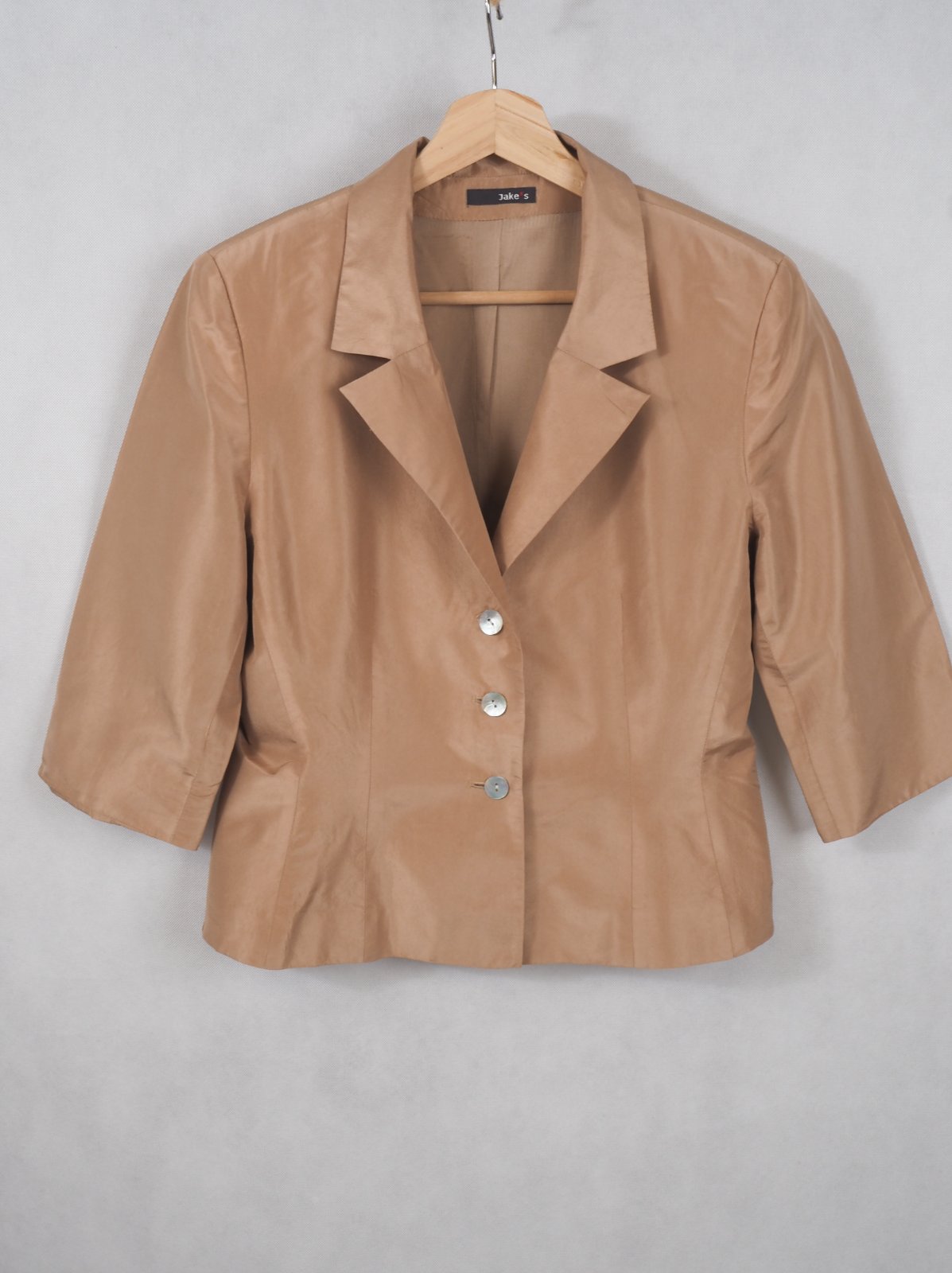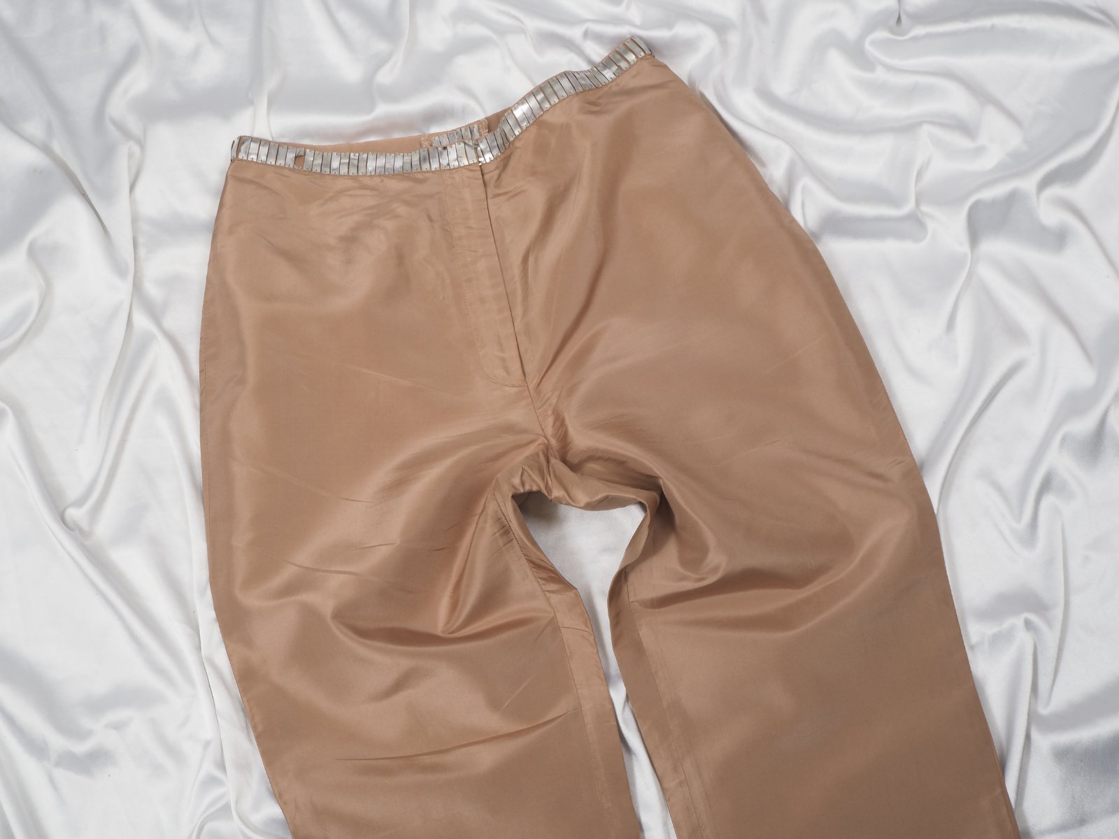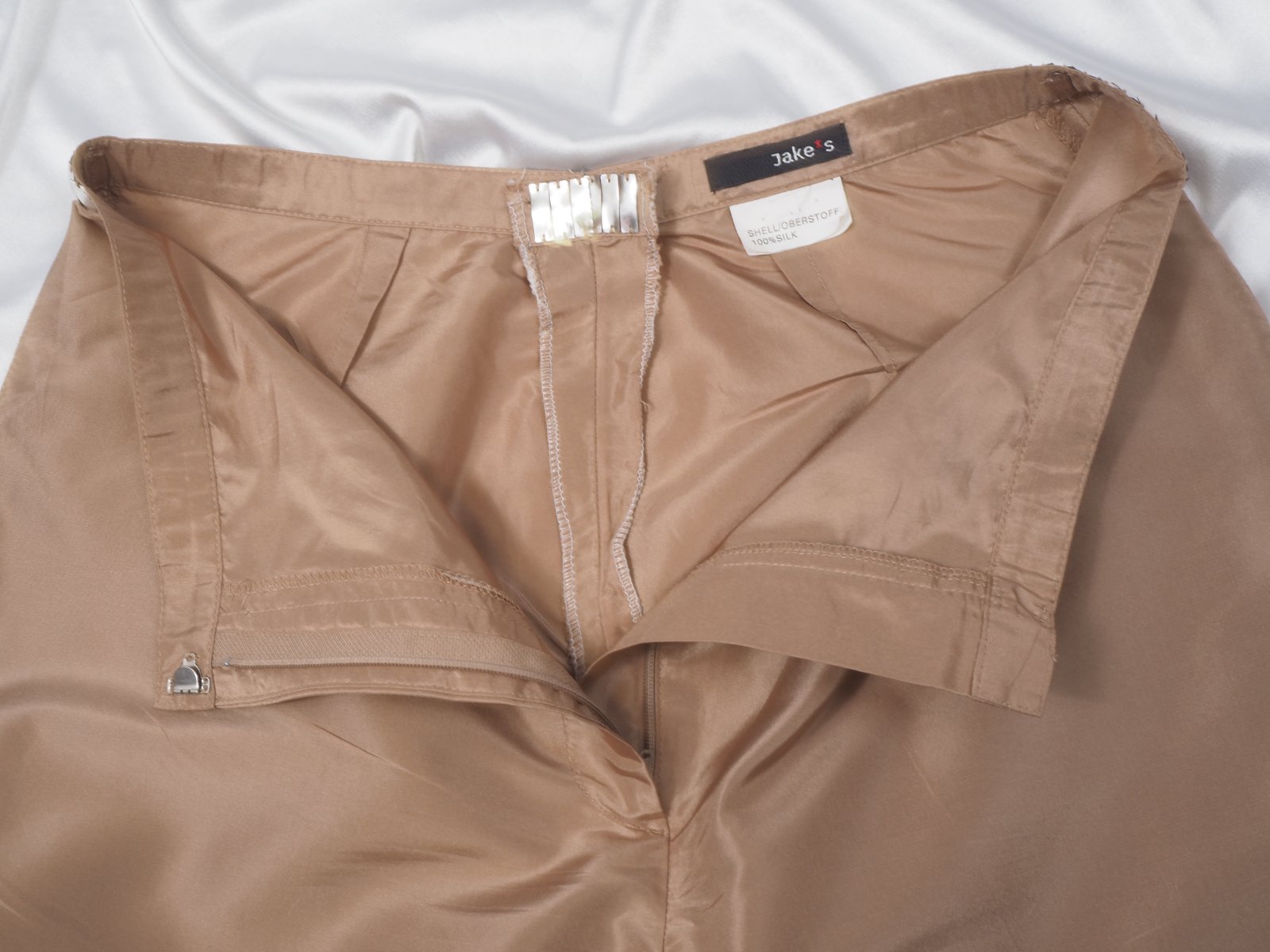 Luxusný hodvábny kostým svetlohnedej farby, s decentným leskom, sačko so zapínaním na perleťové gombíky, bez podšívky, nohavice so zapínaním na zips vpredu, v páse ozdobné pliešky, materiál 100% hodvábny, veľ. 36/38, ako nový.