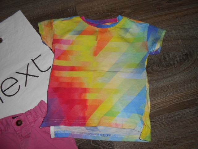 3. NEXT peckový farebný letný komplet vo velkosti 98, v super stave, bez flakov a dier, tričko je dlhé predná čast 37cm a zadna čast 41cm, širka v podpazuší je od 33x2cm do 39x2cm.Nohavice su dlhé 25cm a v páse je širka cca od 22x2cm do 25x2cm. je tam aj stahovacia gumka
